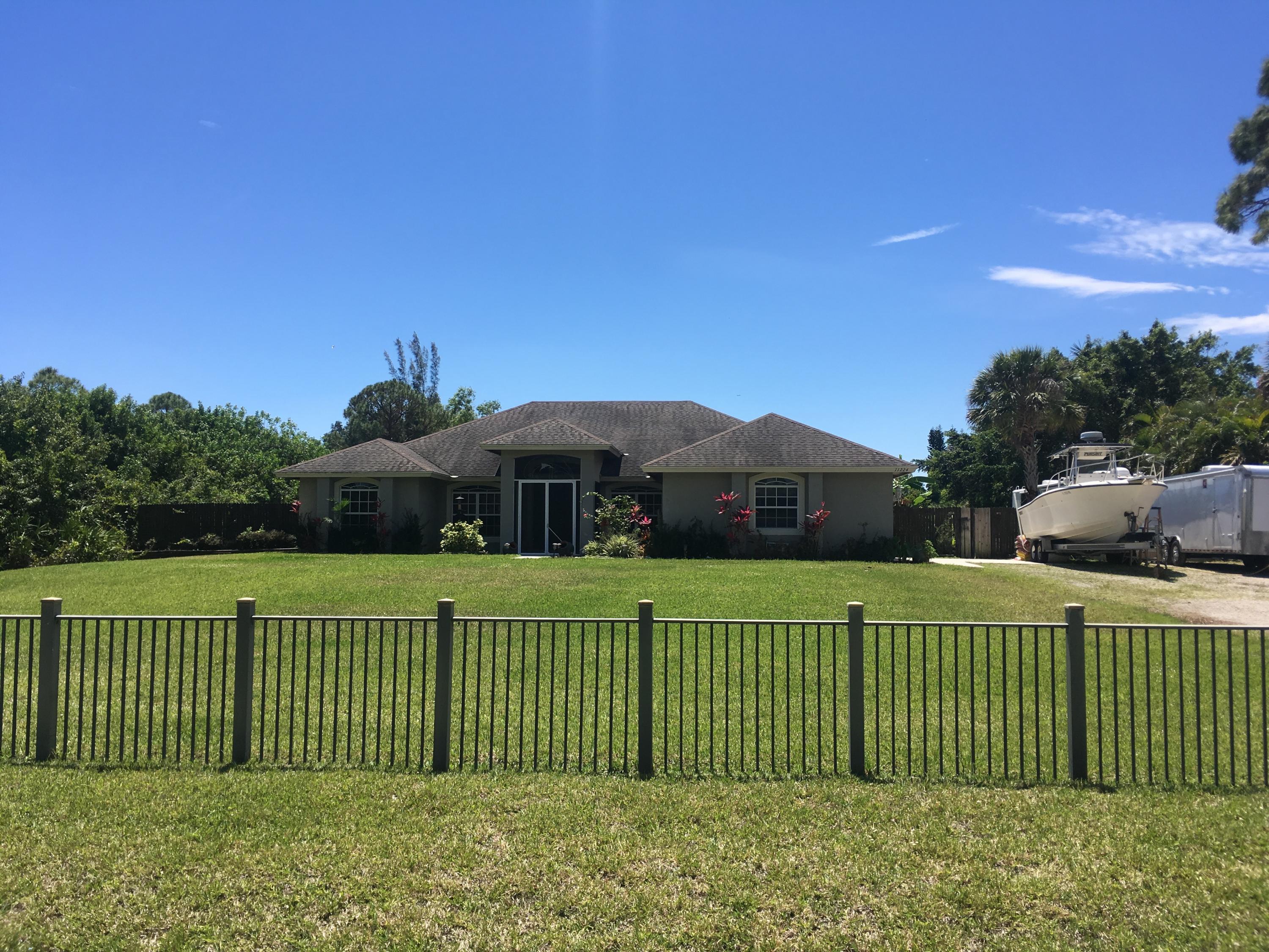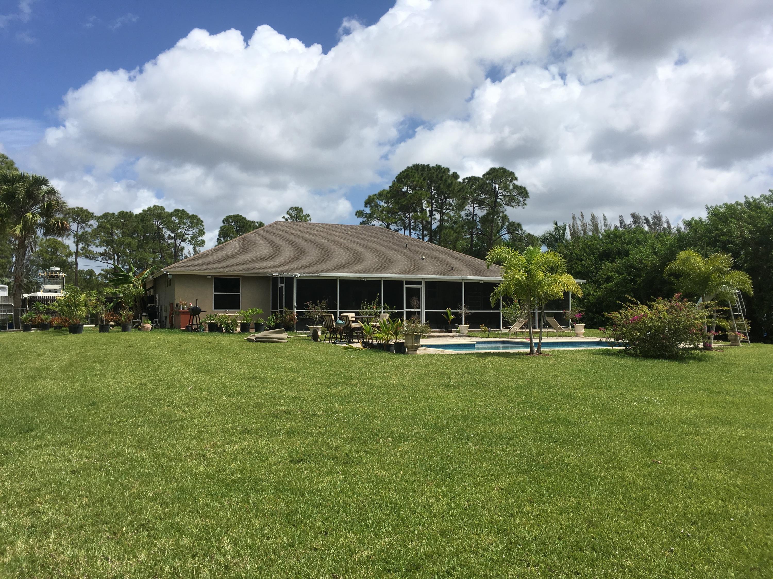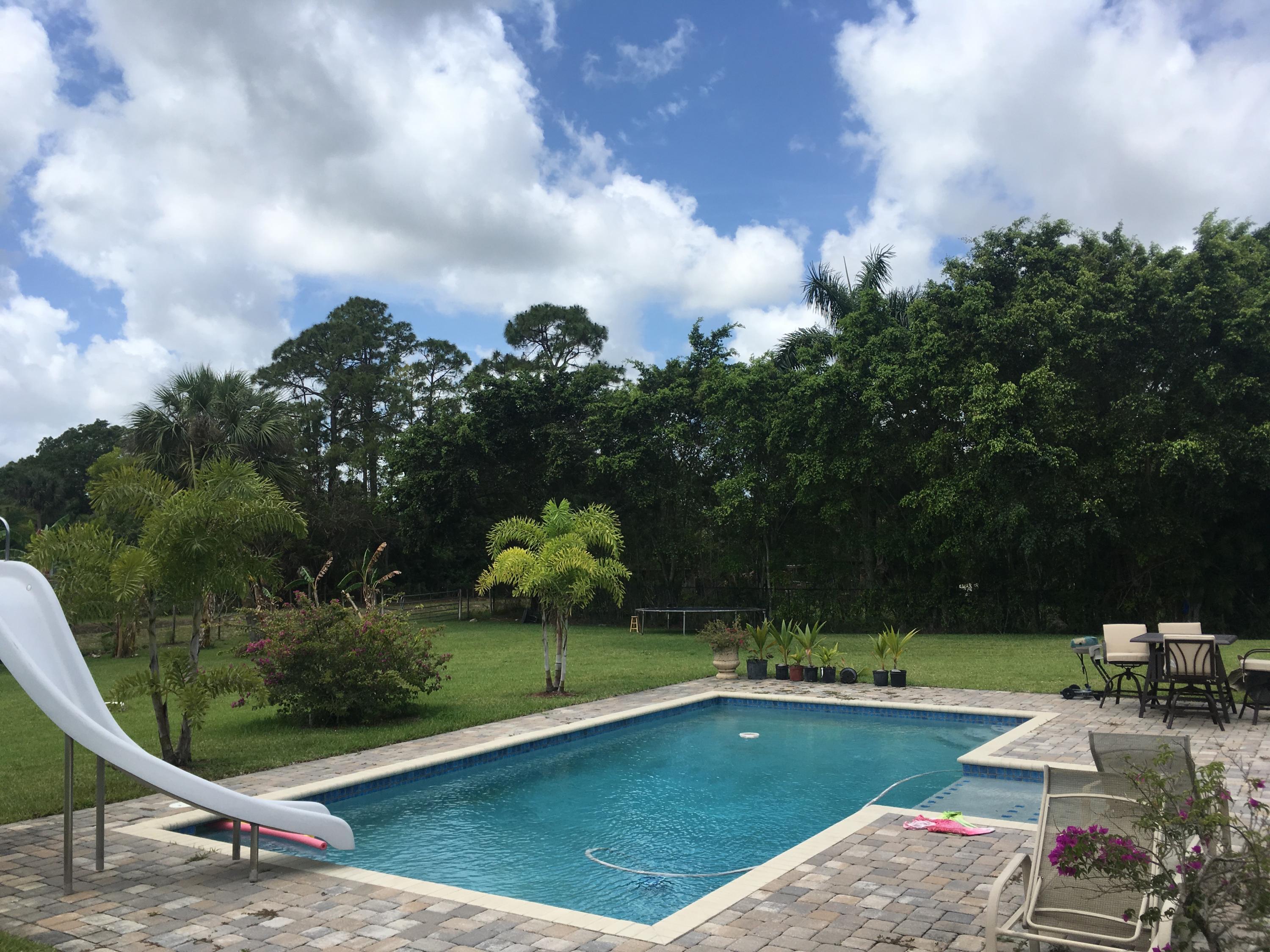 Beautiful 4 bedroom 3 full bath CBS home on 1.25 acres in the Acreage. The home sits on a paved road East of Royal Palm Beach Blvd. A refreshing salt water pool was recently installed in 2014 with a relaxing sun shelf. The large chef's kitchen has granite countertops, stainless steel appliances and plenty of cabinet space. There are original hardwood floors in all the main living areas. The home has a formal dining room and dedicated office. The master bedroom has two closest and a separate tub / shower. The property is fully fenced in and sits on a canal that's perfect for irrigation. Please note that the electric gate will not convey nor will the pol heater. Those belong to the tenants.