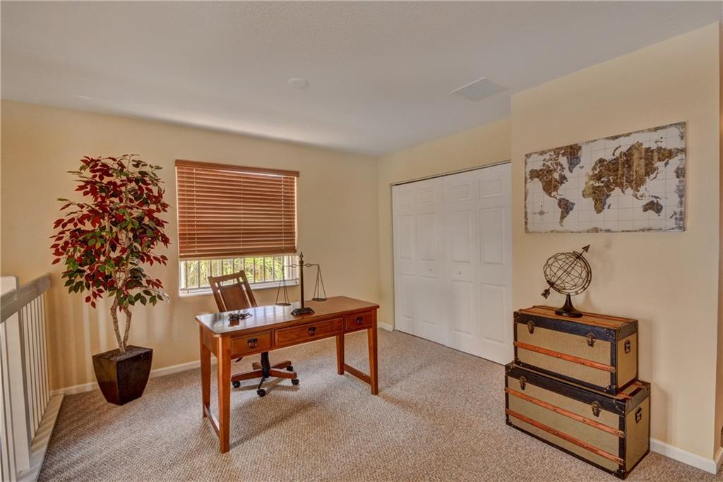 This 2 story, 4/2.5 home features an open kitchen w/granite counters & SS appliances, washer/dryer hook up, new carpet in loft & stairs, downstairs tile on the diagonal, fenced yard and accordion shutters. The oversized master bedroom boasts a tray ceiling, huge walk in closet built out California style, French doors leading out to balcony and the master bathroom boasts separate tub & shower and His & Her sinks w/vanity. The 4th room is the loft w/closet that can be converted back to the 4th bedroom.