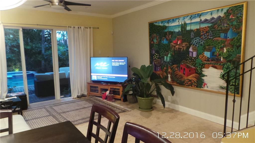 Stunning 3 bedroom two and a half bathroom fee simple townhome with a tropical pool and hot tub! The home features marble floors throughout living areas, carpet in bedrooms, a beautiful kitchen with granite counters and stainless steel appliances, impact windows/doors, tall interior doors, high ceilings. Living room overlooks the tropical fenced backyard with heated pool and hot tub. The upstairs master bedroom features a walk-in closet and spacious bathroom with dual sinks and separate tub/shower.