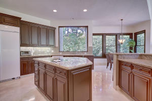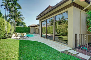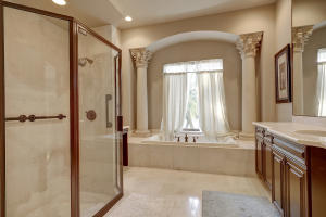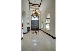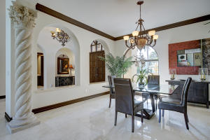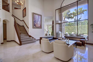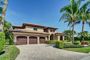 Two-story interior home in Royal Palm Yacht & Country Club with 5 bedrooms and 6 bathrooms. Features include volume ceilings throughout, foyer entry, formal living and dining rooms, and gourmet kitchen opening to breakfast area and family room. First floor master suite features his and her bathrooms, his and her walk-in closets, and door leading out to covered patio area.
