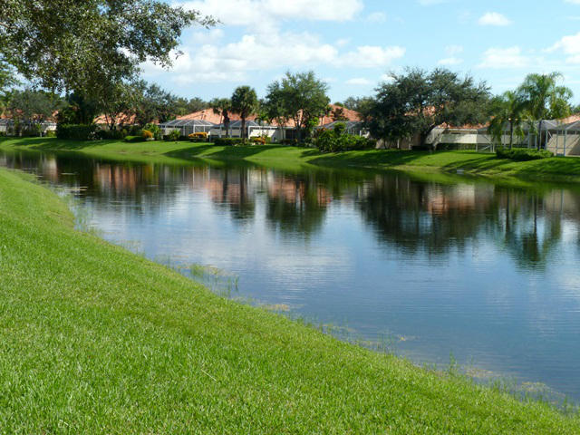 Fabulous pool home sitting lakefront on an oversized pie shaped .23 acre lot. Foyer entrance to open living room with high ceilings, built in entertainment center and 2 sets of sliding glass doors to the covered/screened pool patio. All tiled throughout except bedrooms. Kitchen features raised panel cabinetry and granite counter tops with window over the sink. Master bedroom also has sliding glass to the patio, custom mirror, walk in closets, roman tub, separate shower and his/hers bathrooms. Split bedroom plan has bedrooms 2 & 3 on the other side which has bathroom 2 across the hall. Bonus room with double door and built in cabinetry could be a 4th bedroom, office, library or den. Full size laundry room with wash sink. Unique community features its own Town Hall with bank & shopping.