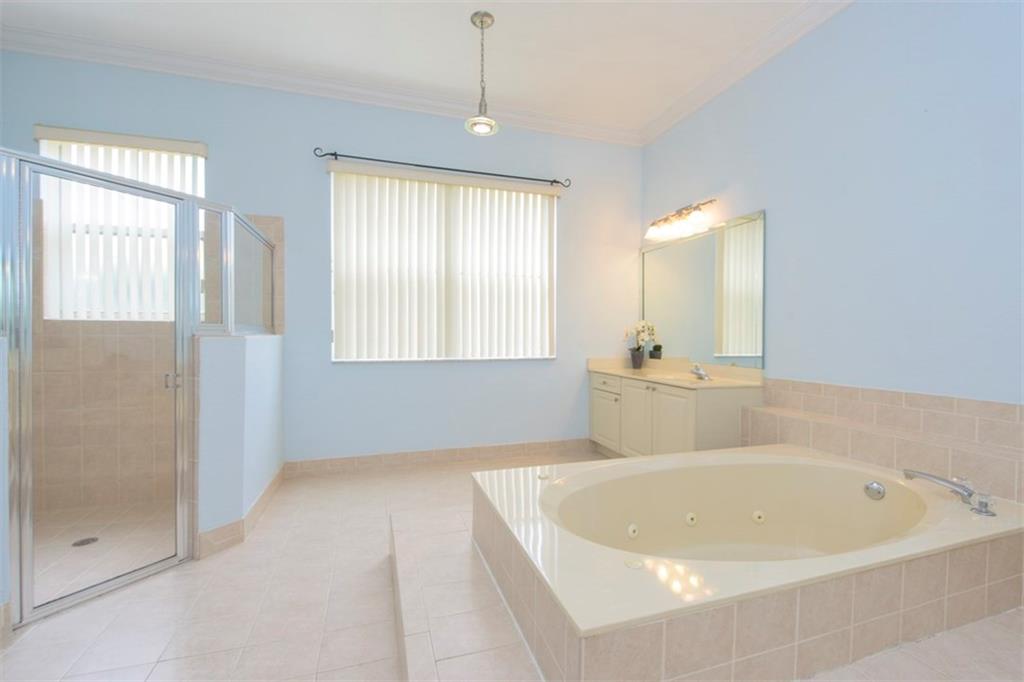 Spectacularly upgraded 2 story home with remodeled kitchen featuring granite, stainless appliances & gorgeous wood cabinets. Spacious master bedroom (1st floor) has 2 walk-in custom cabinet closets. Master bath has dual sinks, bidet & Jacuzzi tub. Huge loft-playroom. Heated pool with salt system & spa has wireless remote control. Hurricane shutters- all accordion upstairs. Tile & wood flooring. Fenced yard with covered patio has a view of the lake. 2 AC's (1 replaced 2014). Gated Community close to I-75.