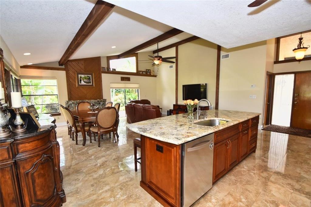 This remodeled cul-de-sac home is situated on a great lot in Escondido. Porcelain tile throughout open concept living space adds class to the kitchen which spares no expense. Elite SS applncs, pullouts, & a lrg granite island with lots of counter space. The granite flows into backsplash/baths/bar. Custom HunterDouglas blinds compliment the fireplace/wood beams. Enjoy golf course views on the covered screend patio. This family friendly home is mins from the T'pike. 24HR manned guard gate, A+schools
