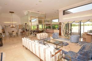 Expansive lake and golf course views enhance this beautifully landscaped one-story (no steps) home on an oversized (.53 acre) lot at the corner of a cul-de-sac. The bright and spacious floor plan provides seamless flow and extraordinary views from virtually every room. The office/den includes custom-built wood cabinetry and plantation shutters. The kitchen opens to the family room and breakfast room. The lovely master suite includes a second office. The two guest bedrooms are en-suite. Also included: marble floors, crown moldings, neutral colors, hurricane protection, a new a/c unit, and circular driveway.