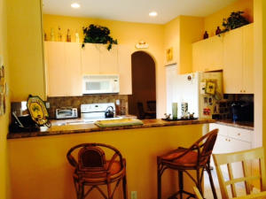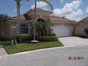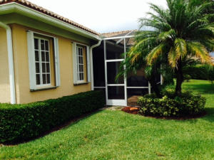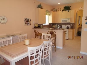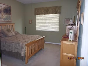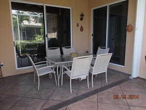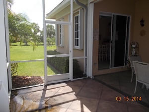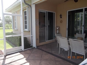Well maintained single story home at the end of a cul-de-sac. Walk in through a screened-in entryway. Spacious extended screened-in patio can be accessed from living room, family room and master bedroom. Spend time on the patio and enjoy the sun and a partial lake view or enjoy your meals in the shade provided by the overhang. This is a 2 bedroom and den. However, the den/office can be converted to 3rd bedroom by adding a closet. Area off of kitchen can be used as a family room or extended kitchen area. Large master bedroom and bathroom. Separate room with washer/dryer and utility tub in garage.Accordian shutters on all windows!Carpet in living area was replaced 5 yrs ago.This is an active guard-gated community with 10,000 sq ft clubhouse, pool, state of the art gym, tennis courts,