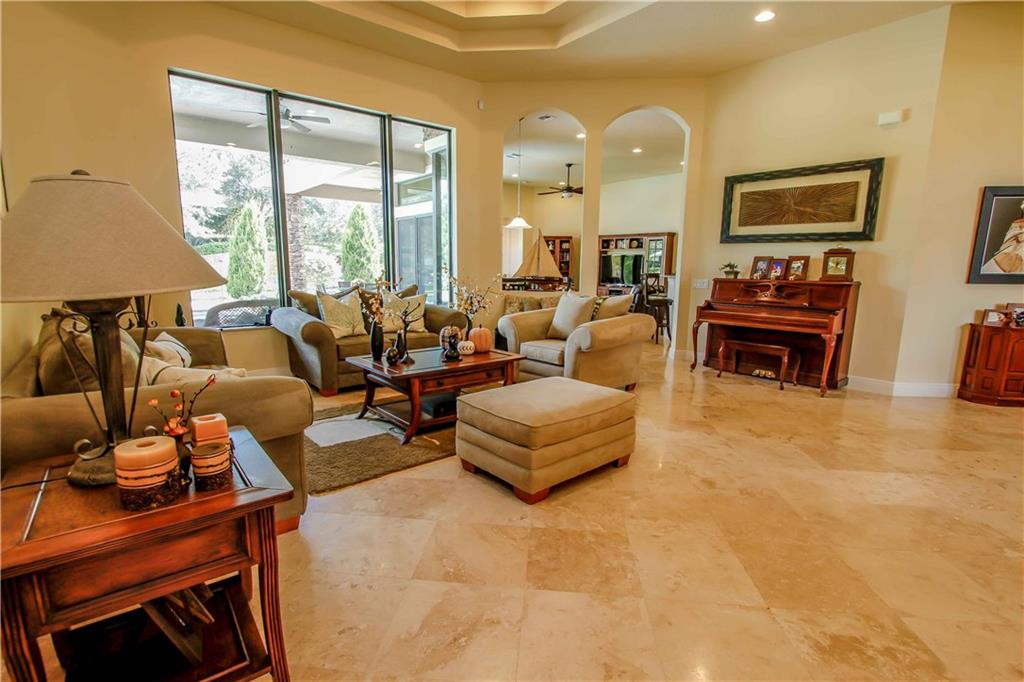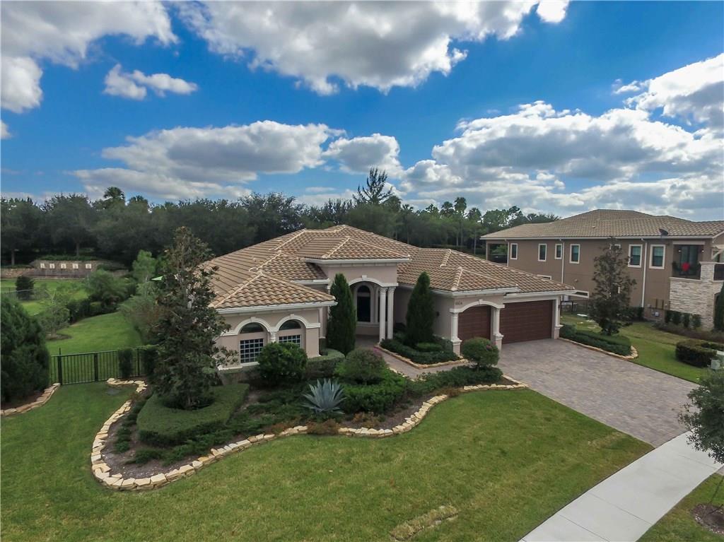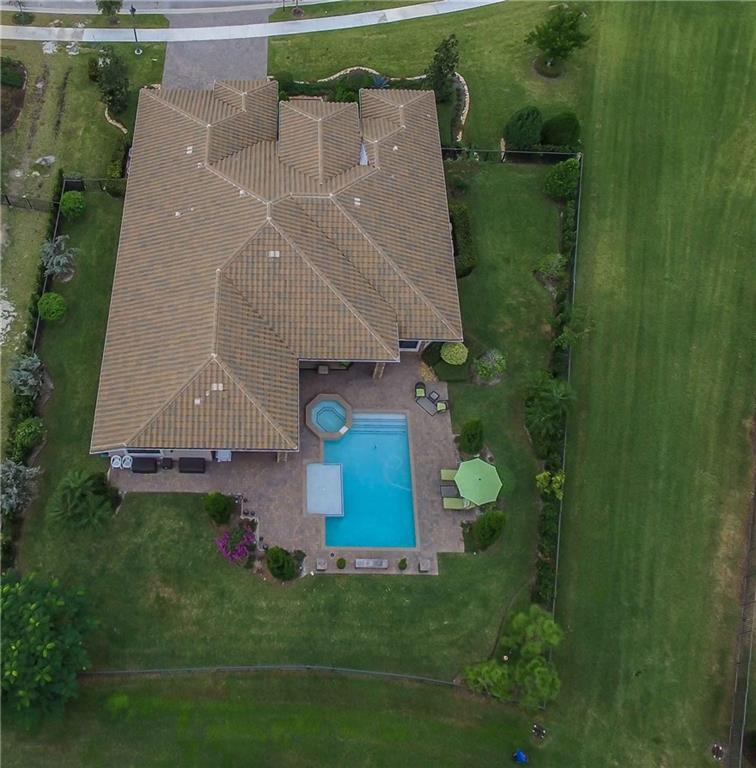 Enjoy the serene private resort style yard of this spectacular home. Custom pool w/fountains, beach shelf, jacuzzi heated w/gas, expansive pool deck of travertine. Private waterfall will add to the relaxing ambiance. Main flrs are gorgeous travertine. Gourmet kitchen w/real wood cabinetry, granite countertops, ss Wolf & Subzero appl, 6 burner gas stove, snack bar. Protected by impact windows & security system. 5th Bed used as an office w/custom built-in furniture w his and hers work stations.