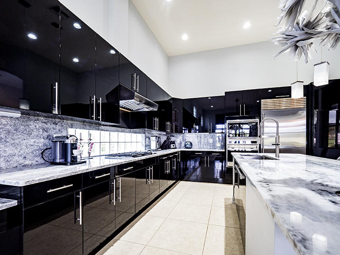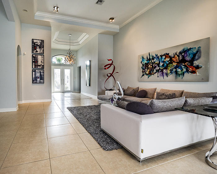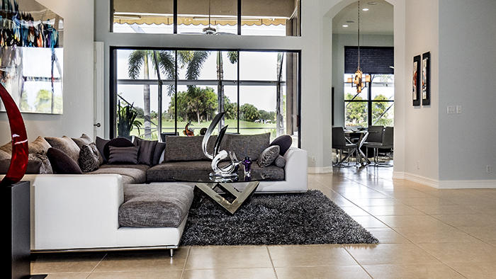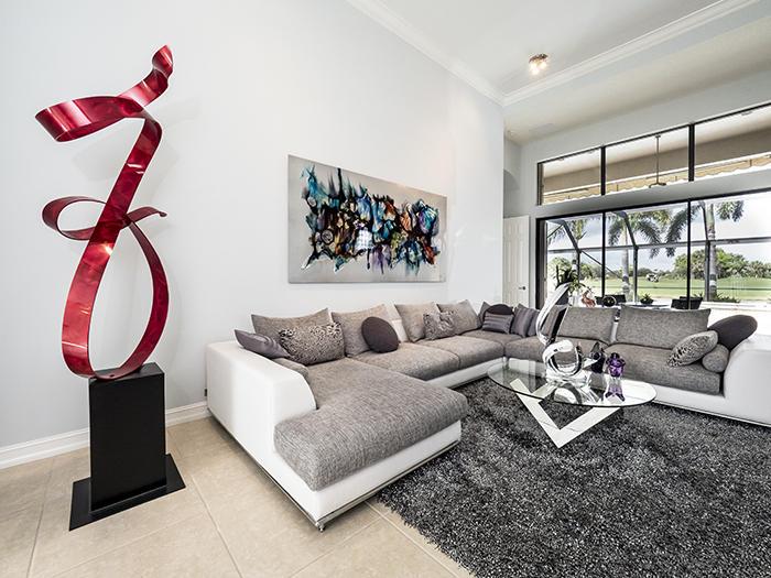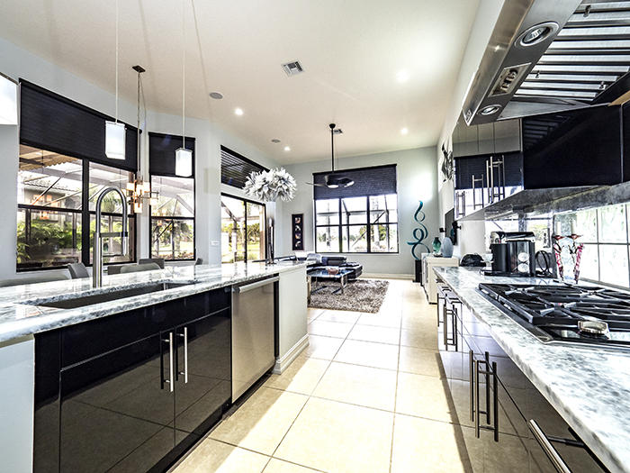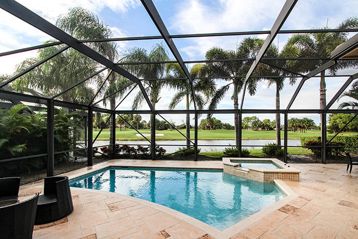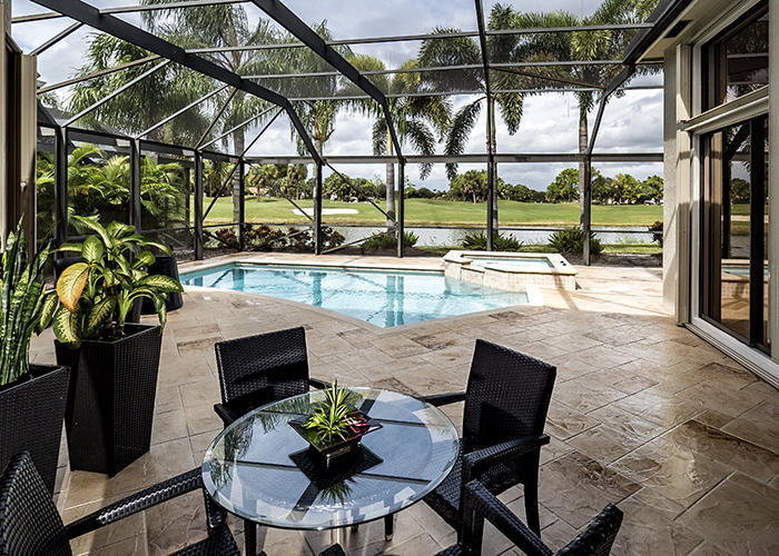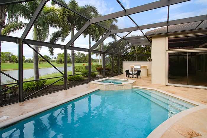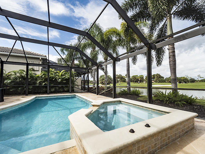 You've never seen a Blue Heron home like this! Fabulous contemporary masterpiece with picture-perfect water and golf view from the fully screened pool and spa area. Summer kitchen, designed concrete pool deck overlooking the 16th green of the Heritage. Remodeled kitchen in 2015: Brazilian quartzite counters and full backsplash, black laquered cabinets, Wolf oven, hood, SubZero, Miele dishwasher, custom lighting and sleek window treatments throughout, gorgeous engineered wood like you've never seen in bedrooms ('13), Trane AC('13 w/ UV system), washer dryer ('11), water softener ('13), epozy garage floors, Bose surround sound, Impact Glass designer front doors, master bath w/ floor-to-ceiling marble and spa shower, redone guest baths, landscaping lighting, electric awnings.