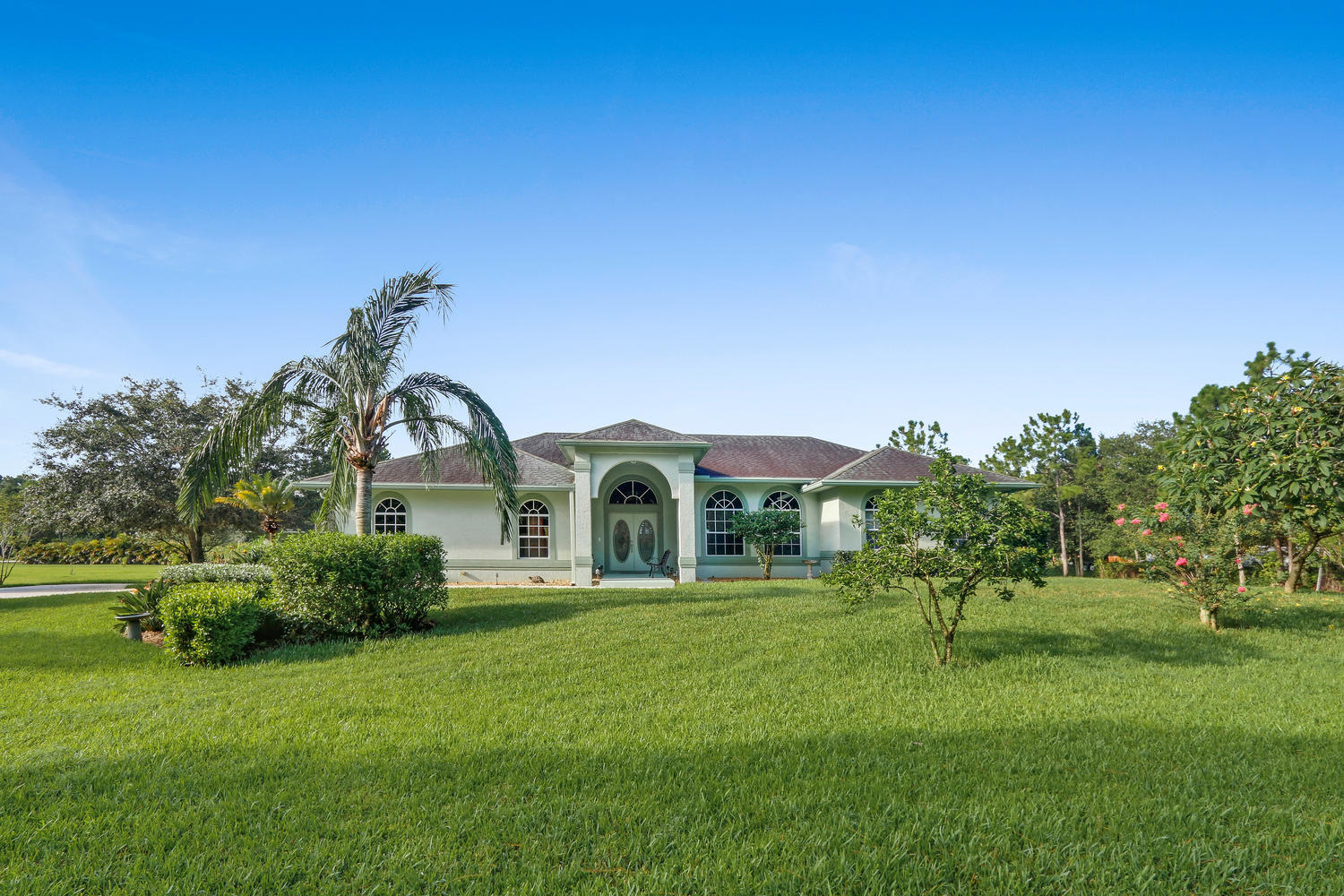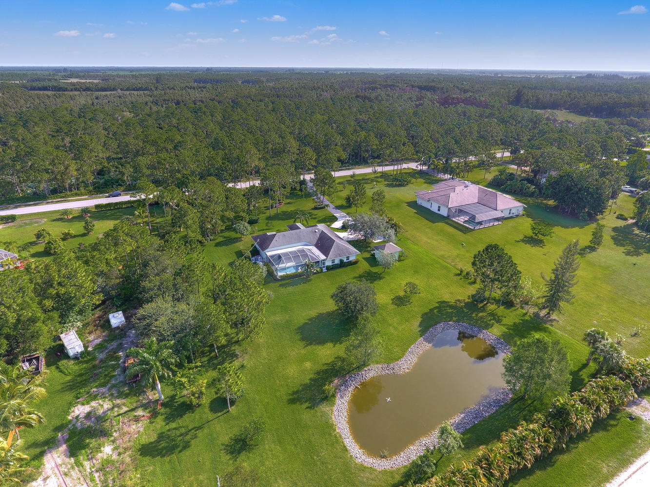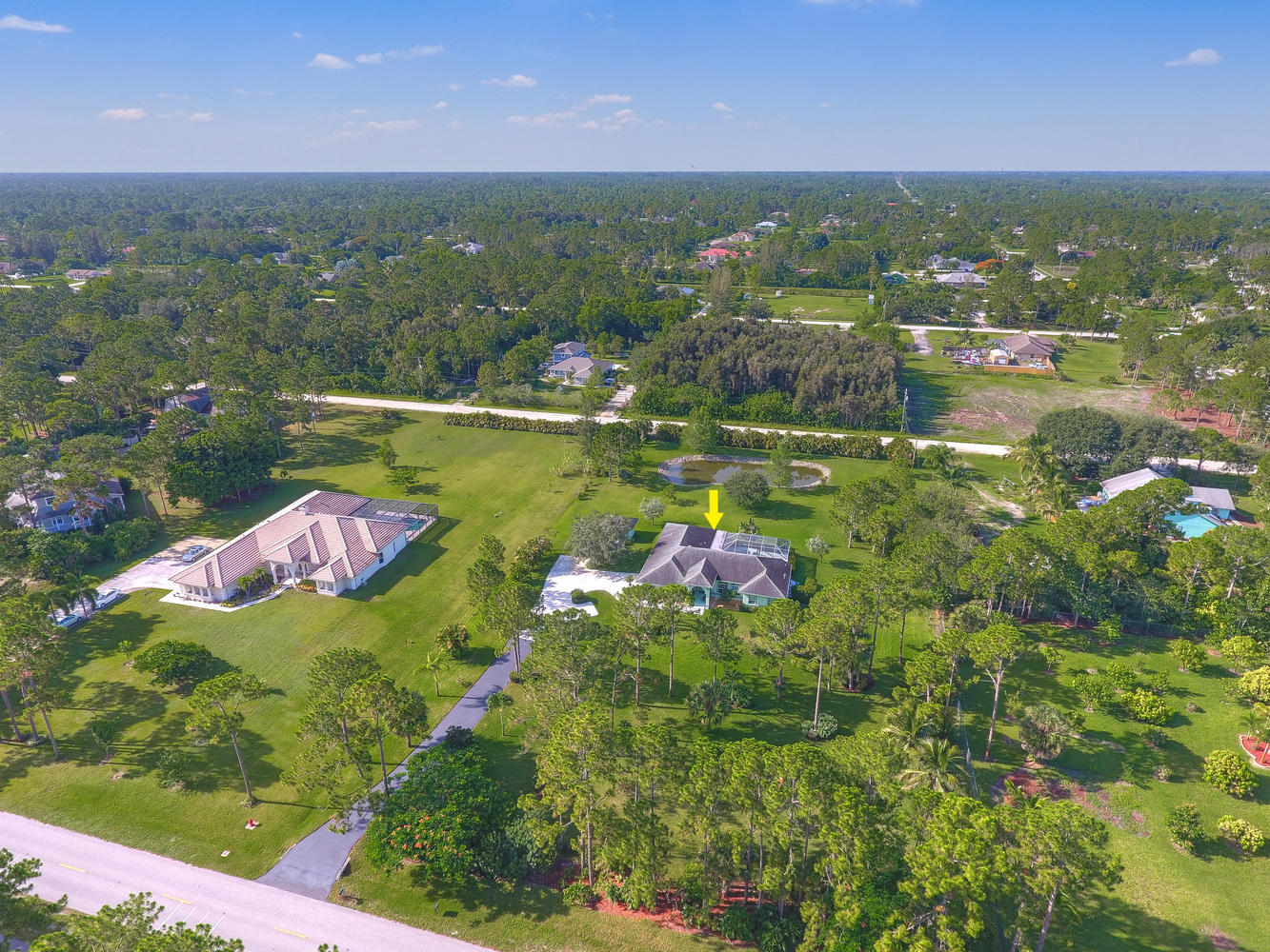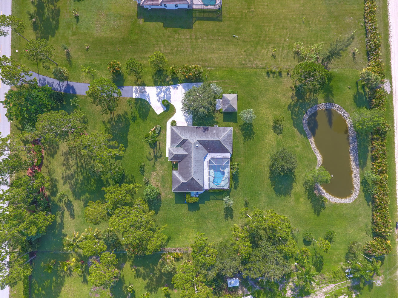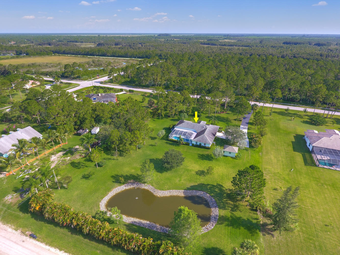 Absolutely beautiful 3BR/2BA home with a screened pool on a large 2.35 acre located on a paved road with CITY WATER! A long paved driveway leads up to the home with a welcoming double door entry with glass doors and large front porch. Spacious floorplan with tile flooring thru-out. The kitchen offers stainless steel appliances, pantry, and a breakfast area to enjoy your morning coffee. Lots of room to entertain with a family room, living room and a formal dining room. The dining room offers arched windows, chandelier, and wood blinds. The living room is tiled with a ceiling fan and light, arched window, wood blinds, & window treatments. Large master suite. Stunning yard with beautiful landscaping, & private pond! Gorgeous piece of property in the Loxahatchee area. Great schools nearby.