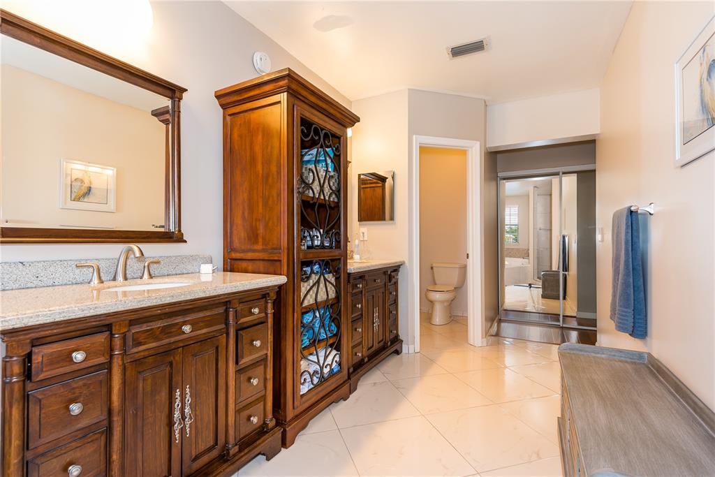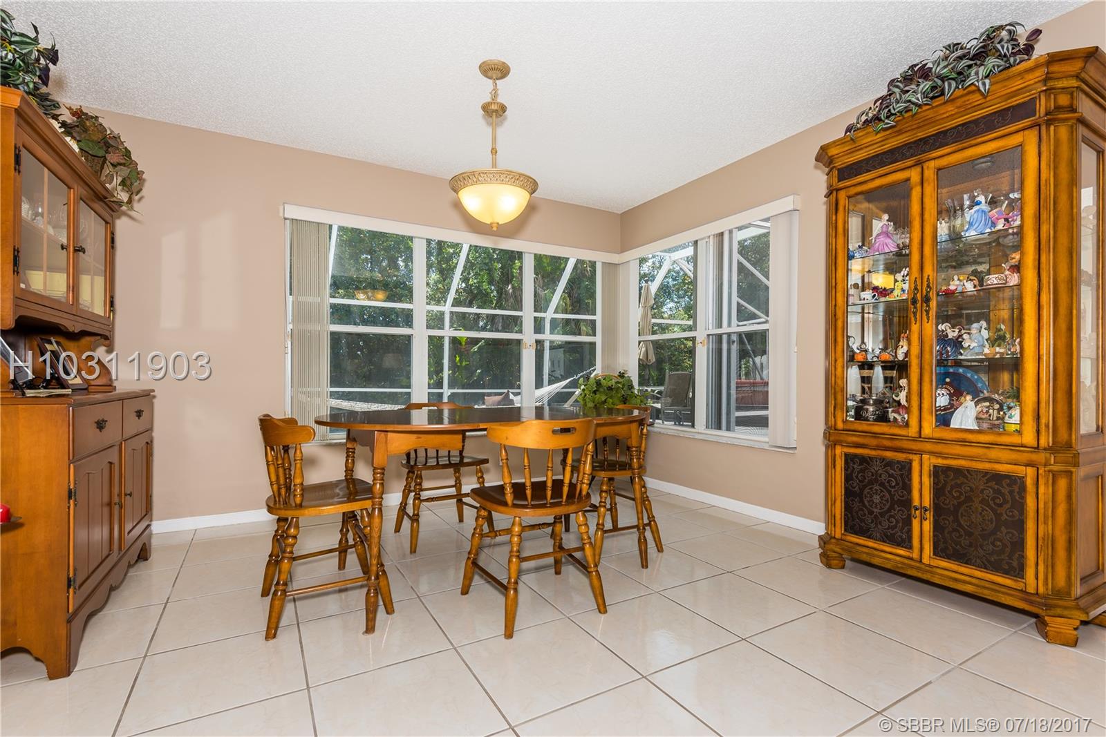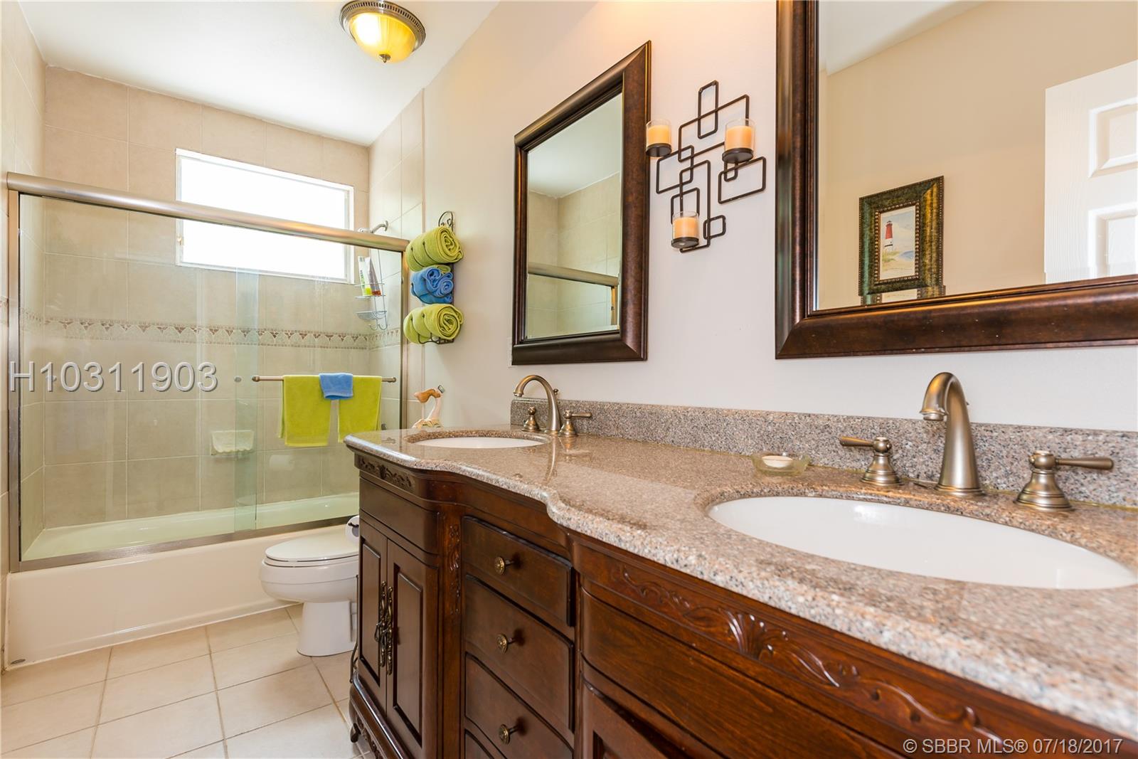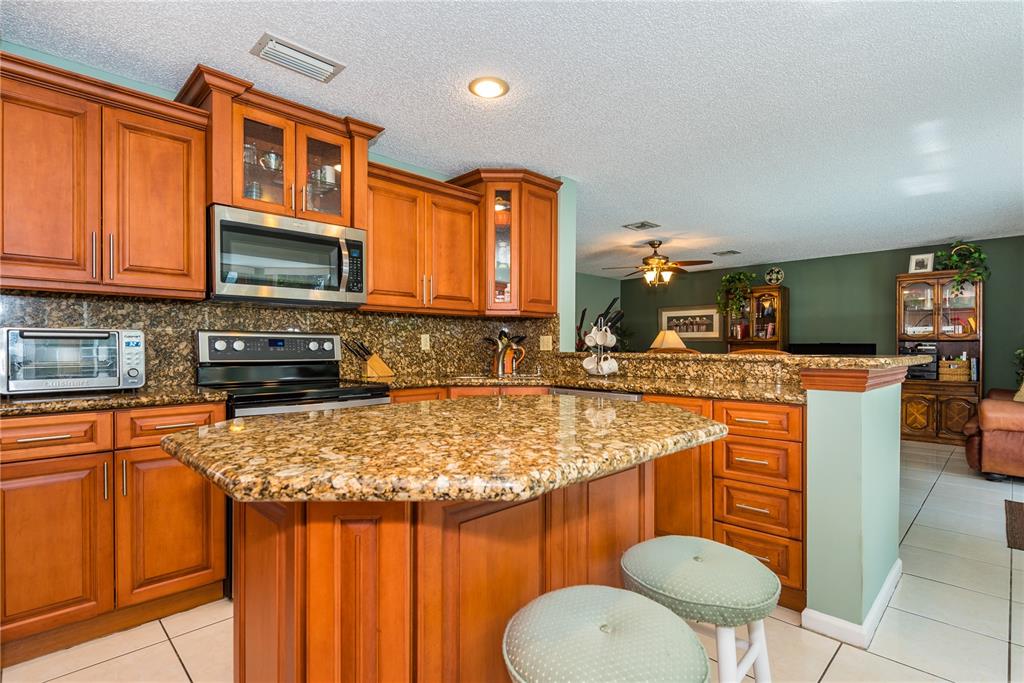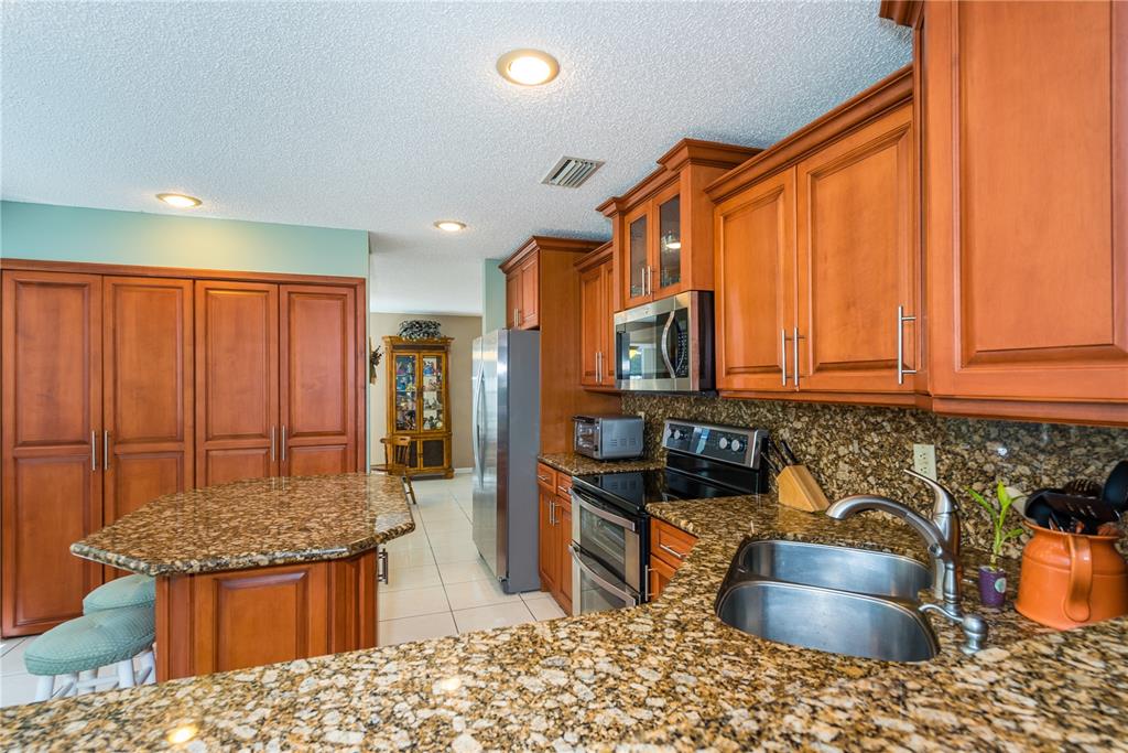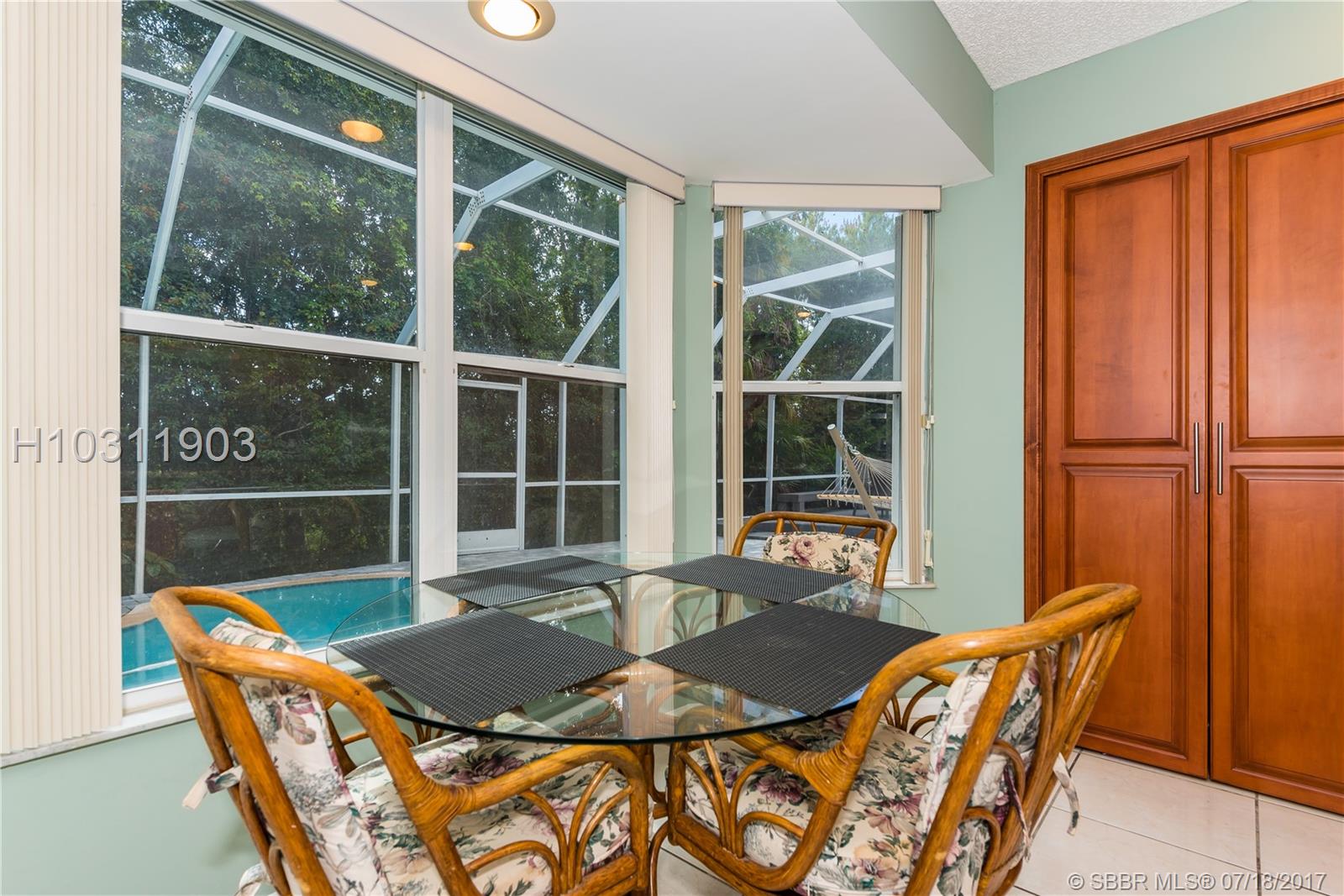 Look no further! This 4 bedroom has 3 full bathrooms, is spacious, well kept and has numerous upgrades. The huge master suite upstairs, has a king-sized bed with an oversized walk-in mirrored closet that opens into a spa-like bathroom, freshly tiled, with his & her wood w/granite sinks. All bedrooms have laminate flooring upstairs. Whether full sized or queen sized beds in the rooms, there is still plently of space for furniture and even excercise equipment! The kitchen has stainless steel appliances, granite counter tops, plus an island, wooden cabinets & pantry, opens into a breakfast nook, that overlooks a den and a screened expansive patio & deck area beside the water with lush vegetation. There is a full sized laundry room with washer & dryer, plus has accordian hurricane shutters!