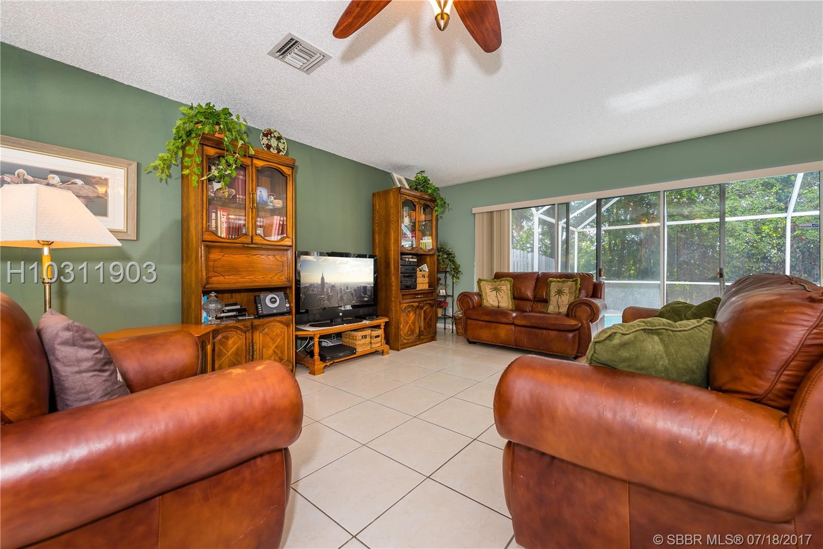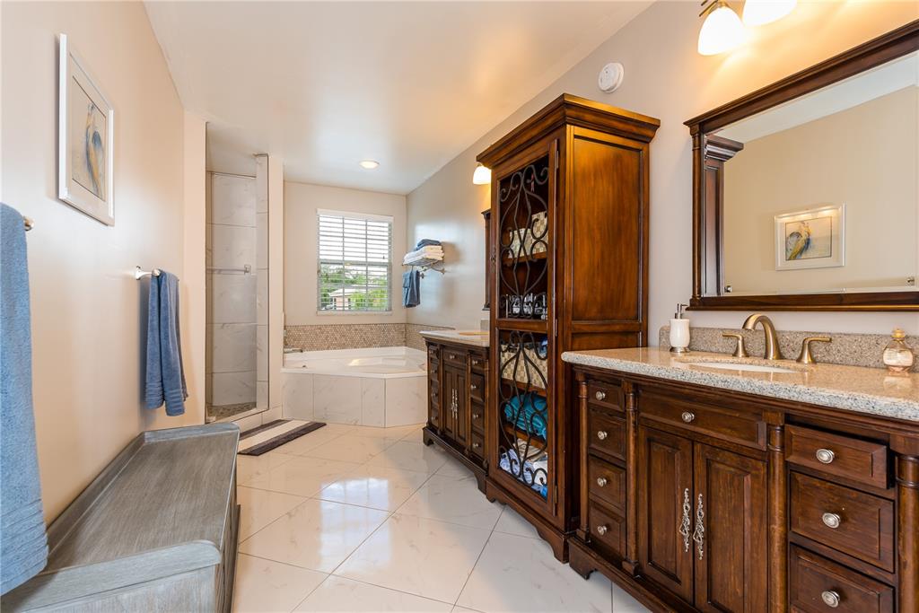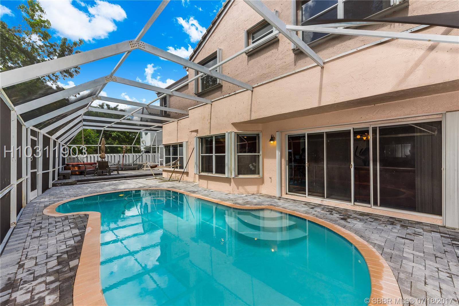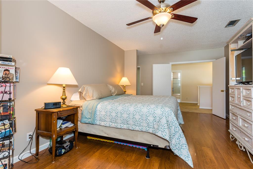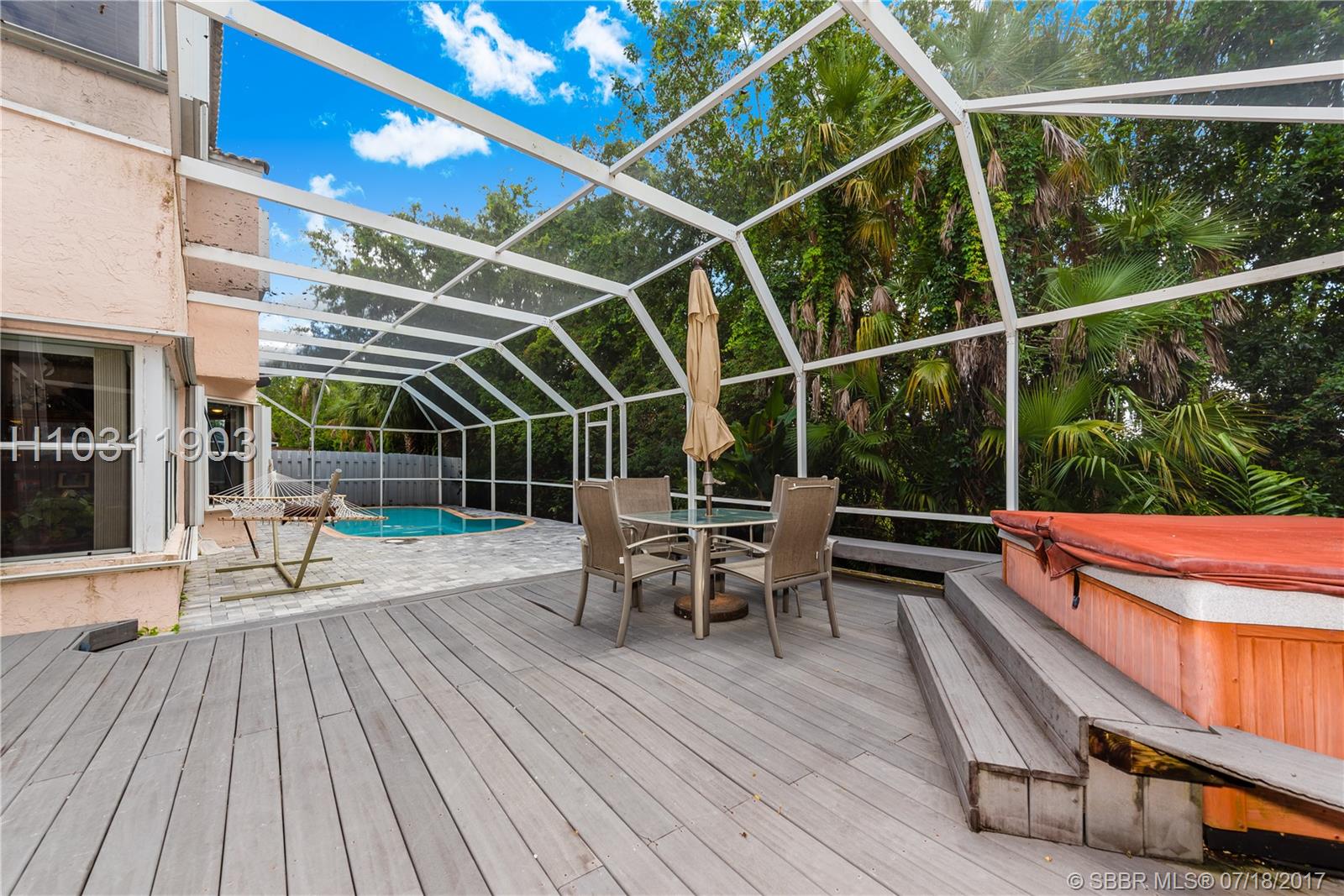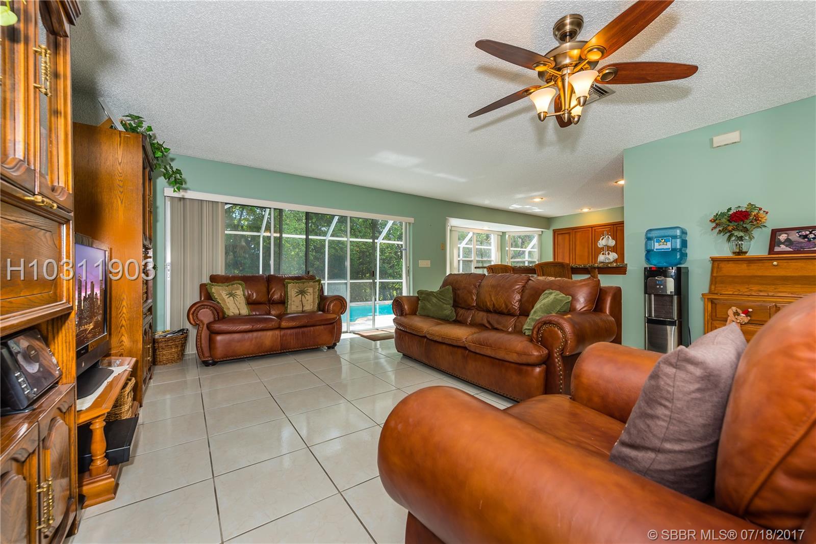 Look no further! This 4 bedroom has 3 full bathrooms, is spacious, well kept and has numerous upgrades. The huge master suite upstairs, has a king-sized bed with an oversized walk-in mirrored closet that opens into a spa-like bathroom, freshly tiled, with his & her wood w/granite sinks. All bedrooms have laminate flooring upstairs. Whether full sized or queen sized beds in the rooms, there is still plently of space for furniture and even excercise equipment! The kitchen has stainless steel appliances, granite counter tops, plus an island, wooden cabinets & pantry, opens into a breakfast nook, that overlooks a den and a screened expansive patio & deck area beside the water with lush vegetation. There is a full sized laundry room with washer & dryer, plus has accordian hurricane shutters!