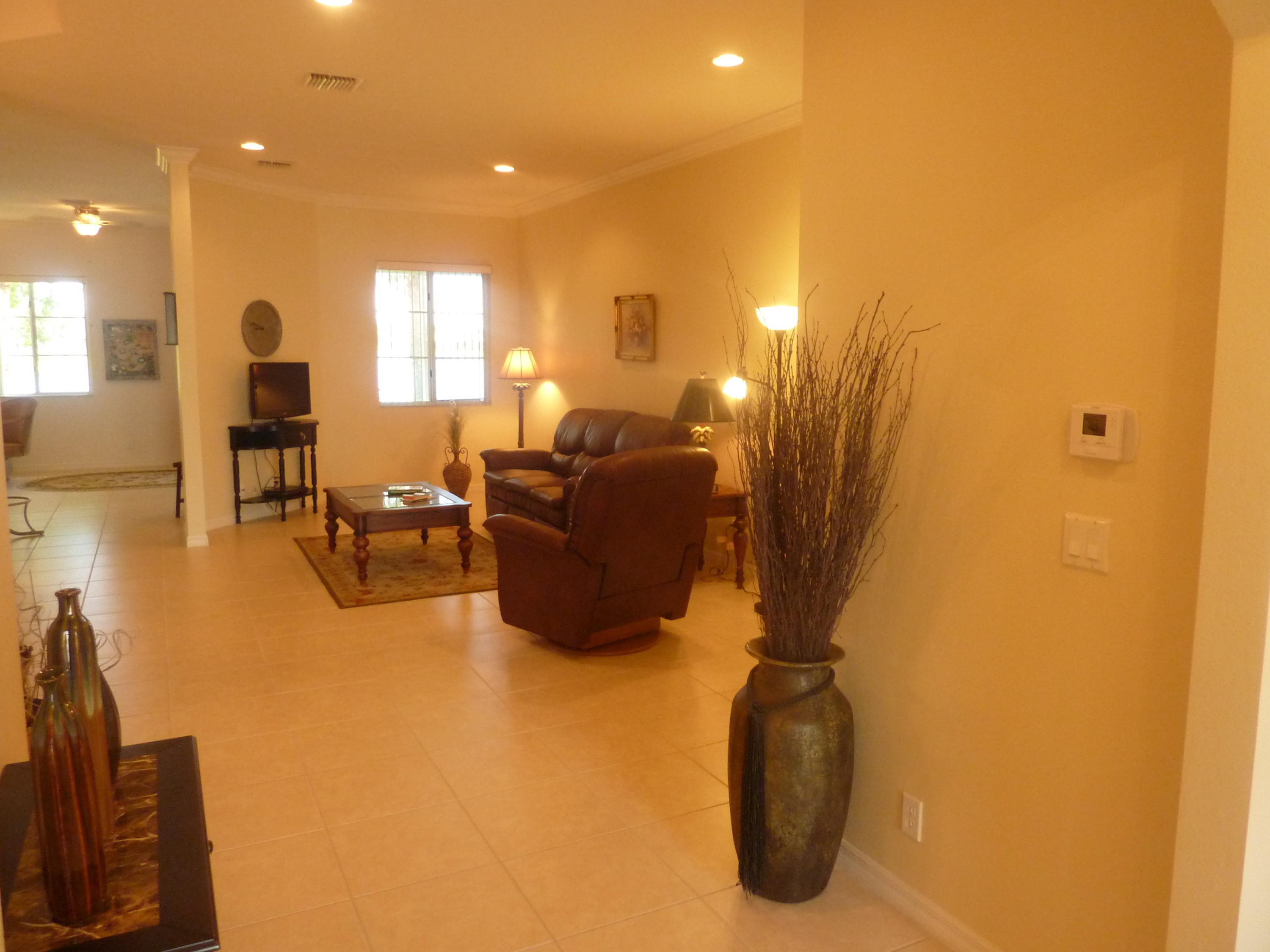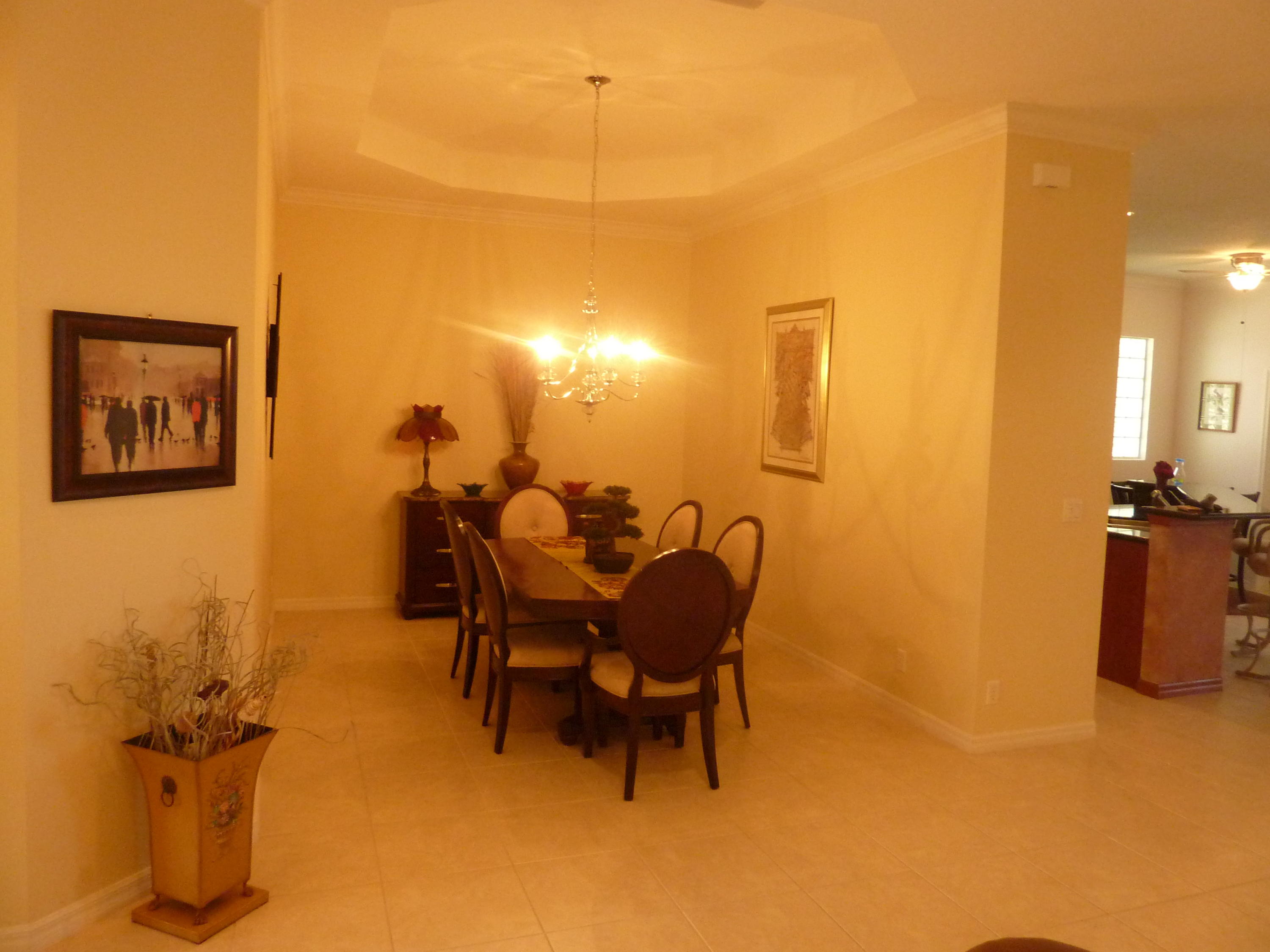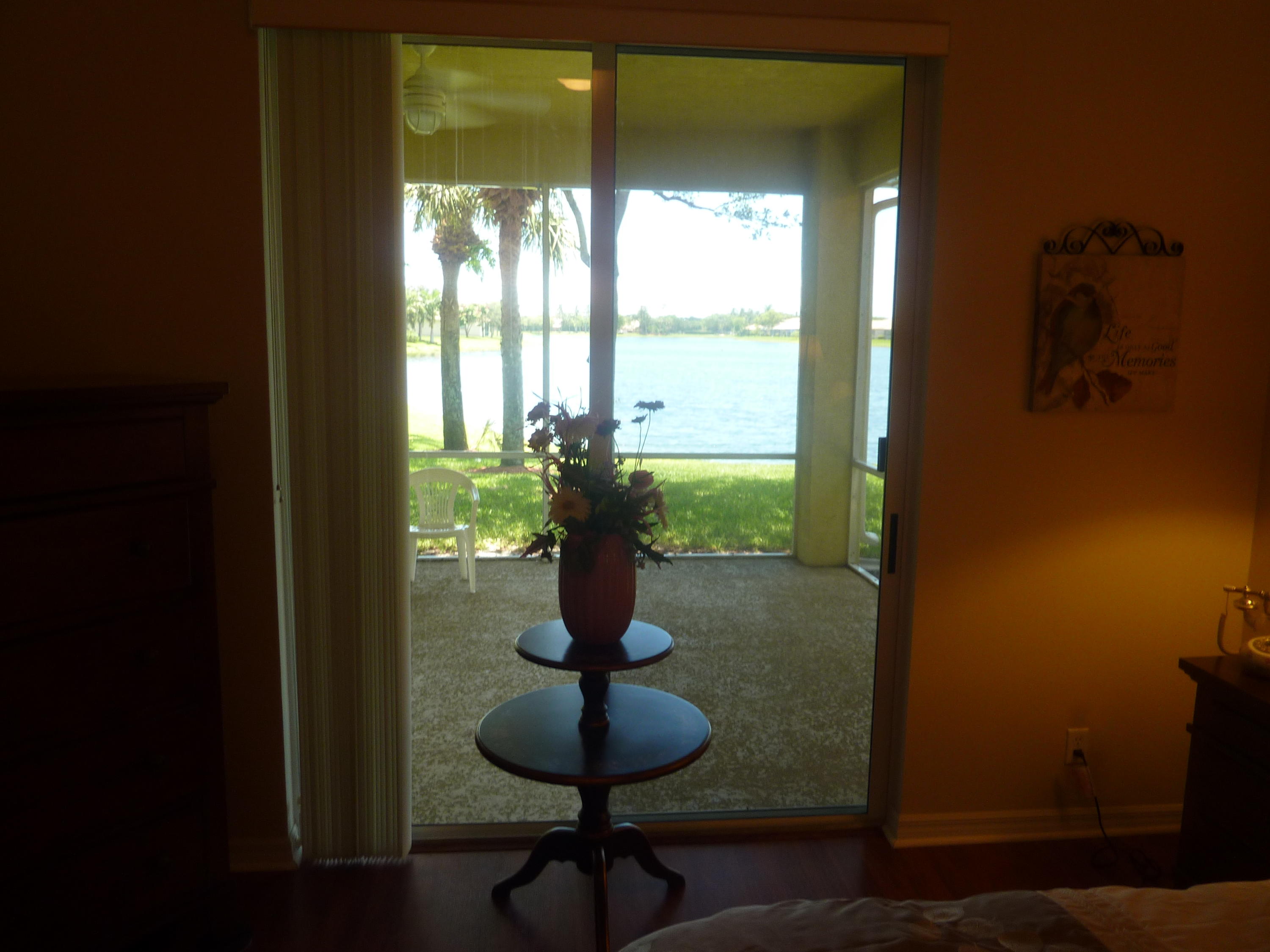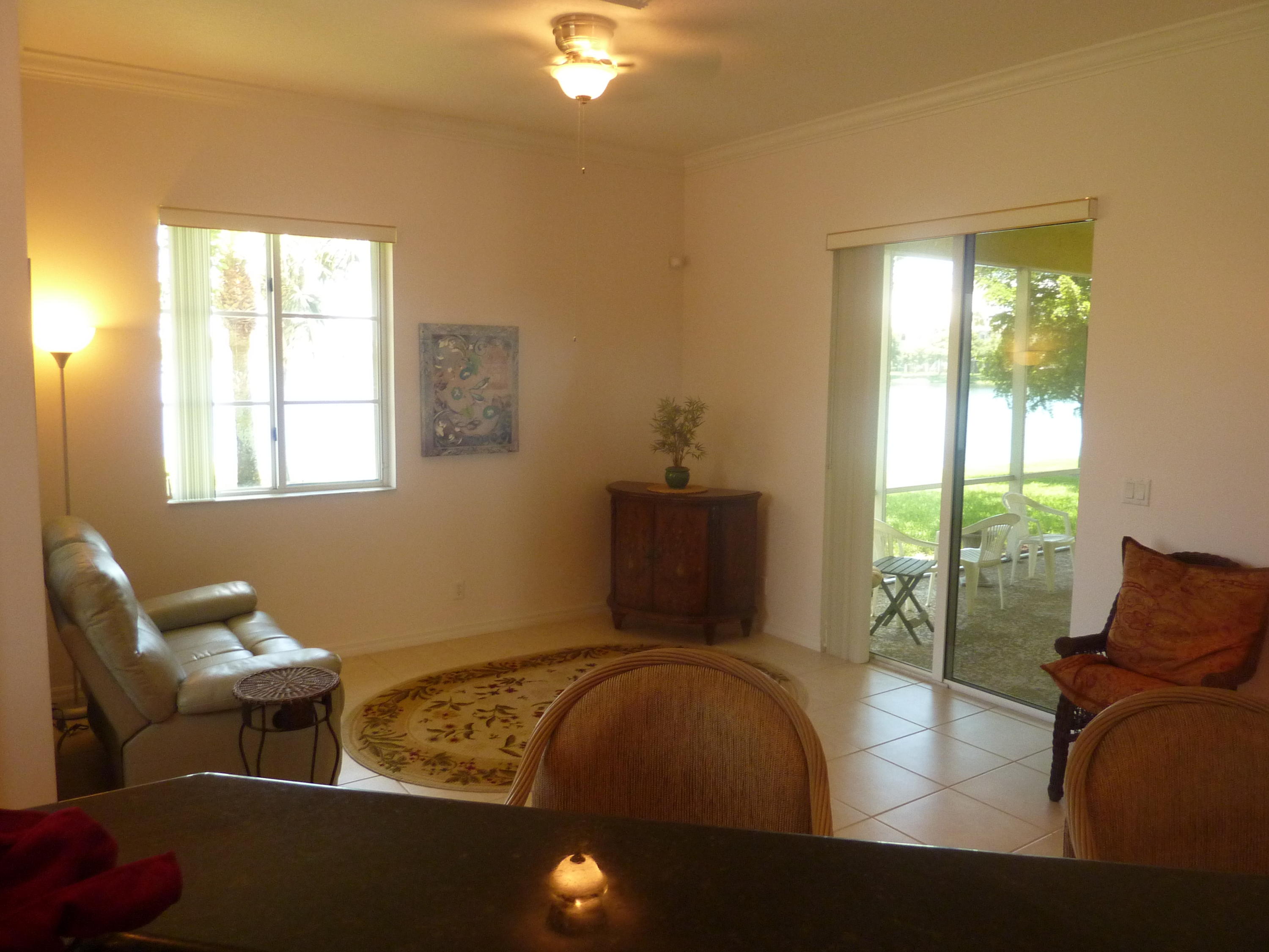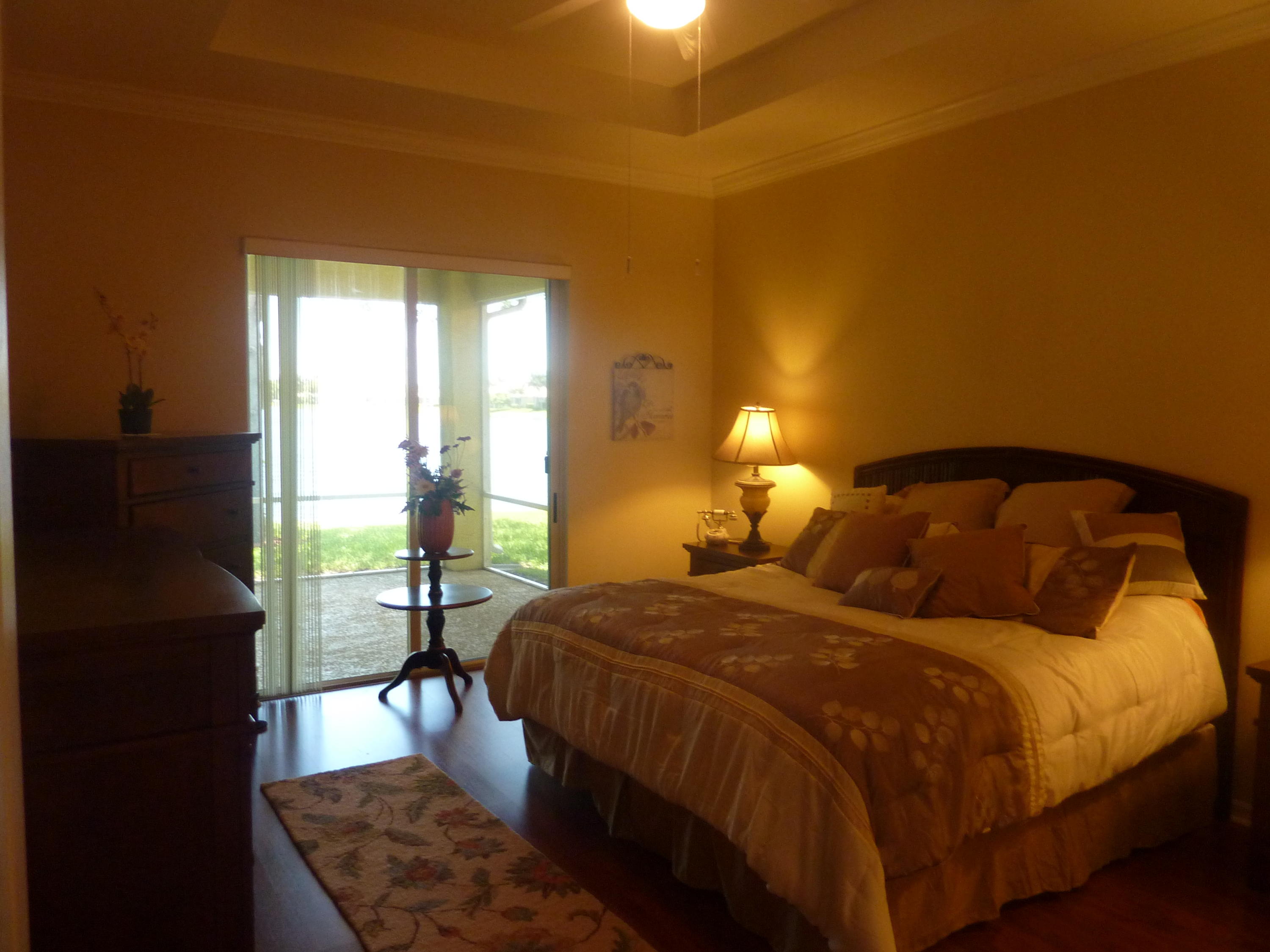 WHAT A VIEW!!! Long lake view from family room, living room and master bedroom. Spacious, open floor plan, meticulously kept 3 bedroom 2.5 bath waterfront home. Neutral tile throughout living areas and wood laminate in all bedrooms. Beautiful kitchen with granite counters and upgraded cabinets, opens to family room which has sliders to the large screened patio with an amazing view of the lake. Split bedroom plan which is great for children and guests. Spacious master bedroom, with tray ceiling, with sliders to the large screened patio as well. Two large closets in the master bedroom and Jacuzzi tub with separate shower in the master bath. Formal dining room has tray ceiling as well and is perfectly located across from formal living room and next to kitchen. Crown molding throughout main