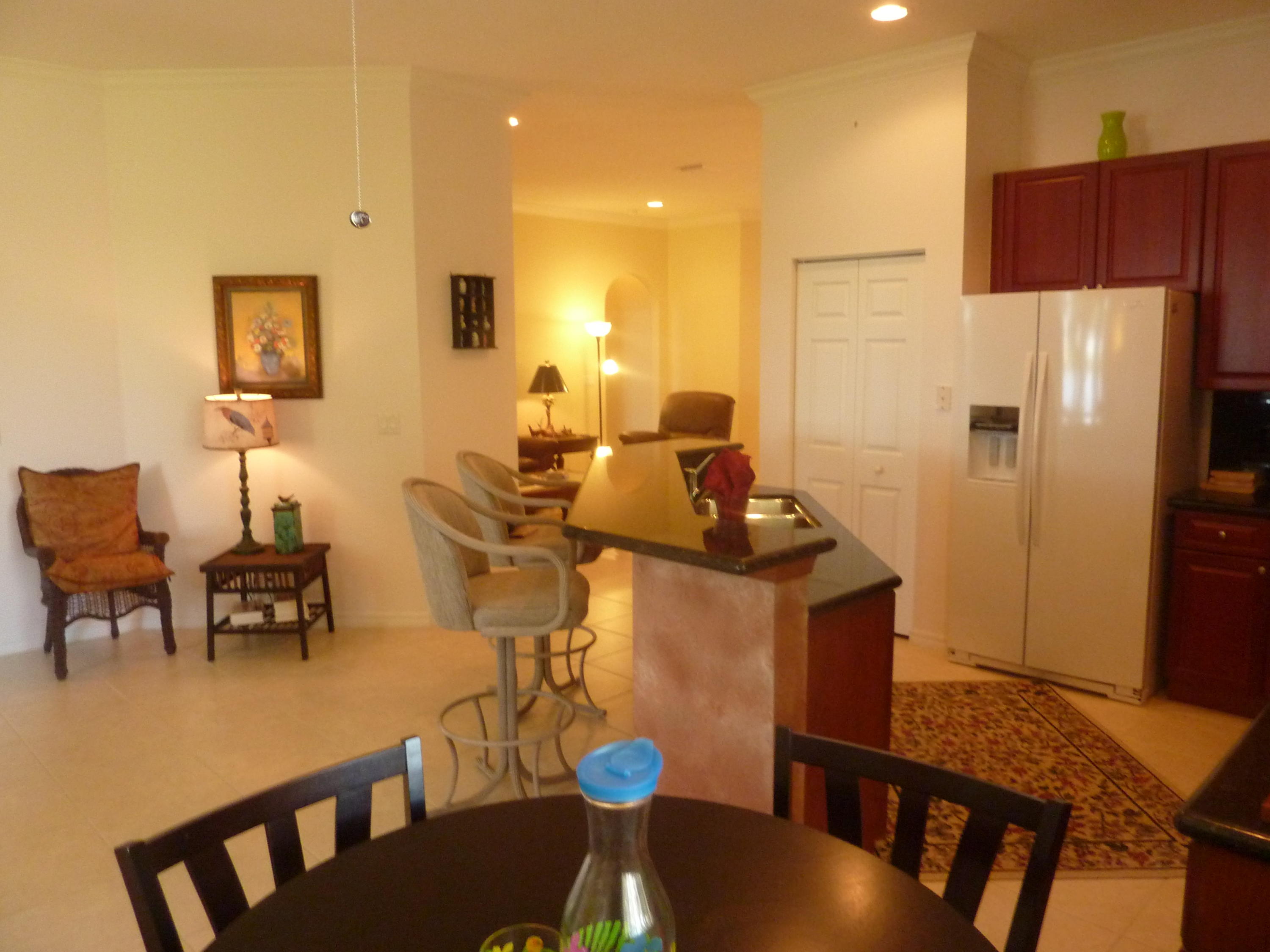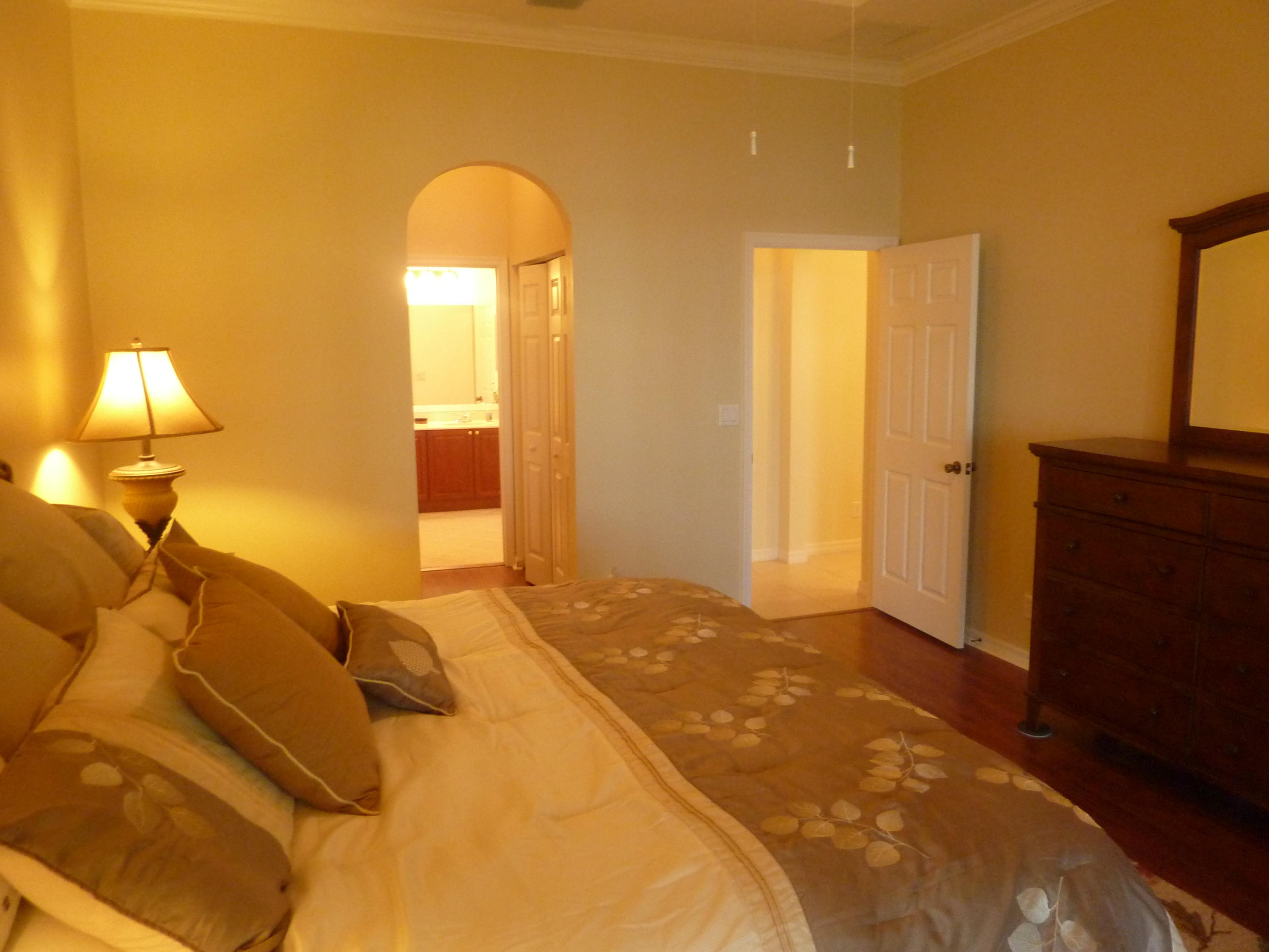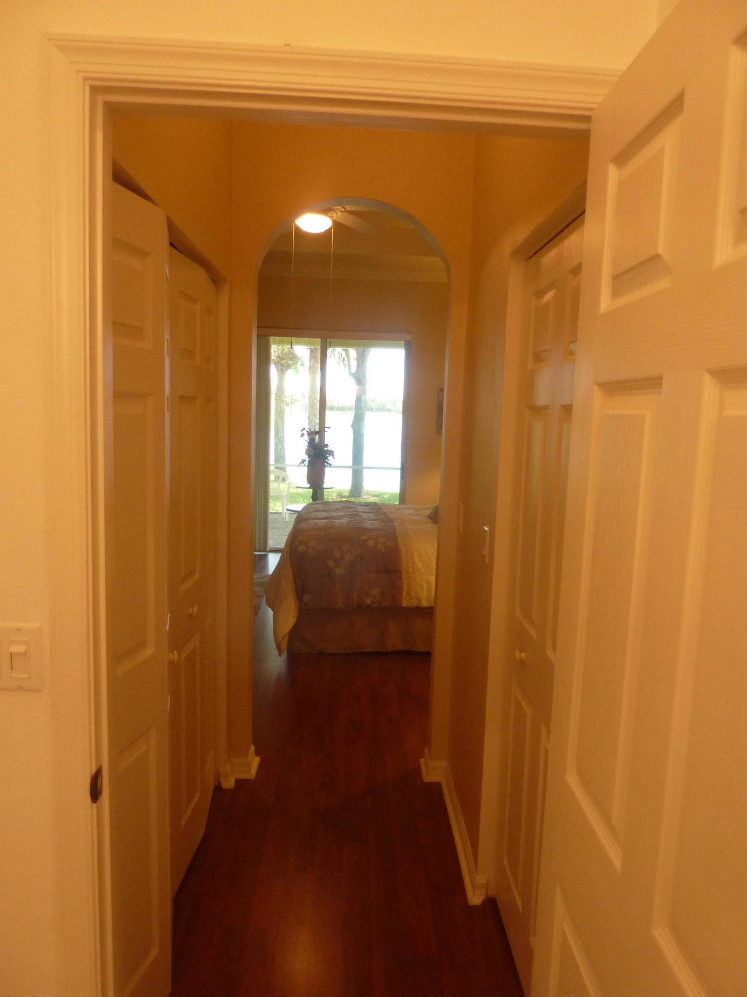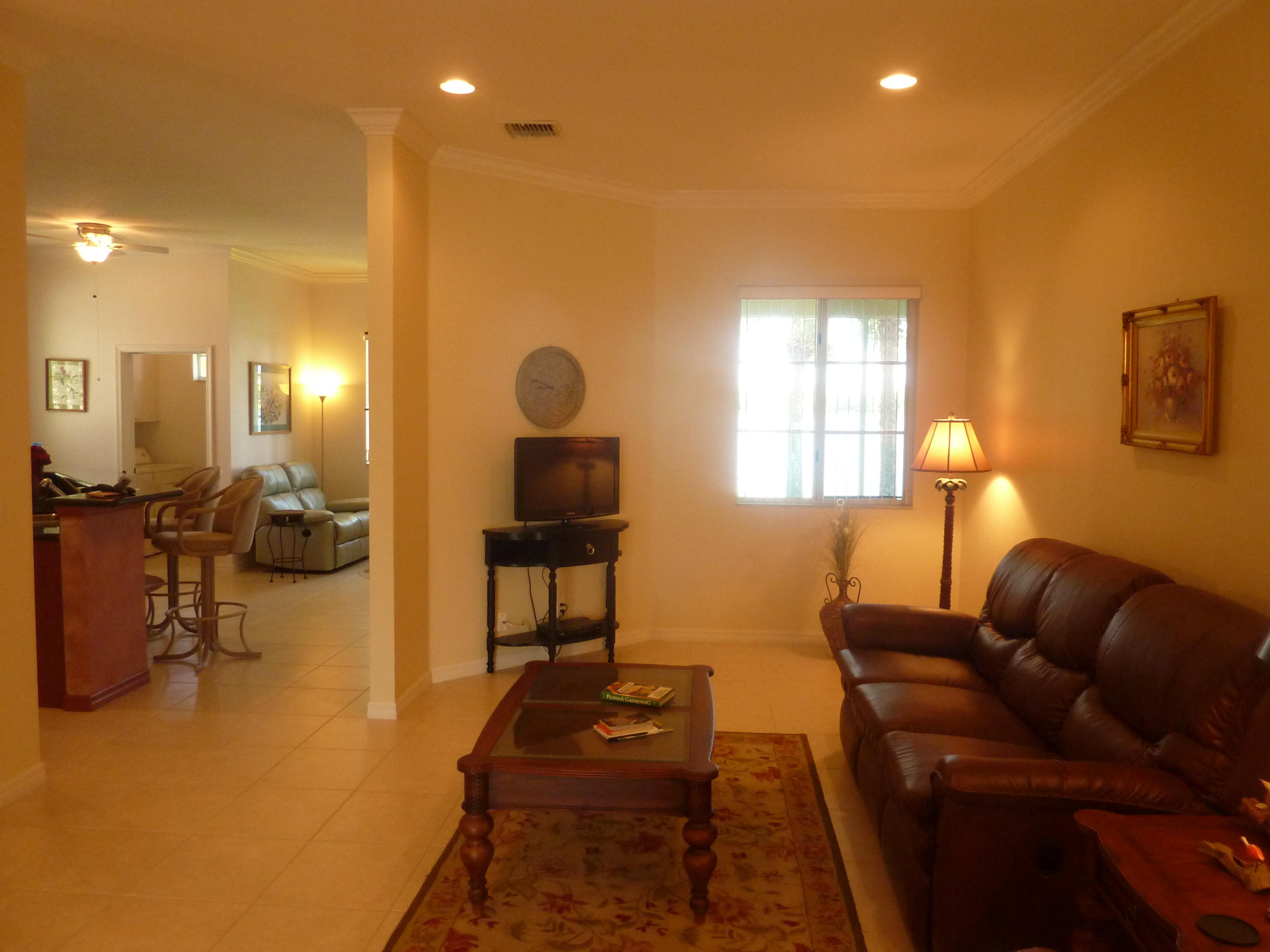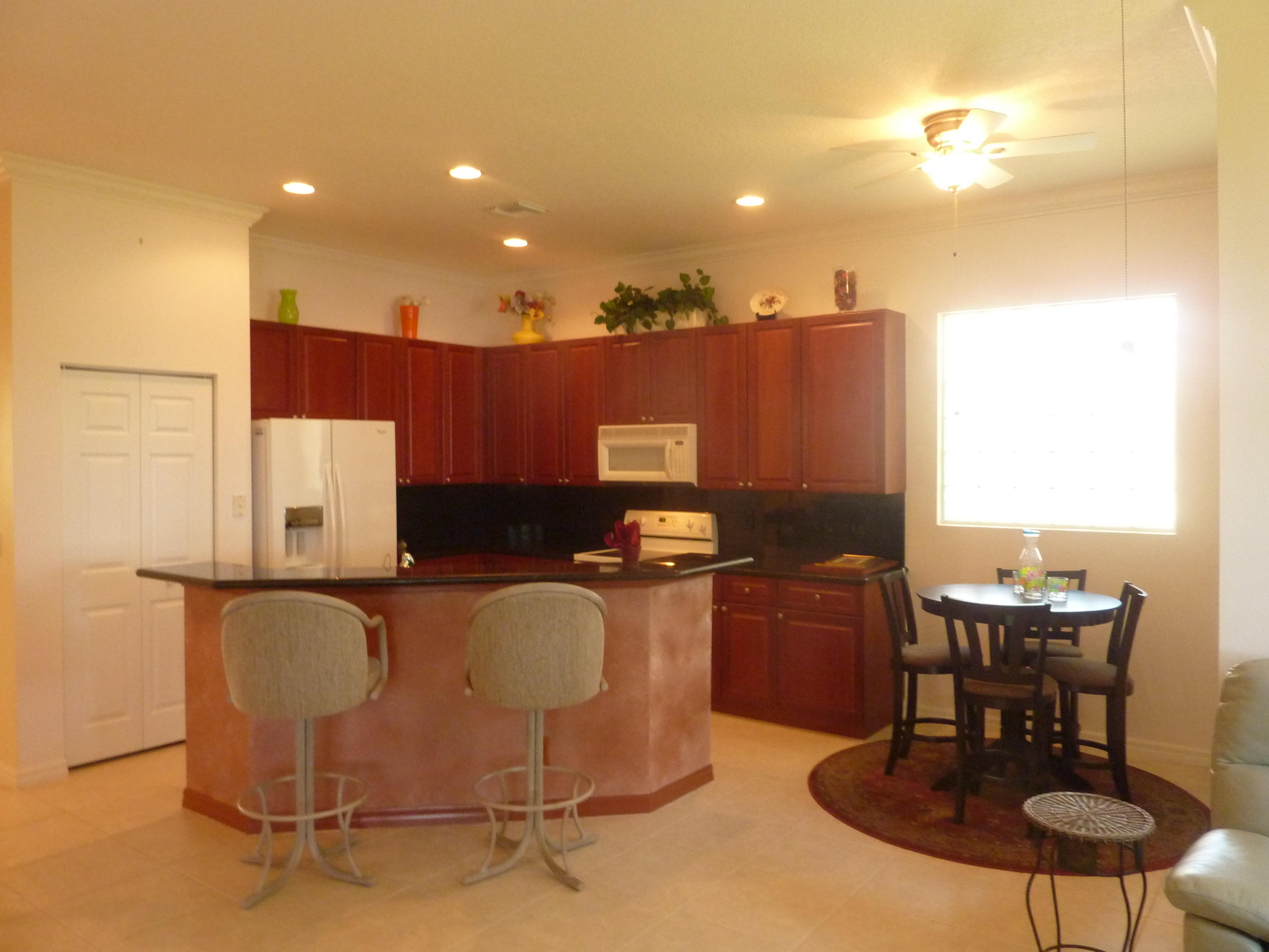 WHAT A VIEW!!! Long lake view from family room, living room and master bedroom. Spacious, open floor plan, meticulously kept 3 bedroom 2.5 bath waterfront home. Neutral tile throughout living areas and wood laminate in all bedrooms. Beautiful kitchen with granite counters and upgraded cabinets, opens to family room which has sliders to the large screened patio with an amazing view of the lake. Split bedroom plan which is great for children and guests. Spacious master bedroom, with tray ceiling, with sliders to the large screened patio as well. Two large closets in the master bedroom and Jacuzzi tub with separate shower in the master bath. Formal dining room has tray ceiling as well and is perfectly located across from formal living room and next to kitchen. Crown molding throughout main