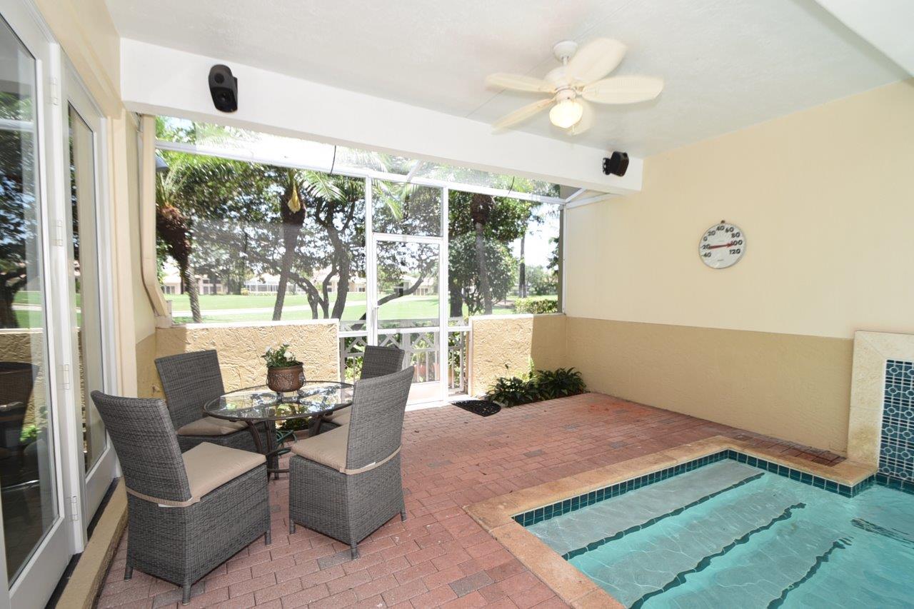 Offering tranquil golf course views, this completely renovated 2-story townhome beauty features volume ceilings with crown moldings & extra high-hat lighting; neutral tile & carpeting; spacious Living room with a coral fireplace; open kitchen with white 42'' shaker-style self-closing cabinetry, granite counters & backsplash, large pantry, stainless steel appliances & water filtration with instant hot; remodeled Master & secondary bathrooms upstairs; plantation shutters & wood blinds; custom closet design; newer washer & dryer; impact glass French doors around a charming courtyard offering covered and screened areas, a retractable awning & a private resurfaced splash pool overlooking the golf course. The roof is about 5 years old; the air conditioning about 4 years old. Just move right in!