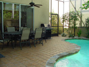 Light & bright, this lovely two-story home of 4 bedrooms & 4 baths is absolutely pristine & tastefully appointed offering volume ceilings with plenty of sunlight. The open kitchen features white 42" wood cabinetry with pull-outs,granite countertops,tumblestone backsplash, new dishwasher & refrigerator,instant hot & a charming breakfast nook. The floors are beige tile in the living areas,wood-grain tile in the second bedroom & neutral carpeting in the Master & other secondary bedrooms. This lovely home also offers custom window treatments, verticals & wood blinds; walk-in closets with custom closet design in the Master; new commercial-grade washer & dryer; extra storage & premium flooring in the garage. The outdoor screened patio is inviting with a tropical freeform pool with stone coping.
