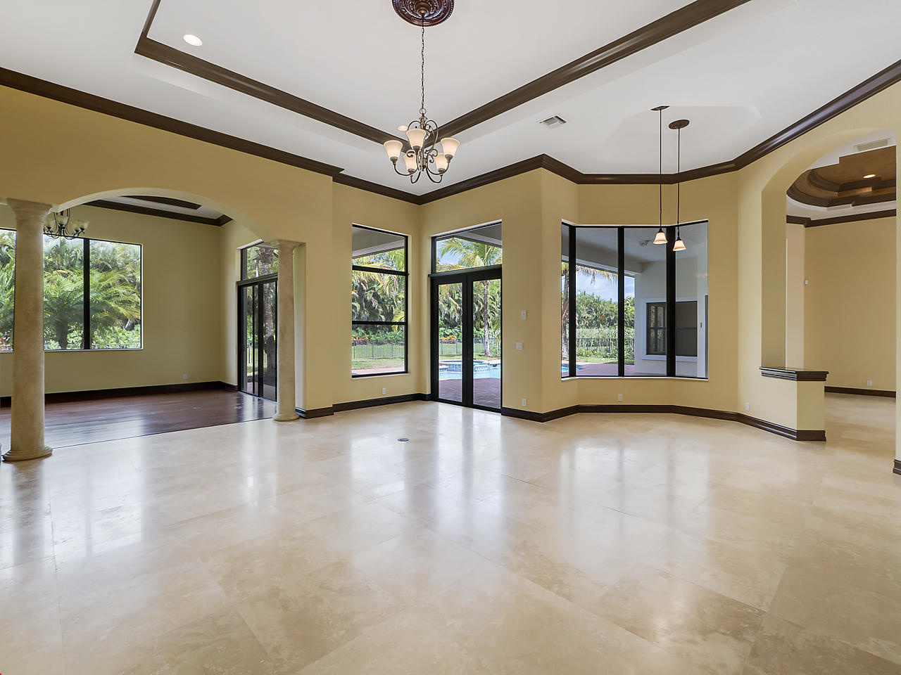 Modified Estancia model built by Delcrest at The Club at Ibis's spacious subdivision The Preserve. New landscaping & circular driveway great you as you approach this stately home. Wrought iron gates allow access to double glass front entry doors. 24'' X 24'' Saturnia Tile throughout except bedrooms. The Bedrooms are ready for your choice of Flooring. Crown molding throughout most of the home. Impact glass will keep you at ease during hurricane season, buffer noised & help with savings on your power bill. As you enter the living room notice the double coffered ceiling with crown molding & the great view of the pool, spa & yard. The adjacent dining room also offers double coffered ceiling with crown molding.