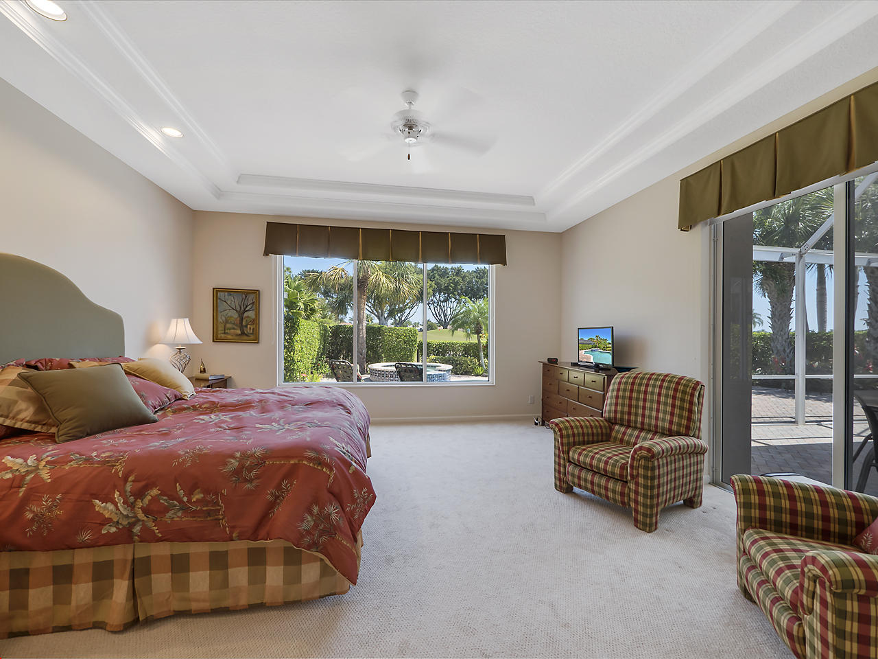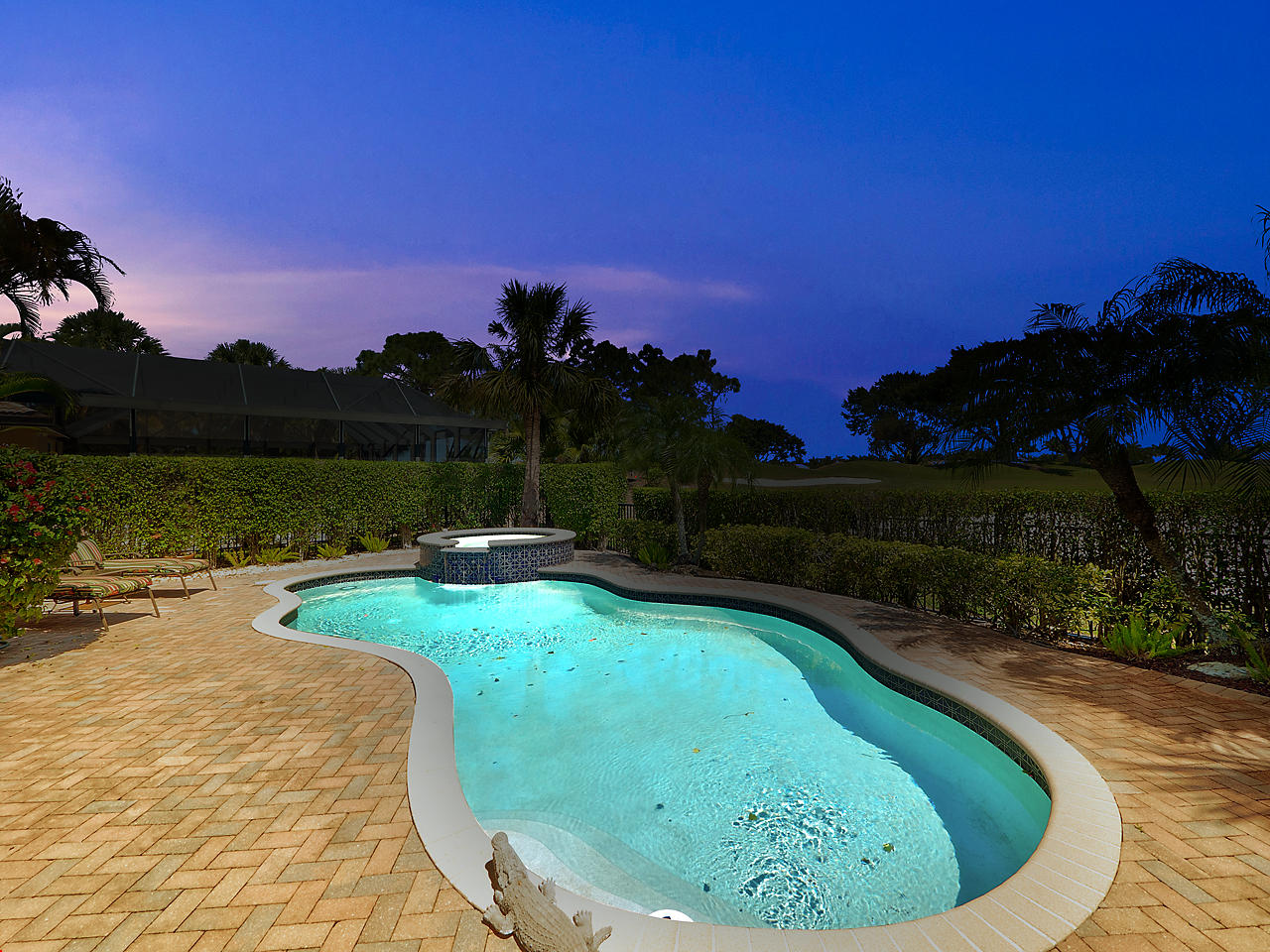 Priced for Immediate Sale! Situated on the 16th Green of The Legend Course, this Home has it all! Don't miss out. Fabulous Outdoor Entertainment Area with Screened and Covered Patio and Open Pool Area with Spa and Water View. The Kitchen, with almost New Stainless Appliances, Granite Counters & Backsplash open to the Family Room with Both Overlooking the Pool and Golf Course. The Master has Double Coiffured Ceiling with Crown Molding and Sliders to the Pool/Patio Area, His & Her Closets and the Master Bath has Corner Roman Tub and Separate Shower with Glass Doors and His and Her Sinks. There are Formal Living and Dining Rooms with Garden Views. Two Guest Suites are in the front of the Home, One with a Private Bath and One with an Atrium. The Den includes Built-in Desk & Cabinets.