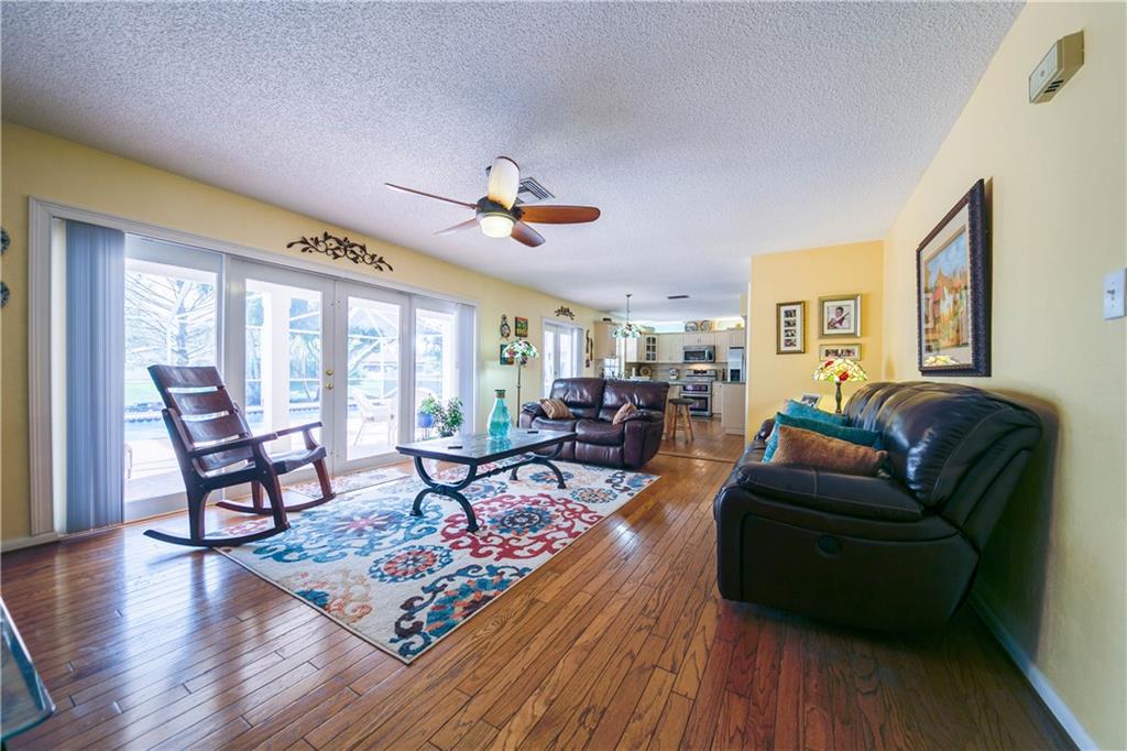 Beautiful & tranquil waterfront setting! Remodeled home with large screened pool & covered patio. Kitchen cabinets & countertops remodeled in 2003. Stainless appliances replaced in the last 2 1/2 years. A/C replaced in 2013. Bathroom 2 beautifully remodeled in 2012! Impact glass French doors in the back, impact glass windows on the sides of the home & impact garage door. Panel shutters for the front of home. Wood & Tile floors throughout home. All bedrooms include walk in closets! Lots of yard for play!