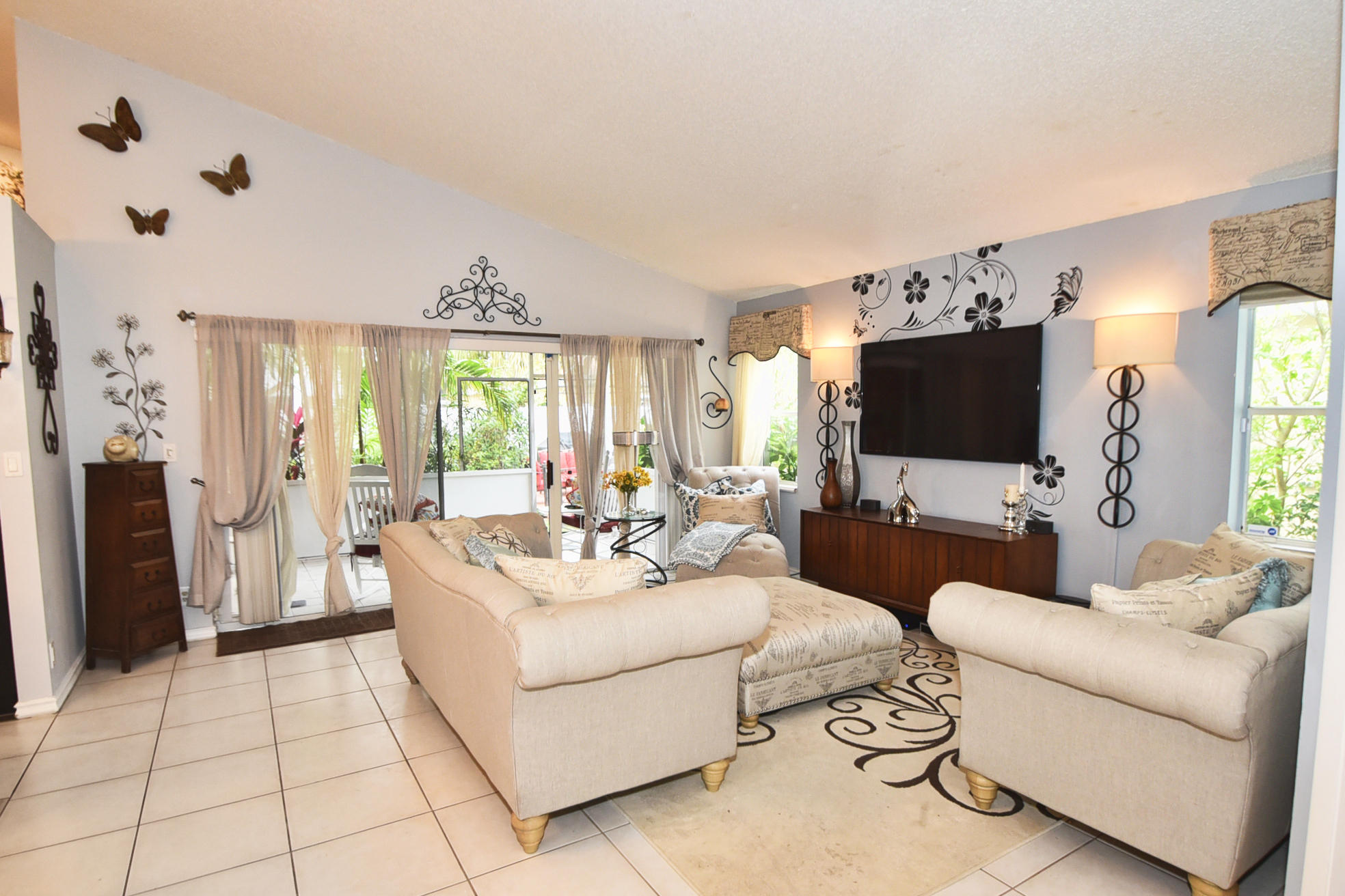 Welcome to HGTV Style!Redesigned and re imagined this huge stylish kitchen has tons of storage and convenient pull outs,lots of counter space, Stainless appliance, glass tile backsplash, granite counters,Farm Sink,12 foot volume ceilings. Move in ready! #LOVEIT#UNIQUE##STAINLESS#VOLUMECEILINGS#SPACIOUS#JUSTWHATIWASLOOKINGFOR!!!Ceramic tile in all living areas with wood laminate in bedrooms lets you enjoy *easy maintenance. No Carpets Here! Updated bathrooms with shaker doors and bead board walls! Large screened in Patio, Fully fenced yard with lots of lush trees plus a Lemon tree and a Mango tree too! New roof and fence 2013 AC 2009 meticulously maintained. True Doll House!Sidewalks thru-out community with Olympic pool plus kiddie pool and tot lot too. Basketballl, raquet ball,tenn