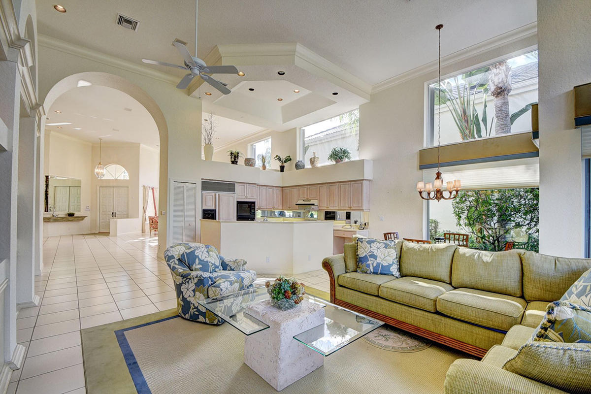 Priced to sell. Enter this beautiful home and be amazed at the open and spacious living areas accentuated by volume ceilings and large, high windows that create a light and bright interior. The island kitchen is open to both an informal dining area and gracious family room - all overlooking the covered patio, pool, spa and gorgeous golf course view. A private, spacious master bedroom also opens to the rear yard. It has two walk-in closets that are custom fit with shelves, drawers and other convenient storage. The master bath with double sinks and separate vanities has marble floors and both a whirlpool style tub and separate shower. An additional bath off the master can easily serve as a cabana bath. The second bedroom is complete with an en-suite bath. A third bedroom faces a picturesque