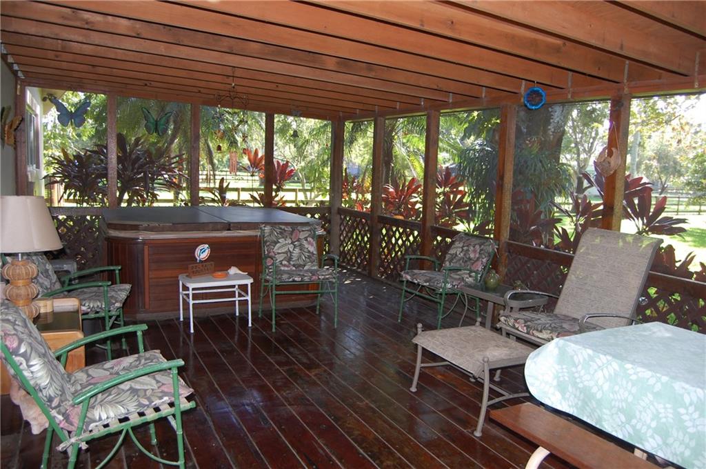 Immaculate 3/2 home with a 2 car garage and large 23 X 43 high ceiling storage building. Located on a 127' X 331' lot with fruit trees and fabulous landscaping. This home has built in cabinetry, impact windows, a large family room, formal living room and dining room. Large screened covered deck with spa / hot tub looks out over the tropical back yard with fruit trees and plenty of shade. Storage building can accommodate a 40' motor home! New deep well with new water treatment system. Call today!