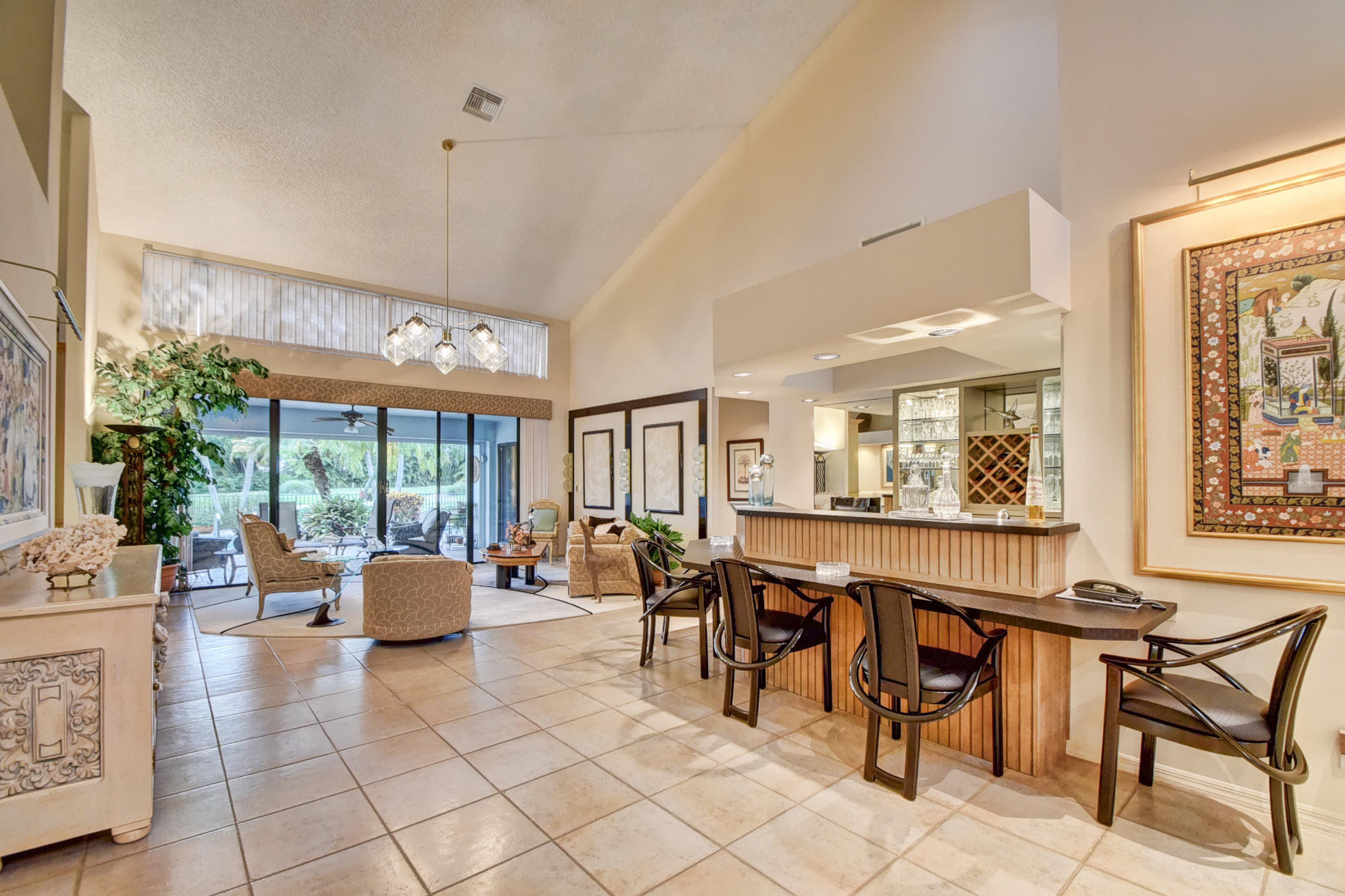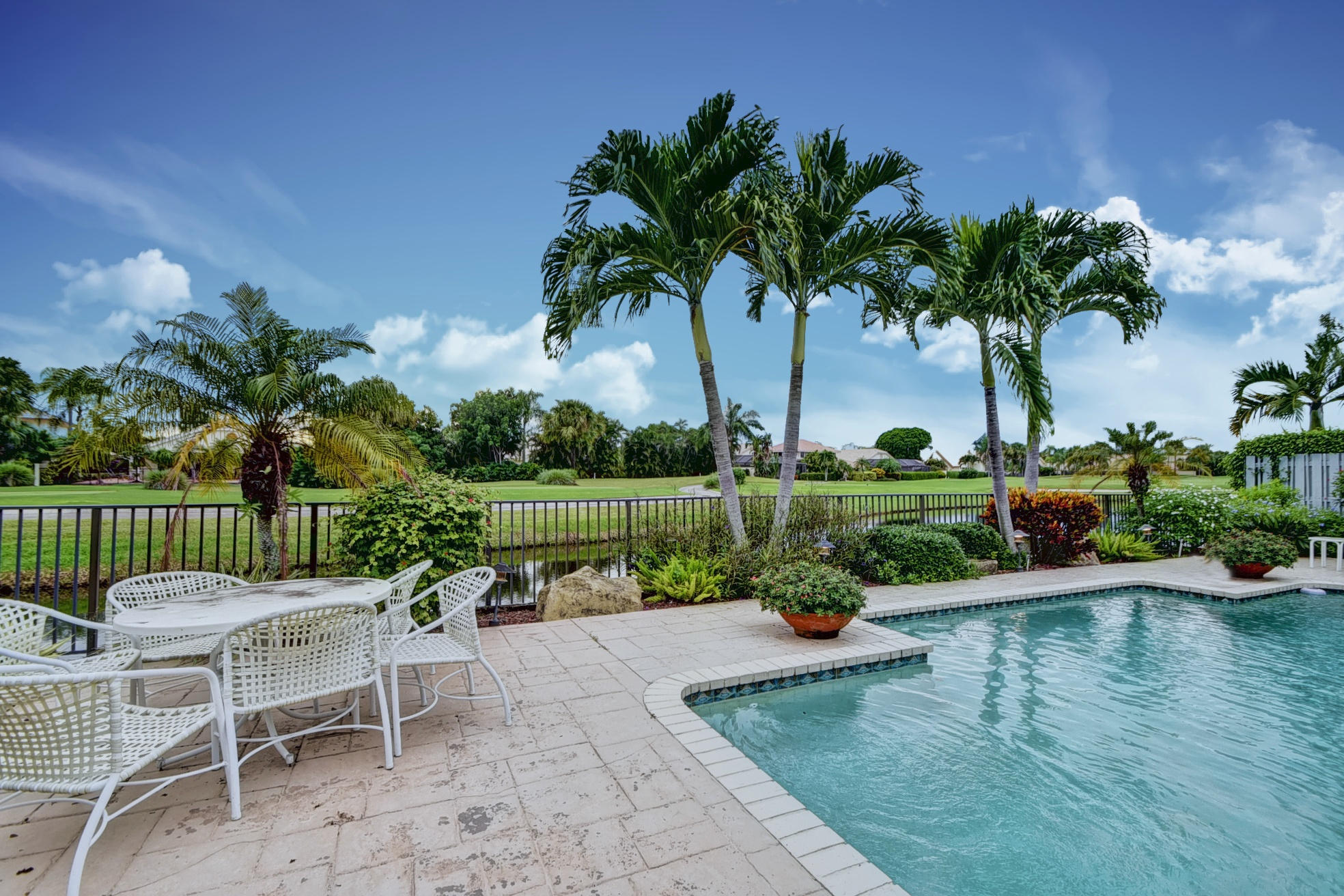 Chapel Creek free standing patio home with western exposure over looking water and the golf course. B Model 3 bedroom, 5 bath double master floor plan. Tiled living areas. Kitchen atrium removed for an expanded and updated kitchen with separate cooking island. Master bathroom area converted into private his and hers separate bathrooms. Custom bar with sink and ice maker. Open pool & patio area with separate covered porch and barbecue area. Hurricane and storm shutters. Furnishings negotiable.