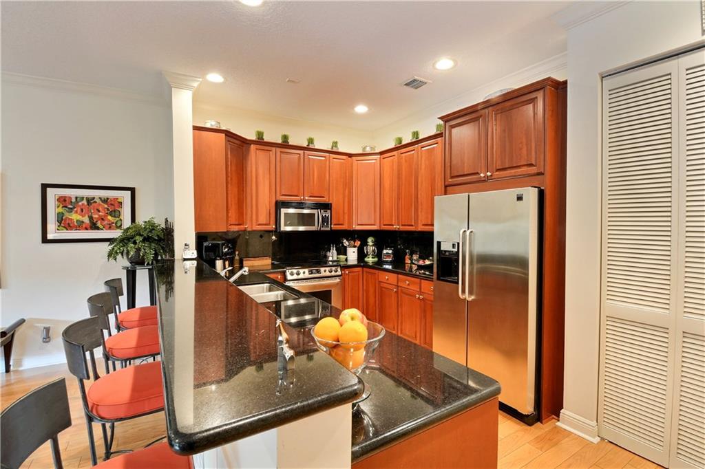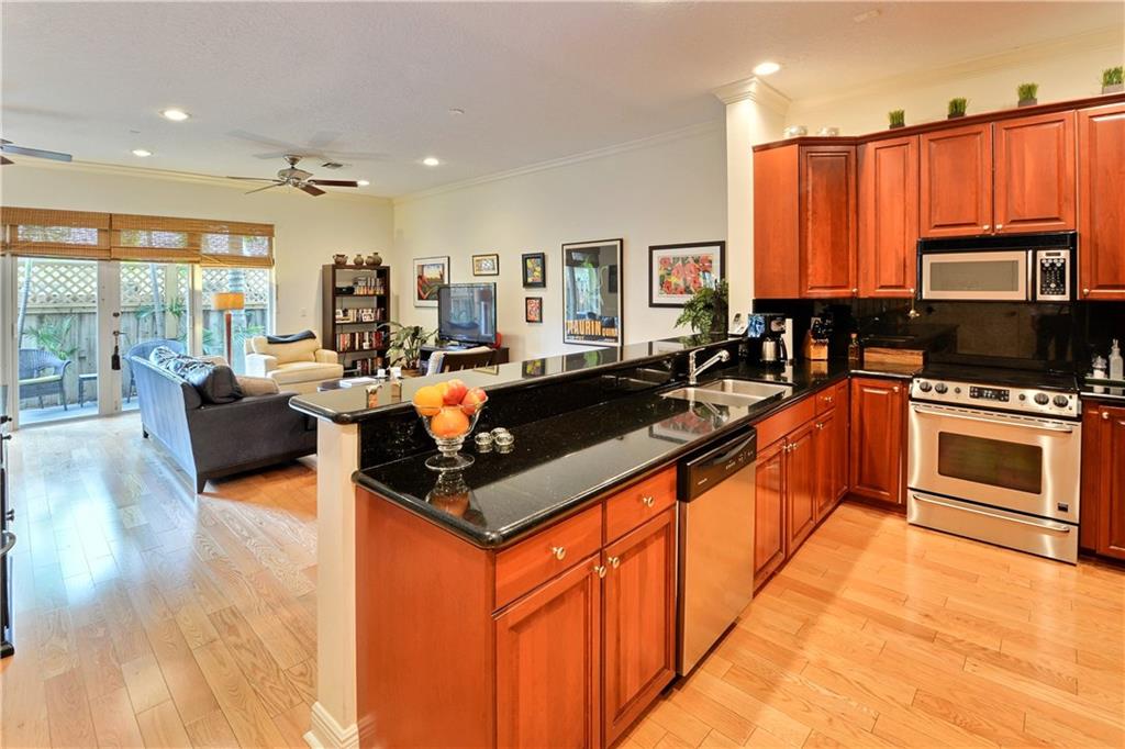 Bright & spacious town home offering an open floor plan with the main living area located on the 1st floor. The chef kitchen with great counter space over looks the living room and dining area. A glass wall with French doors affords access to the private & fenced decking area. 2nd floor open loft area (or 3rd bedroom), laundry & large master suite with a custom walk-in closet, lavish bathroom & balcony. Private roof top terrace with tropical breezes & city views. Square footage from survey.
