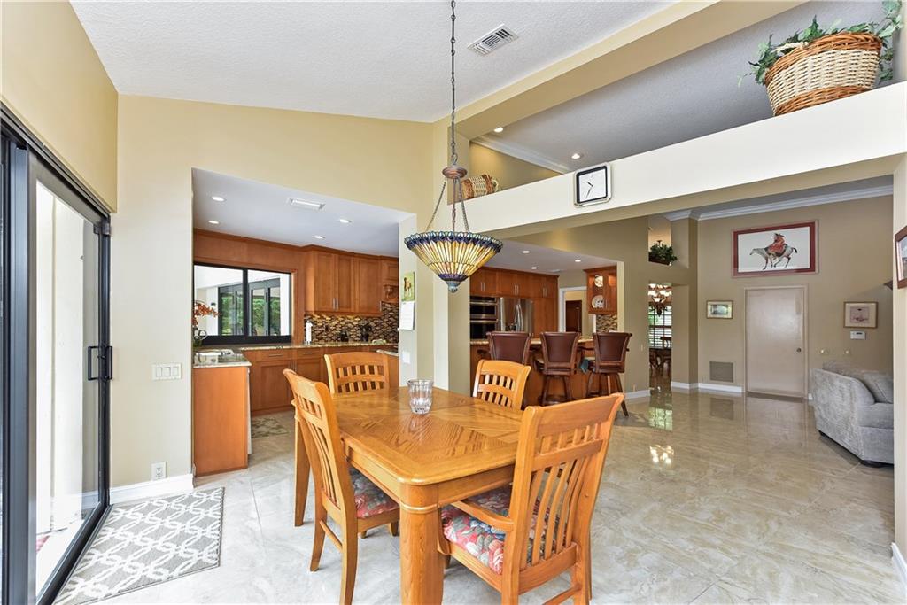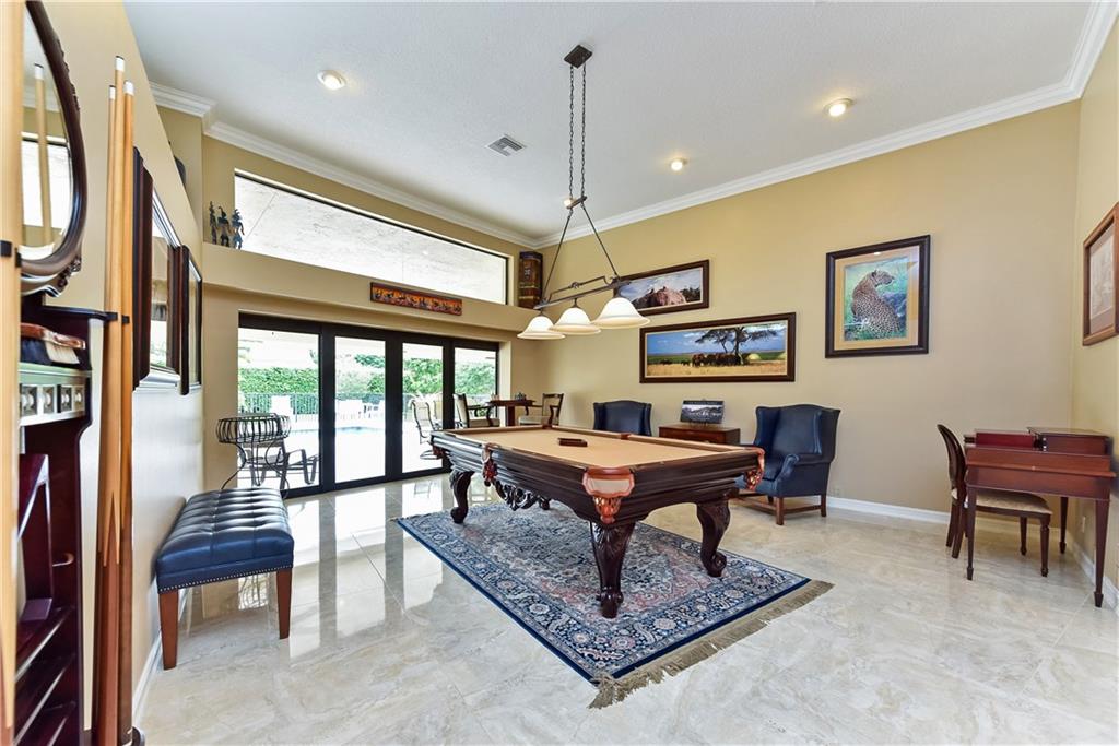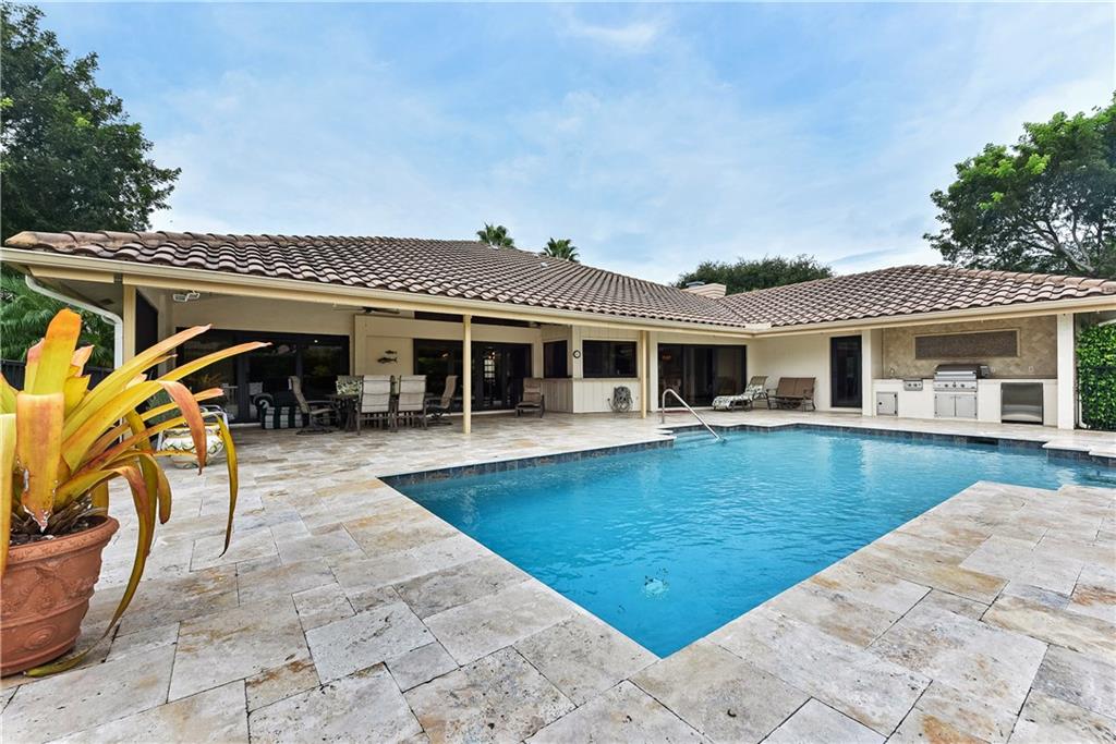 This completely remodeled home features: 24" marble-look flrs thru-out main area; built-in wetbar w/granite & FPL w/mahogany mantle, stacked stone & marble hearth; plantation shutters & crown molding; kitchen w/maple cabinets, granite & built-in LG appliances; spacious master w/custom closets; master bath w/limestone flr, frameless & marble shower, Jacuzzi tub & private bidet & commode; numerous impact windows & '07 roof; stone paver patio, outdoor kitchen, stunning yard (15+ fruit trees!) & open pool!!