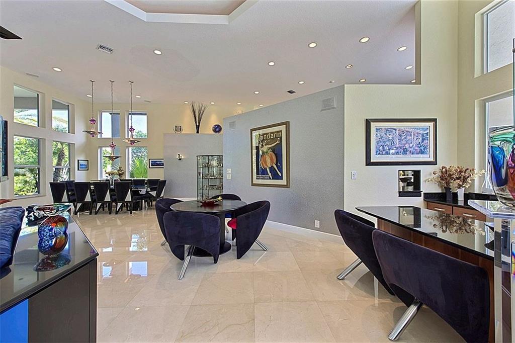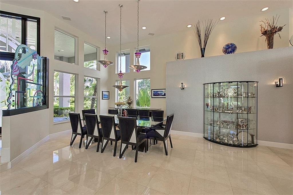 Spectacular lakefront home with dock, a rare find! Unobstructed sweeping views of 125 acre navigable lake. Aprx half acre lot with 100ft on water. 6 BRs + maids room, office & computer room. Updated, upgraded from 24 inch marble to impact doors & windows + newer roof! State of the art custom kitchen incl. 6 burner gas cooktop, huge great room with entertainment bar, dining room & large breakfast rm. Enormous patio, 20x40 pool & outdoor kit. Circular drive with porte-cochere. Exclusive & 24 hr guard gated