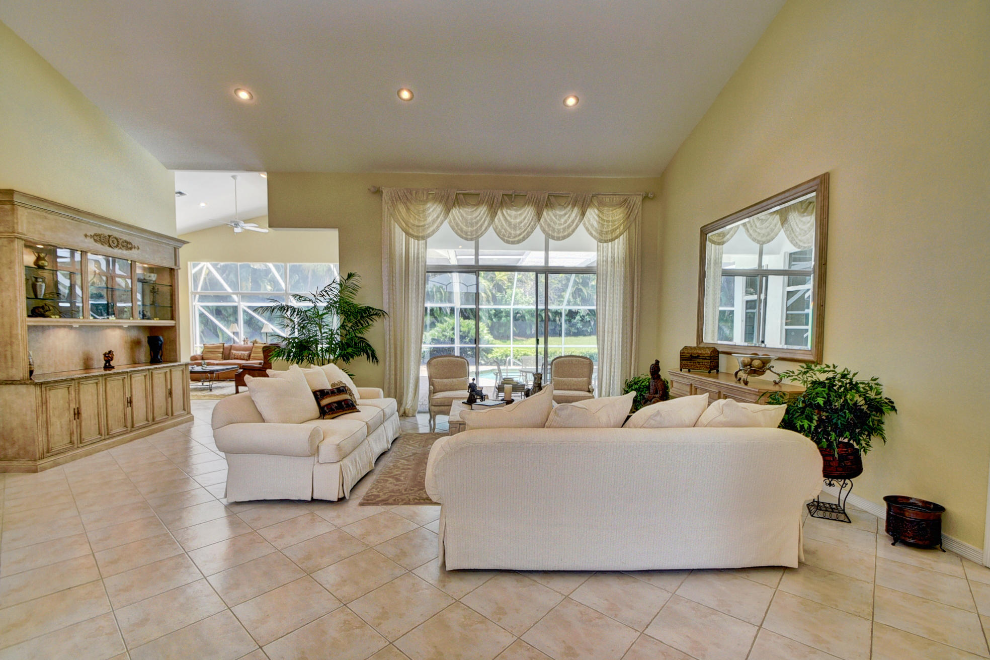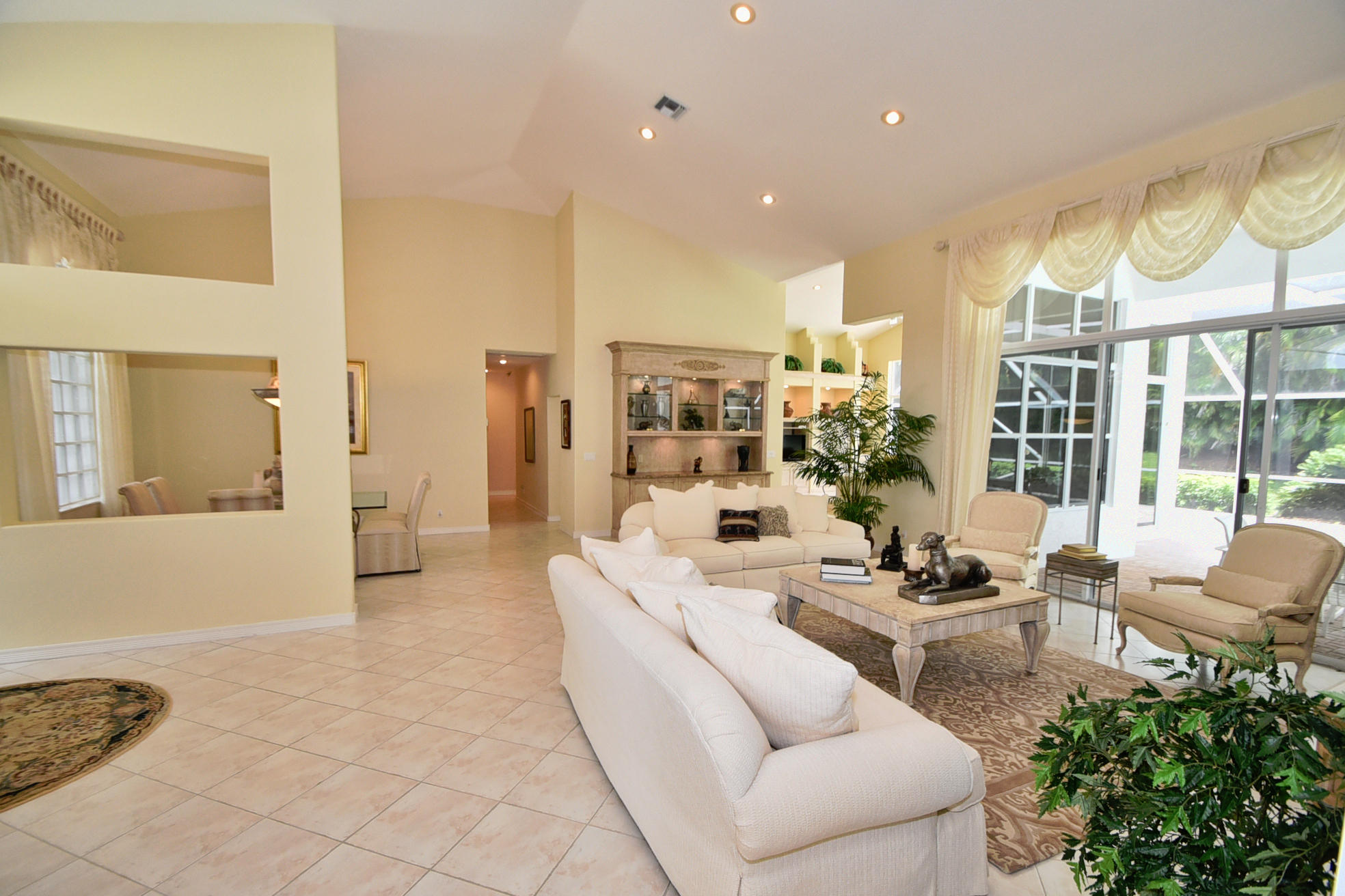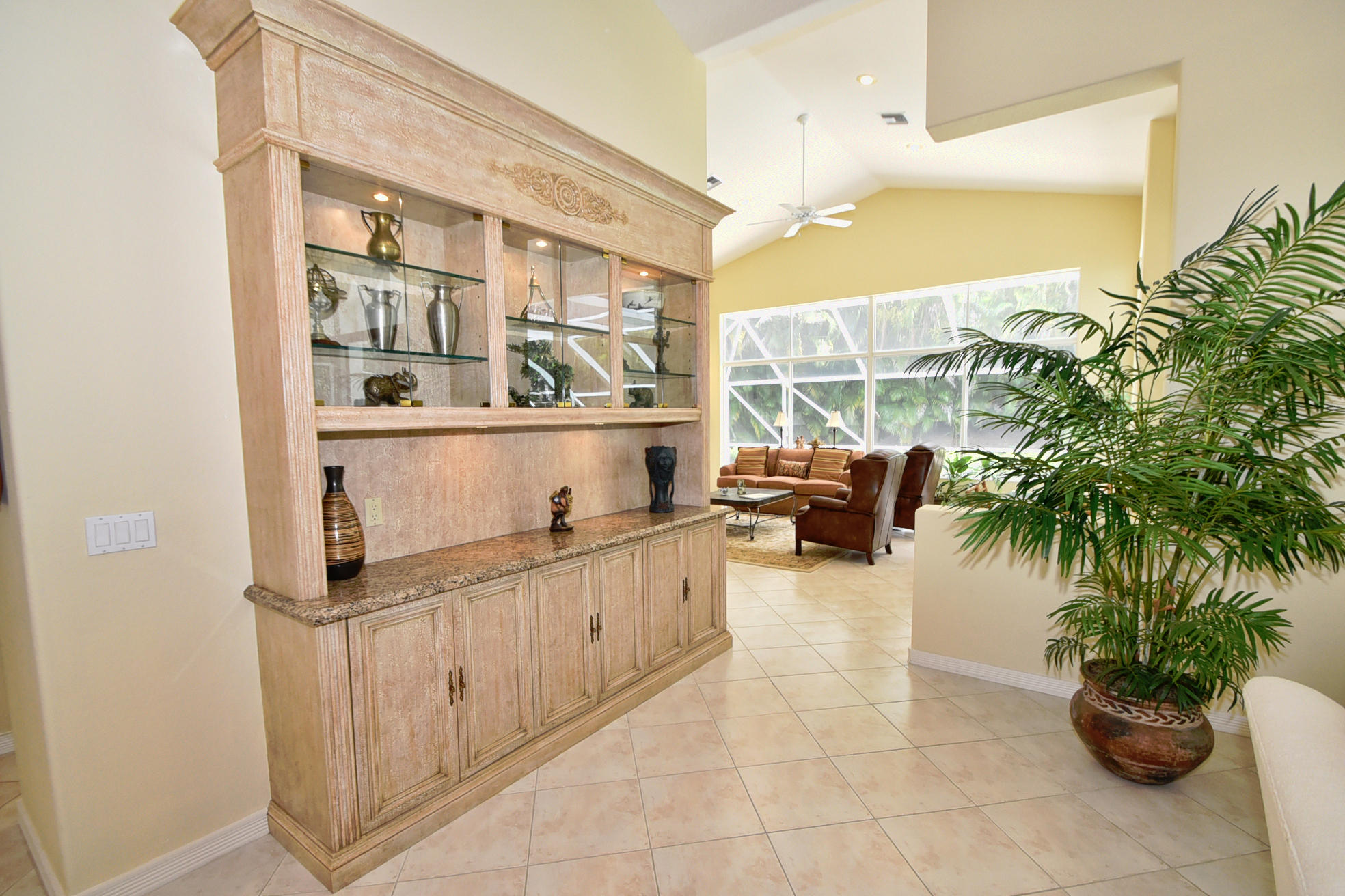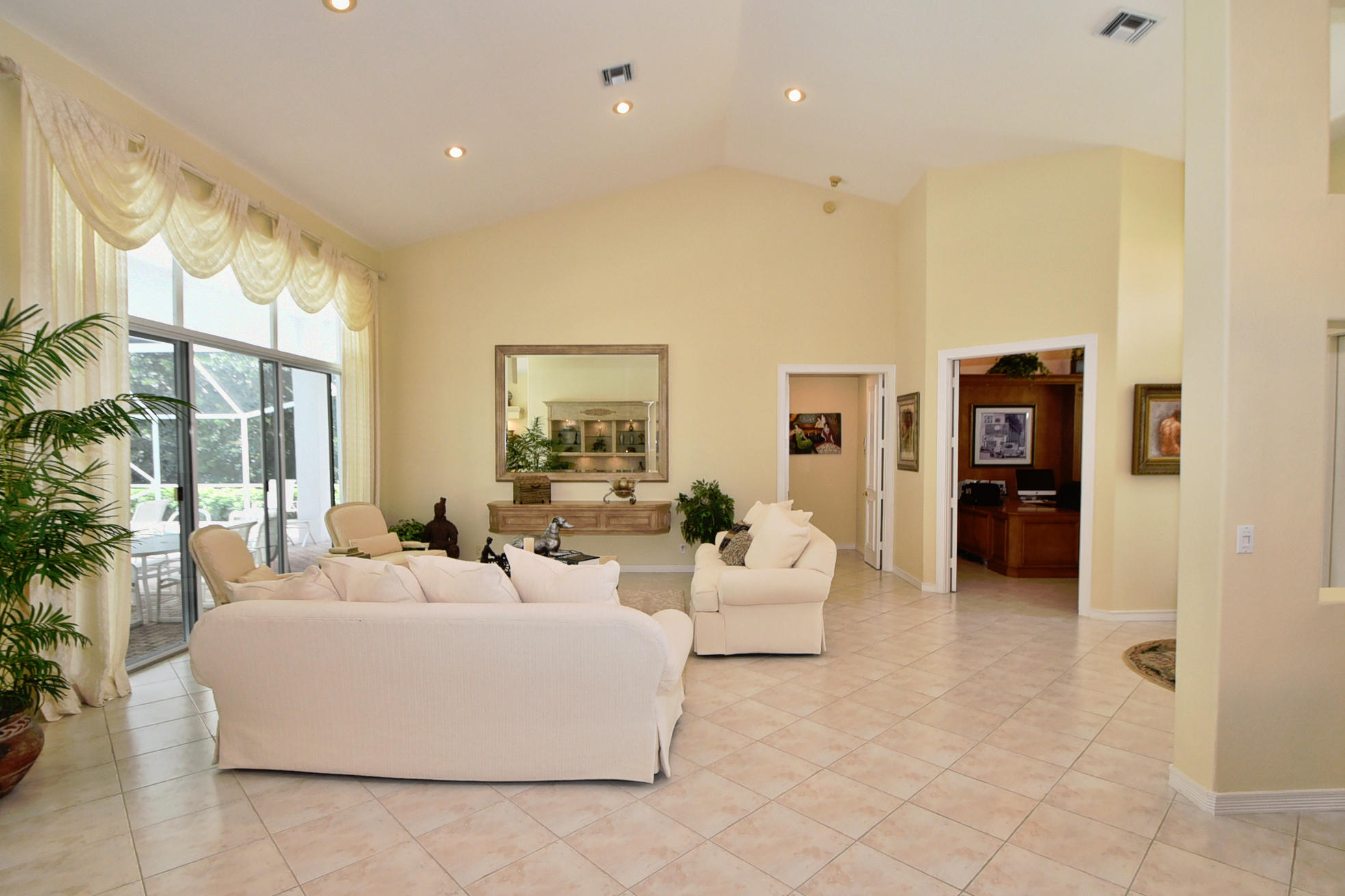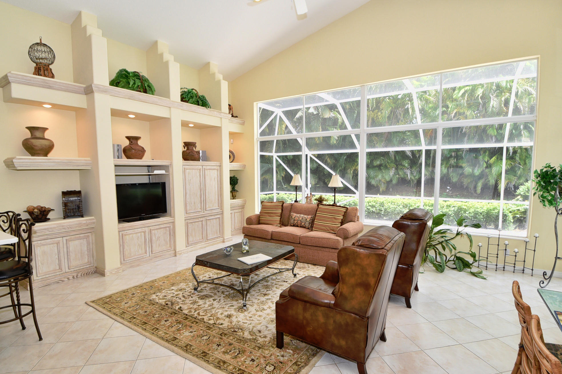 Wonderful, open & very bright 4 bedroom 3 full bath home. The 4th bedroom is a built-in office w/ designer wood cabinetry. Desirable white lacquer cabinets in the kitchen. Neutral tile floors, split bedrooms, custom built-ins, roomy closets, screened patio and a replaced roof. Topped off w/elegant circular driveway. JUST REDUCED! PRICED TO SELL! FURNITURE AVAILABLE.Mandatory membership country club-LIVE THE LIFESTYLE!!