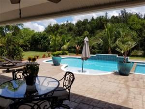 Beautiful, well maintained, cape style 4 bedroom, 3 bath home with Formal living and dining rooms, wood burning fireplace and vaulted ceilings. Split floor plan, master suite with tray ceilings and large walk-in closet with custom built ins. New paint inside and out. The spacious kitchen boasts granite counters and stainless appliances. Step outside to an entertainers paradise with custom oversized tiki, bamboo and granite kitchen, gas grill, refrigerator and sink. Inground pool has a huge jacuzzi area and waterfall. Sitting on 1.19 acres, the home has a concrete driveway, 3 car garage and fully fenced back yard. Security system. Whole house on R/O system. A must see!