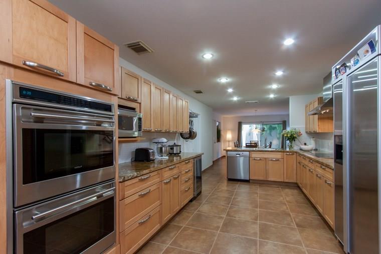 Modern sleek home has many high end upgrades:real wood floors on stairs, stairway has tempered glass with sleek stainless railing, 20x20 imported tiles in all living areas, tiled garage floor, bathroom fixtures are imported from Europe, professional chef kitchen with Wolf appliances inc double oven with convection, pot filler faucet,wine fridge! Vaulted ceilings, gated community, low maintenance, pristine pool, solar heater for the pool, new w/d and much more. Stunning home. Less than 1 Mile to the beach!