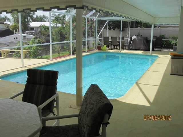4 bedroom 3 bath home located on 80 feet of water, heated pool with screened in enclosure and large covered patio area. New appliances in the kitchen, new tile floors in living,dining rm, hall ways, plus 2 of the bedrooms. There is a 30 ft. deck plus a new boat hoist for up to a 28 boat. There is a variety of fruit trees in a lovely landscaped area. You are close to the beach, shops and restrauants. All of the windows and sliding glass doors have been replaced with hurricane impact glass.