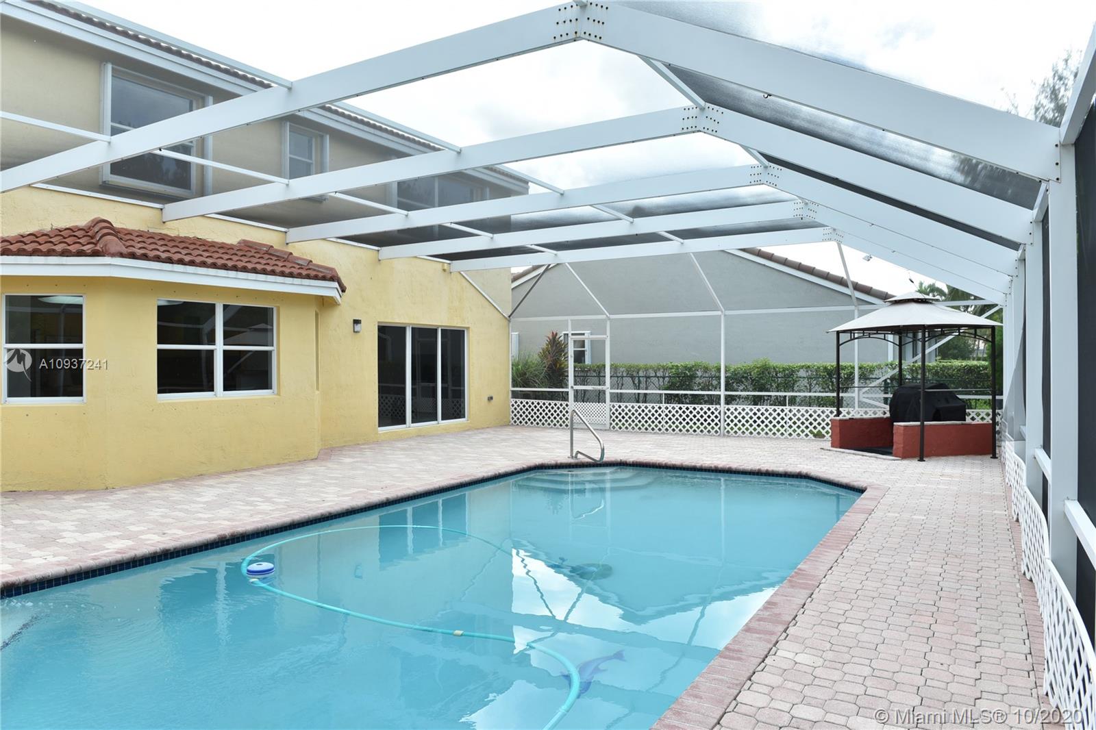 ALHAMBRA GATED COMMUNITY IN WEST PEMBROKE PINES,FL!! GREAT ,2 STORY 5 BED,4.5 BATH, POOL & SCREENED AREA. 3 CAR GARAGE, FENCE PATIO. ALL CERAMIC FLOORS. EAT IN XL KITCHEN WITH ISLAND. GRANITE TOPS, NEWER APPLIANCES, DBL DOOR REFRI, MICRO,RANGE. LAUNDRY ROOM WITH WASHER-DRYER + WASH SINK. ONE FULL BATHROOM DOWNSTAIRS. SECOND FLOOR MASTER SUITE WITH HIS-HER VANITIES,XL SPACE PLUS .>>ACCORDION SHUTTERS @ 2ND FLOOR, PANELS @ FIRST FLOOR