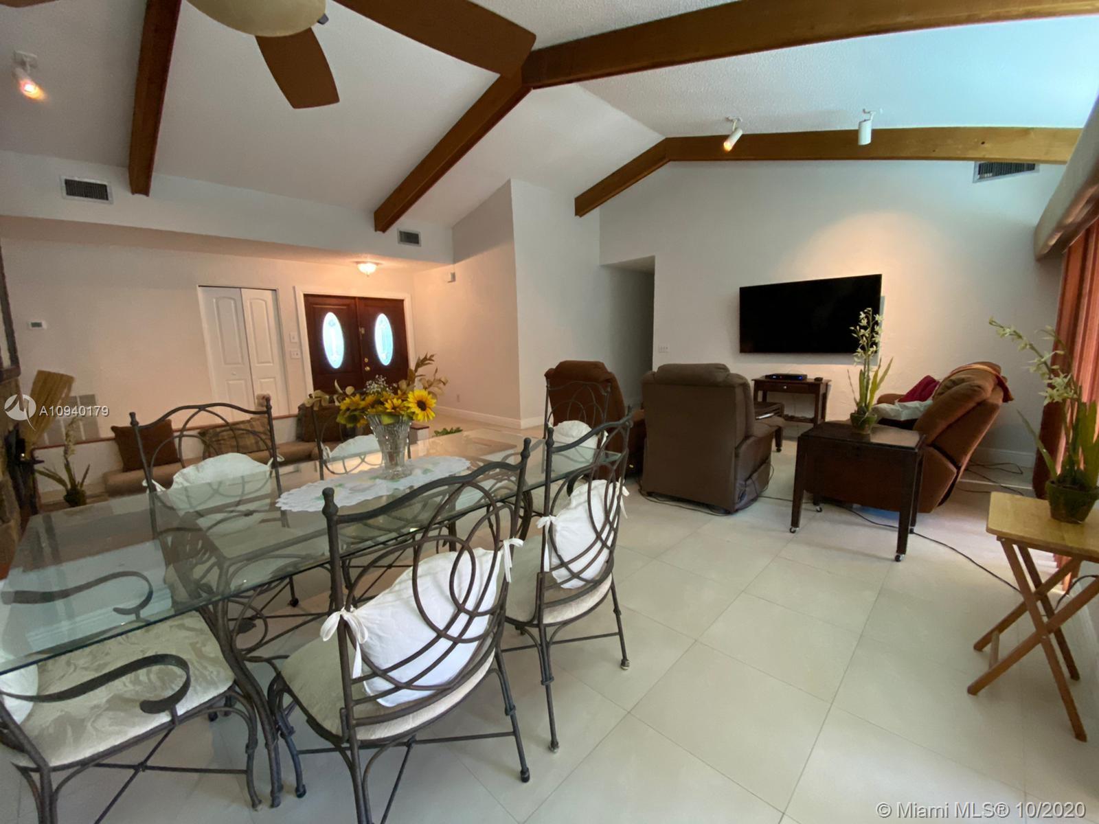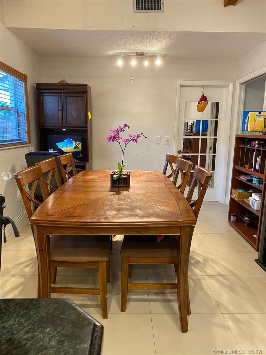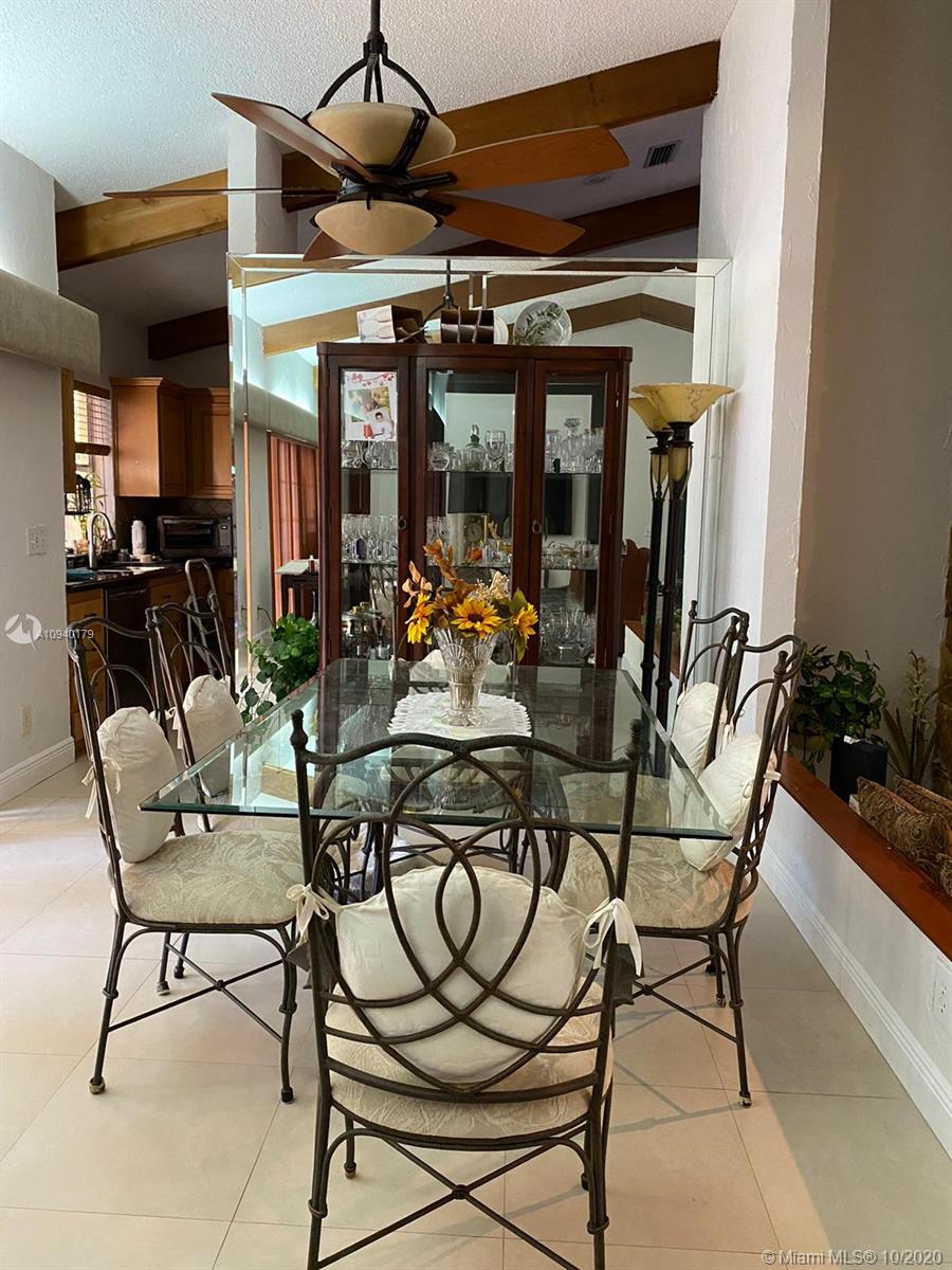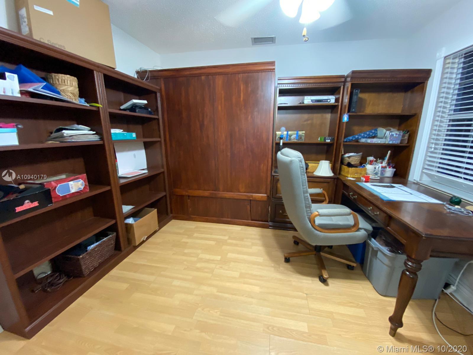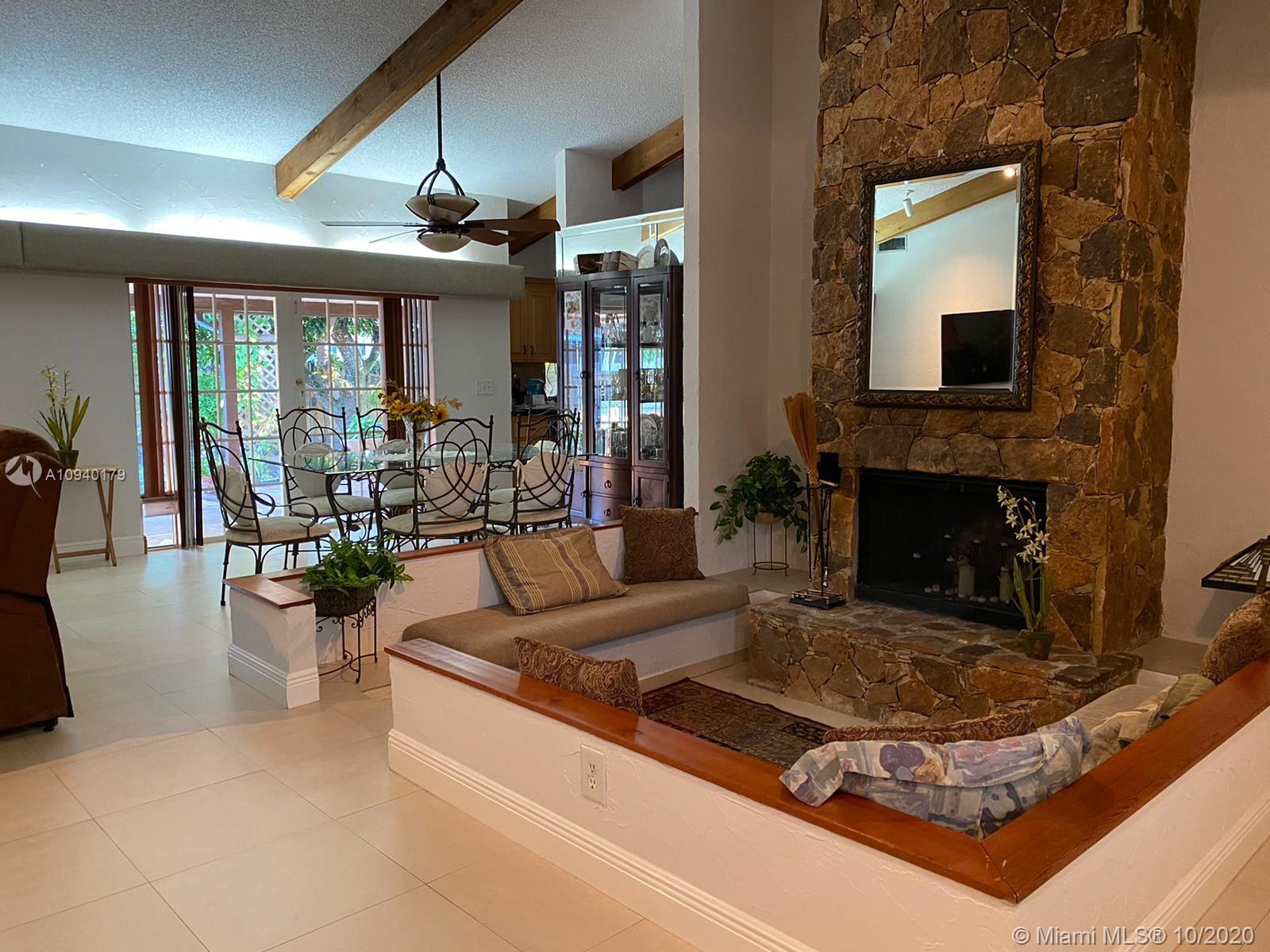 Lovely 3 bedroom 2 bathroom with functional fireplace and 2 car garage home with laundry room. in Pembroke Lakes. Large 1900 + sqft home with large front and rear yard. Covered patio to enjoy the back yard. Large tile throughout the home. Updated kitchen with stone counter top. Sunken Fireplace with seating area to enjoy evenings next to fireplace. Desk, bookshelves and murphy bed in 3rd bedroom is staying and will not be removed. Sold AS IS. 1/2 bathroom in hallway was done by owner, buyer has the option to accept the 1/2 or request owner to convert it back to closet. Roof was replaced in 2008.