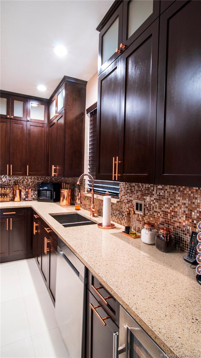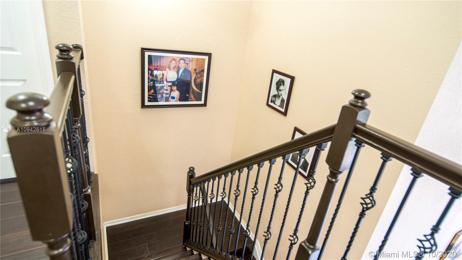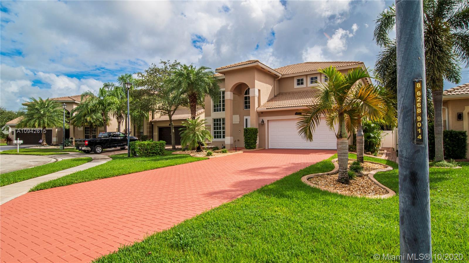 Beautiful corner home with water view on a cul de sac street. New kitchen and new downstairs bathroom. Wrought iron staircase stairs and 2nd floor wood floors. New 24x24 italian porcelain tile in 1st floor. Custom cabinets in laundry room. Air conditioned garage. All new appliances including new tankless water heater and new A/C unit. The pool has been remodeled. All new pool equipment including heater for pool. Travertine backyard with custom 500 sq foot terrace 900 sq artificial turf park. PVC fence whole property. Landscape over 45 palm trees between front and back. 8 car drive way. No house in front or back. Property will not last!