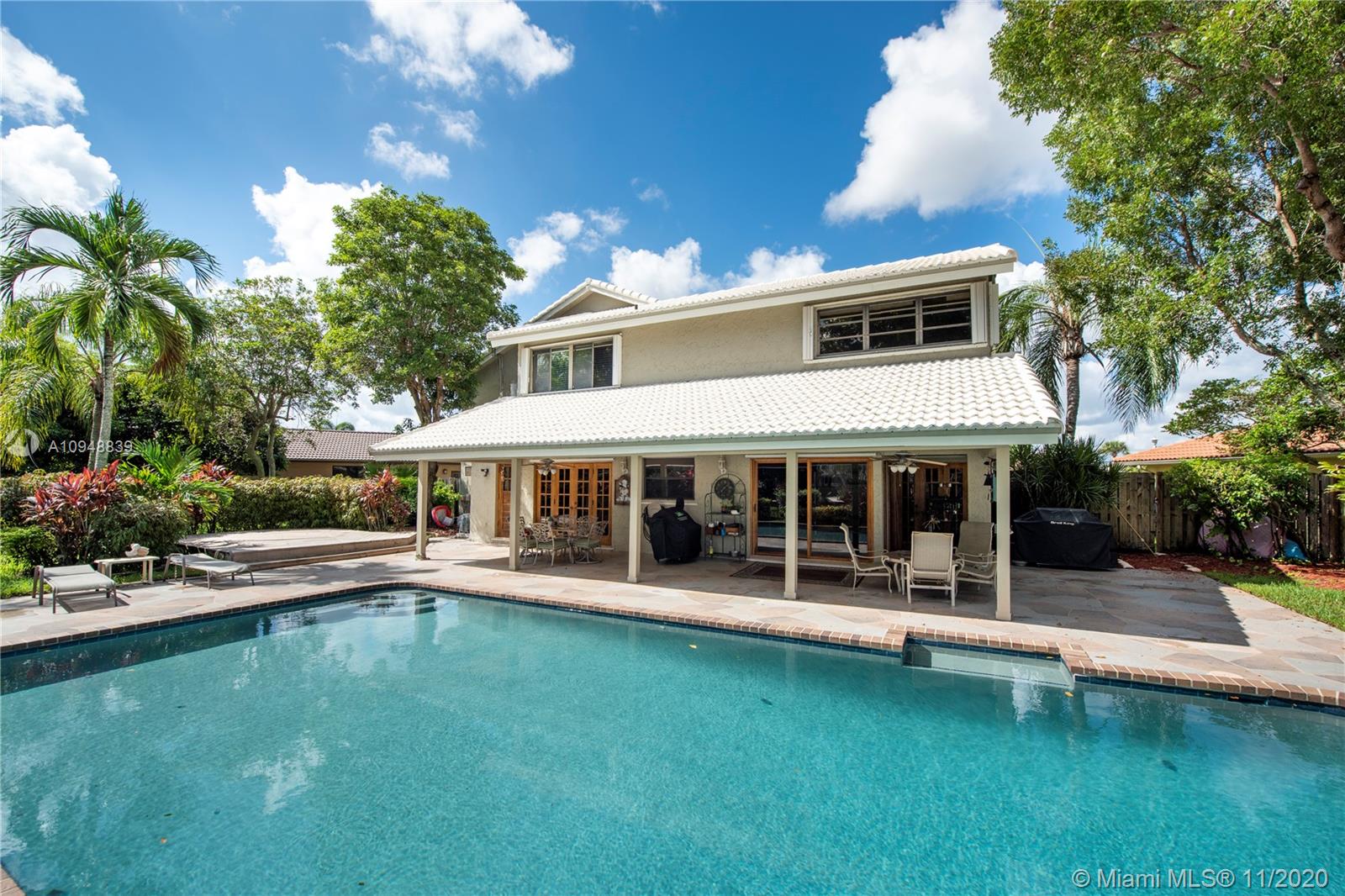 Rarely available over sized lake front lot in Jacaranda Lakes. Fall in love when you walk thru the front door of this well maintained two story home. Large formal living & dining room, wood burning fireplace, open kitchen with oak cabinets/granite, pantry, ample storage, stainless appliances, including trash compactor, less than 3 years old. Breakfast nook overlooks beautiful lap pool, huge covered porch, peaceful view of lake for amazing backyard gatherings. One full cabana bath downstairs, 4 bedrooms 2 full baths on second floor. Master has soaking tub, additional room that can be used as nursery, office, library, oversized custom walk in closet, one bedroom with balcony. Beautiful architectural details abound, from wood accents, custom niches & marble floors. See attached fact sheet.