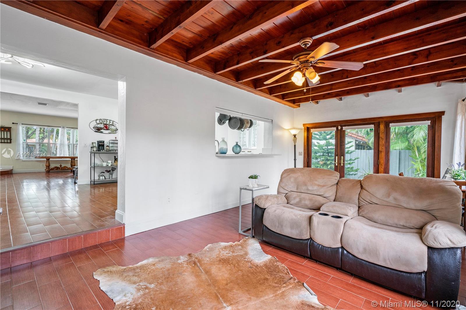 Large spacious home high-ceilings, open format. Lots of light. Updated kitchen quartz countertops and eat-in counter. Wood-beamed ceilings and Anderson windows overlooking backyard, ample room for pool. Oversized bedrooms large closets. Master bathroom floor ceiling marble. Guest bathrooms remodeled. Bonus semi-converted 2.5 car garage, adds an additional 650 sq ft; total 2735. Impact windows and garage door. 4 point inspection, gives roof another 20 years.