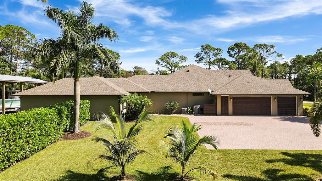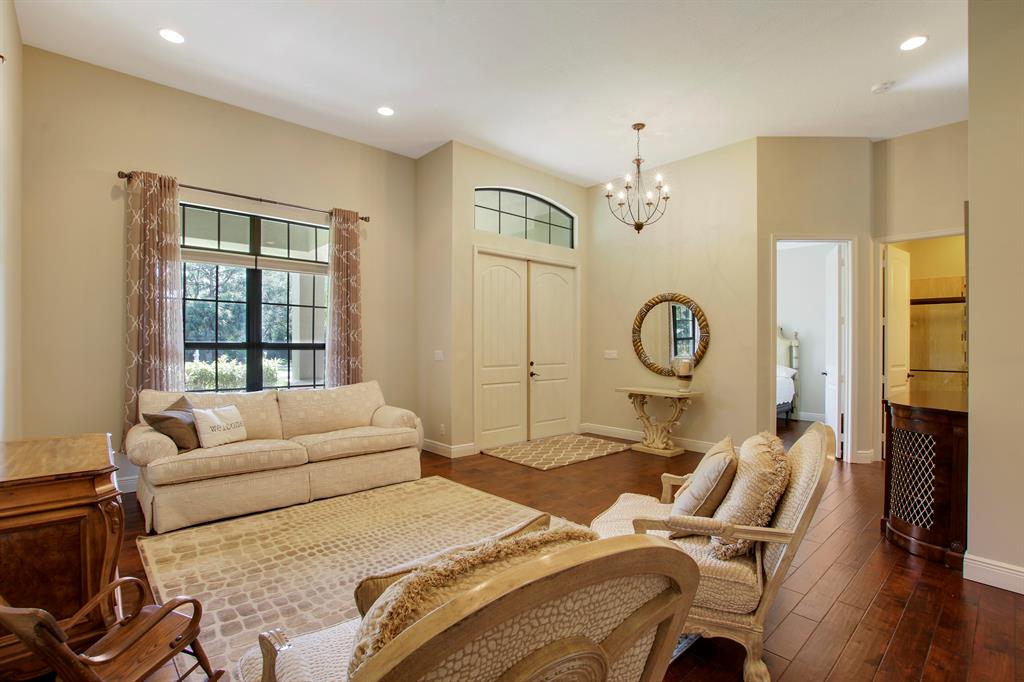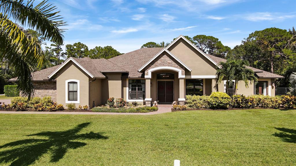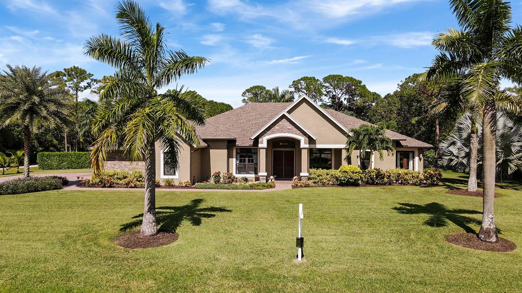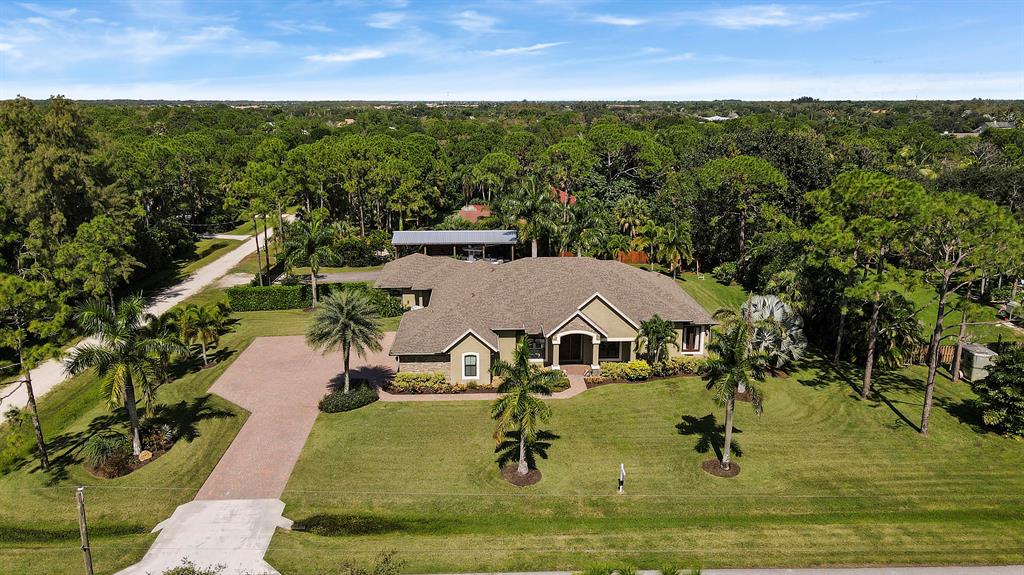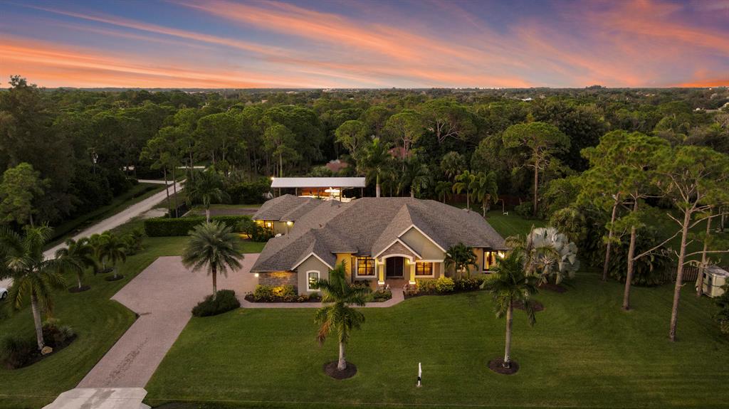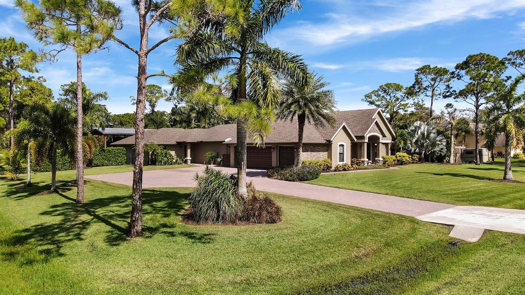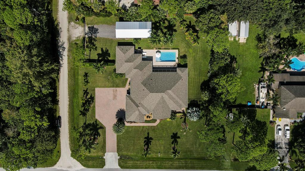 This stunning estate home is built on an oversized 1.32 acre corner lot on a paved road in the highly desirable community of Palm Beach Country Estates. This 6 bedroom, 5 bath pool home has a formal living room, spacious family room, complete custom chefs kitchen, 2 huge master suites, impact windows, 20 foot ceilings and gorgeous wood floors throughout. The gourmet custom kitchen boasts custom soft close cabinets, granite counters, GE Monogram series 6 burner with griddle, Frigidaire professional full size refrigerator and freezer, Custom Thermador built-in coffee/espresso maker, ice maker, Haier wine cooler, custom backsplash and huge kitchen Island with electric, sink and cabinets. Both master suites have custom designed bathrooms and huge custom built walk-in closets for any wardrobe.
