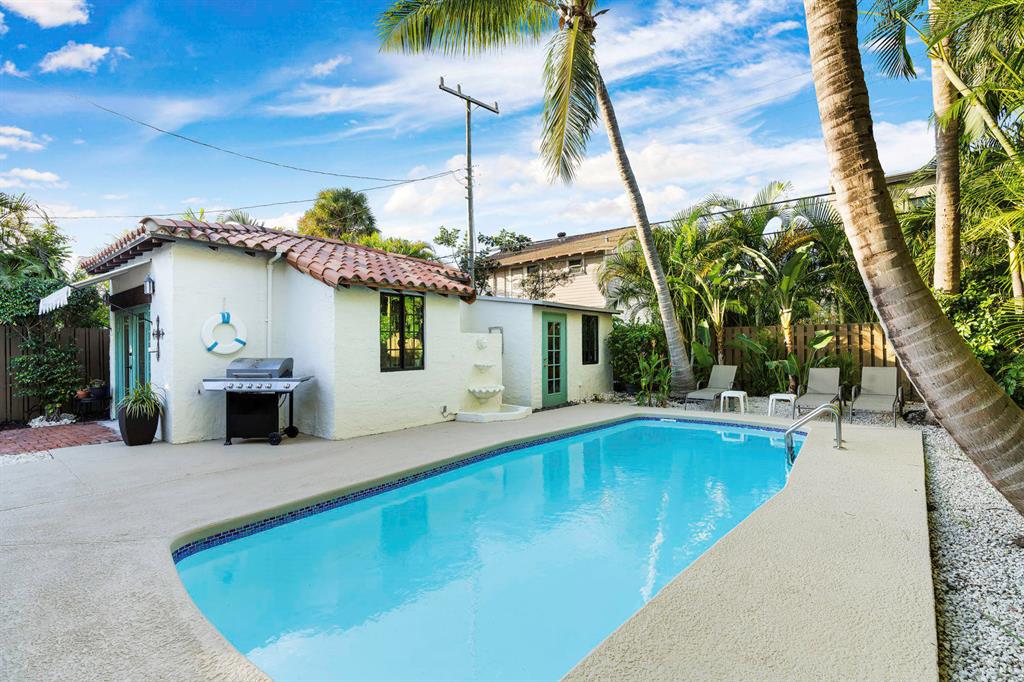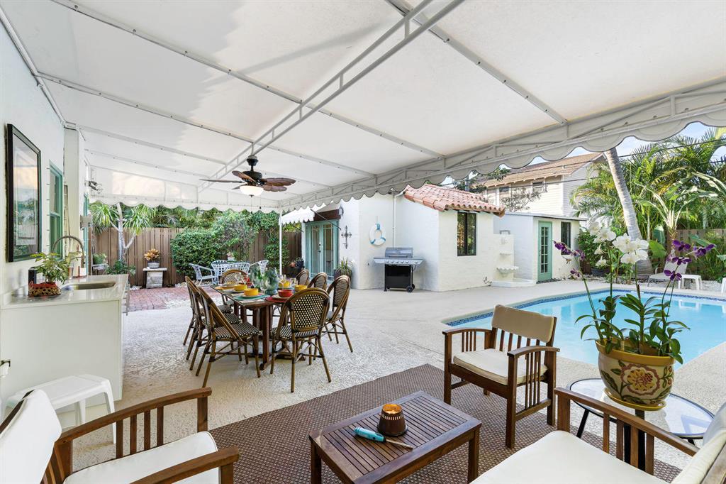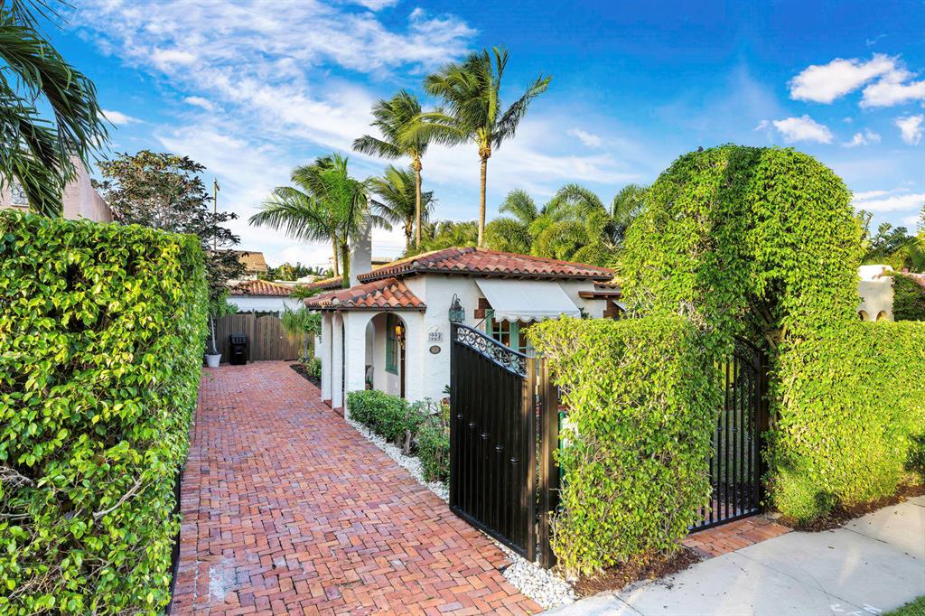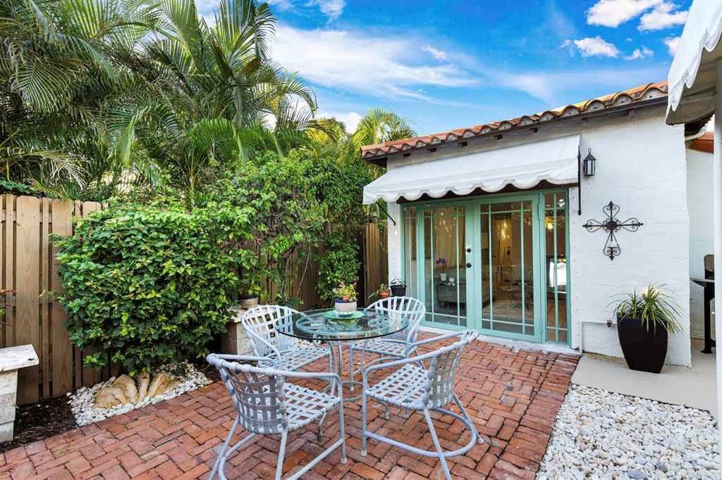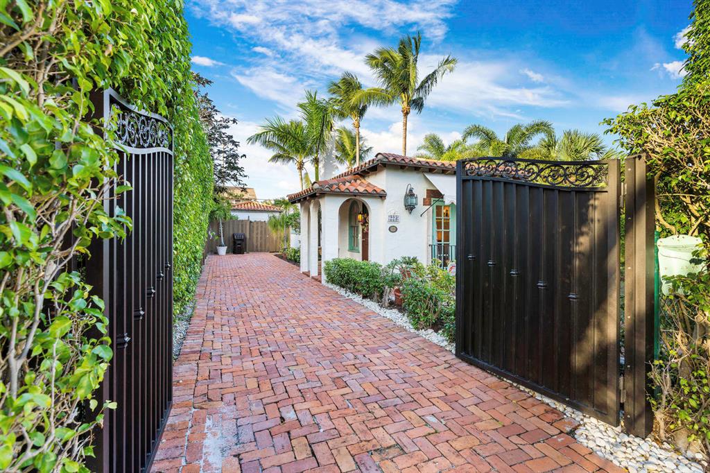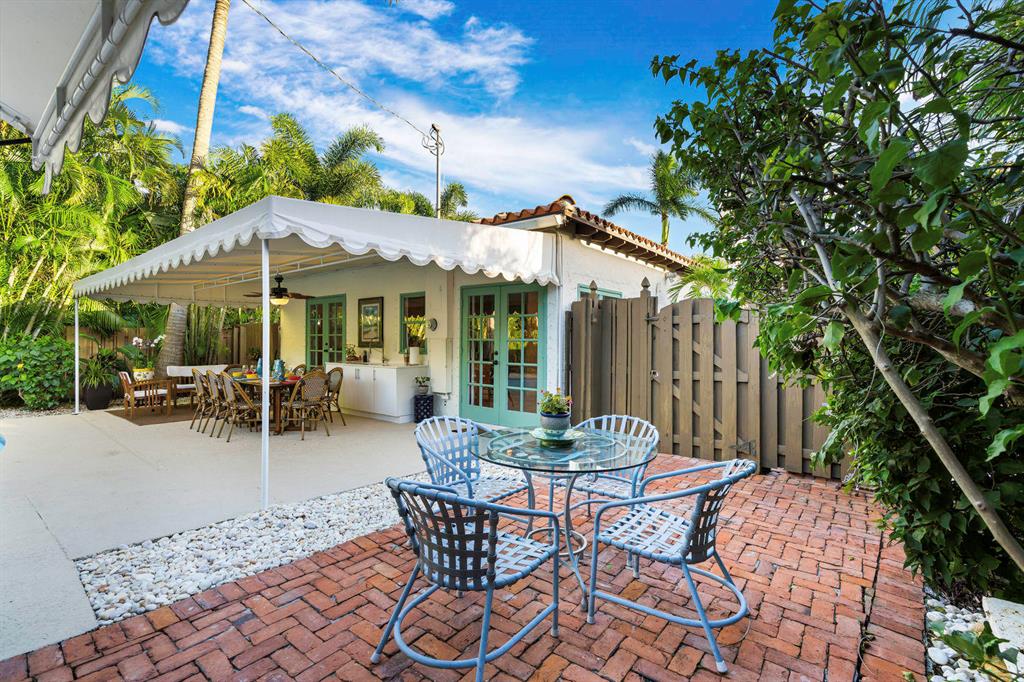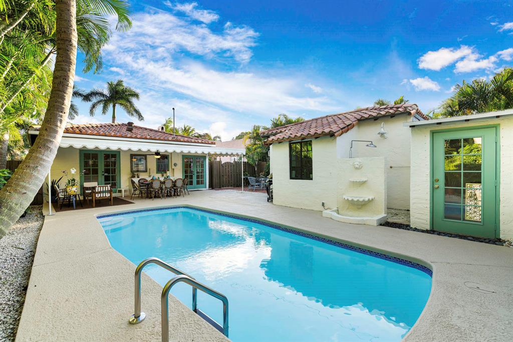 Walk to the intracoastal and Antique Row. Beautifully renovated Mizneresque Spanish Mission with a guest cottage. This home shows like a jewel box, you walk in to the formal living room with Pecky Cypress ceilings and beams, original cast stone fireplace mantel and original brick floors. The main house has 2 bedrooms, the master has a sitting room or office that opens to the living room. The kitchen has been updated and a laundry bar added with a granite top that is also a bar/counter with seats opening to the dining room. The patio is like another family room, with a wet bar, and new covered awning. The pool has been completely re-built w/LED lighting and all new equipment including an electric heater. The guest cottage is a full 1/1 with laundry and a legal rental. Lushly landscaped.