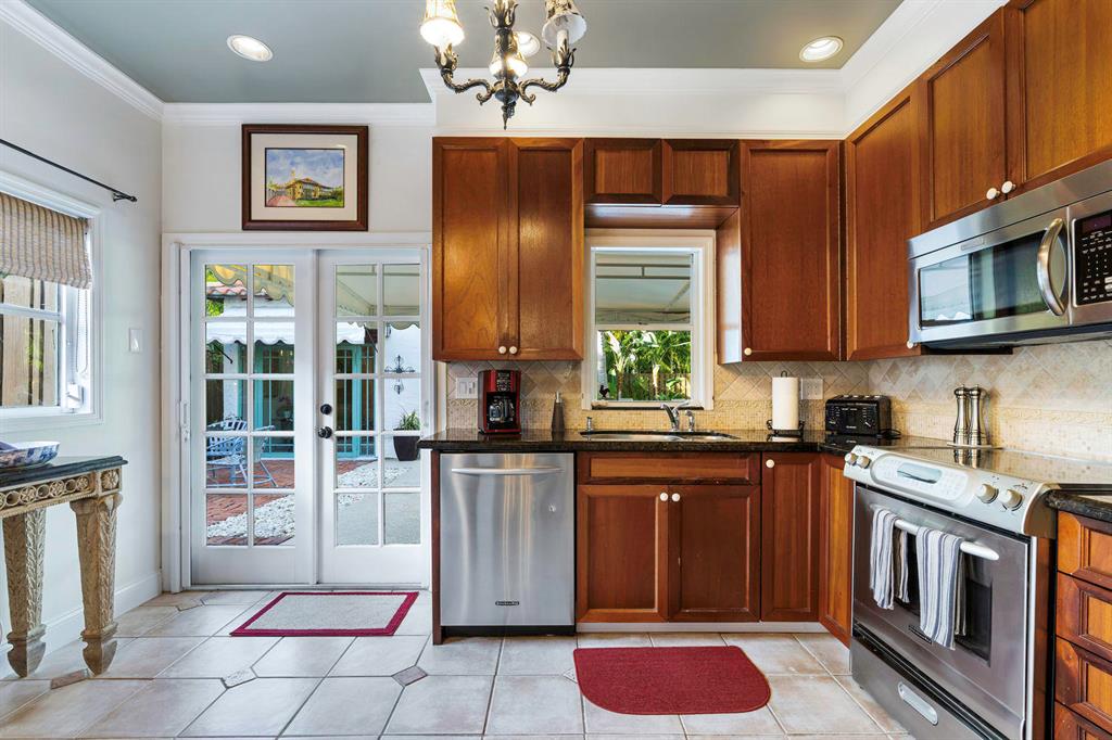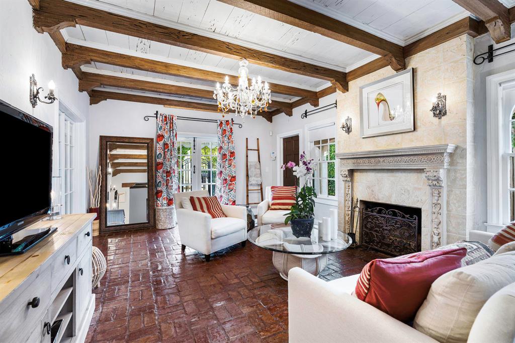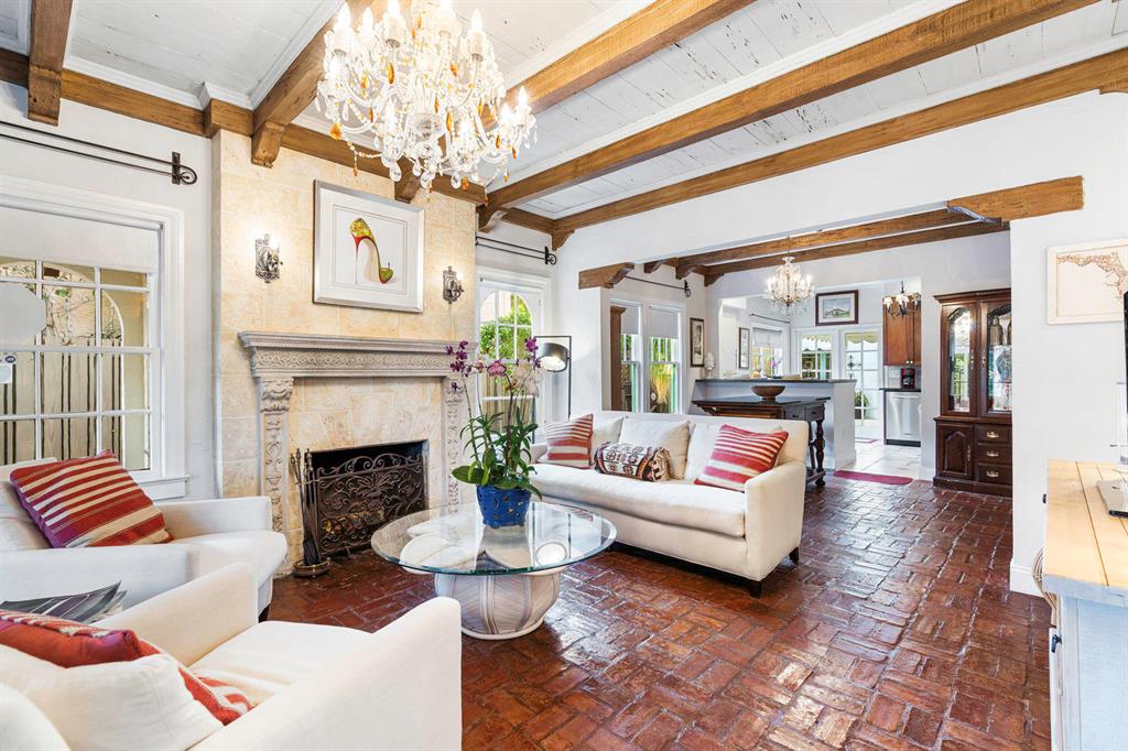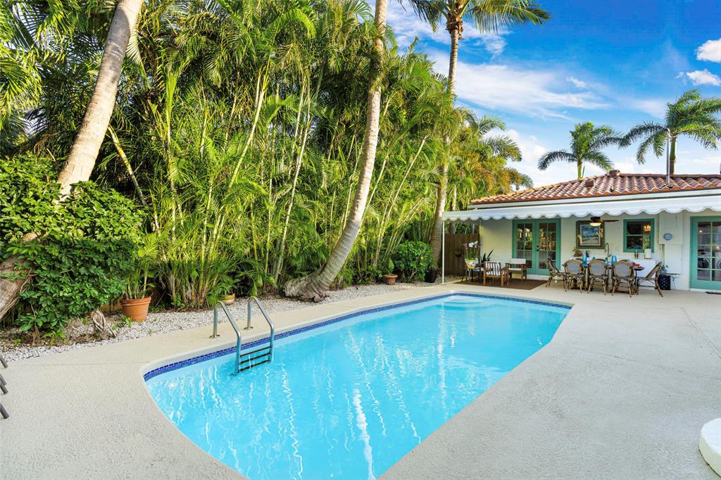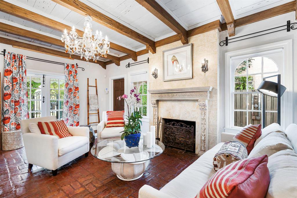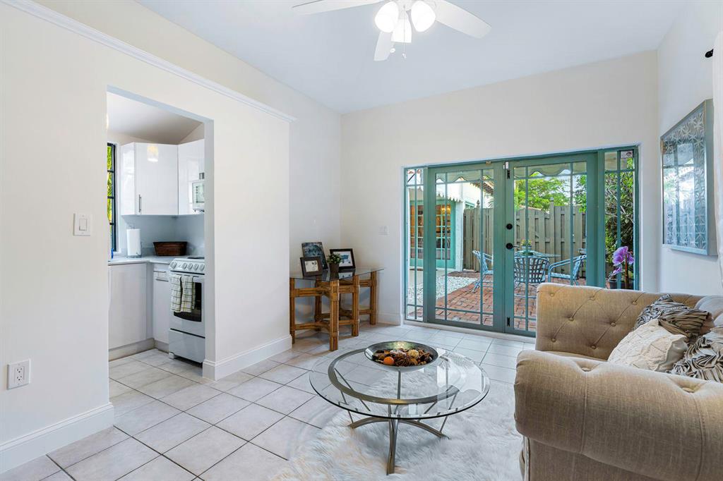 Walk to the intracoastal and Antique Row. Beautifully renovated Mizneresque Spanish Mission with a guest cottage. This home shows like a jewel box, you walk in to the formal living room with Pecky Cypress ceilings and beams, original cast stone fireplace mantel and original brick floors. The main house has 2 bedrooms, the master has a sitting room or office that opens to the living room. The kitchen has been updated and a laundry bar added with a granite top that is also a bar/counter with seats opening to the dining room. The patio is like another family room, with a wet bar, and new covered awning. The pool has been completely re-built w/LED lighting and all new equipment including an electric heater. The guest cottage is a full 1/1 with laundry and a legal rental. Lushly landscaped.
