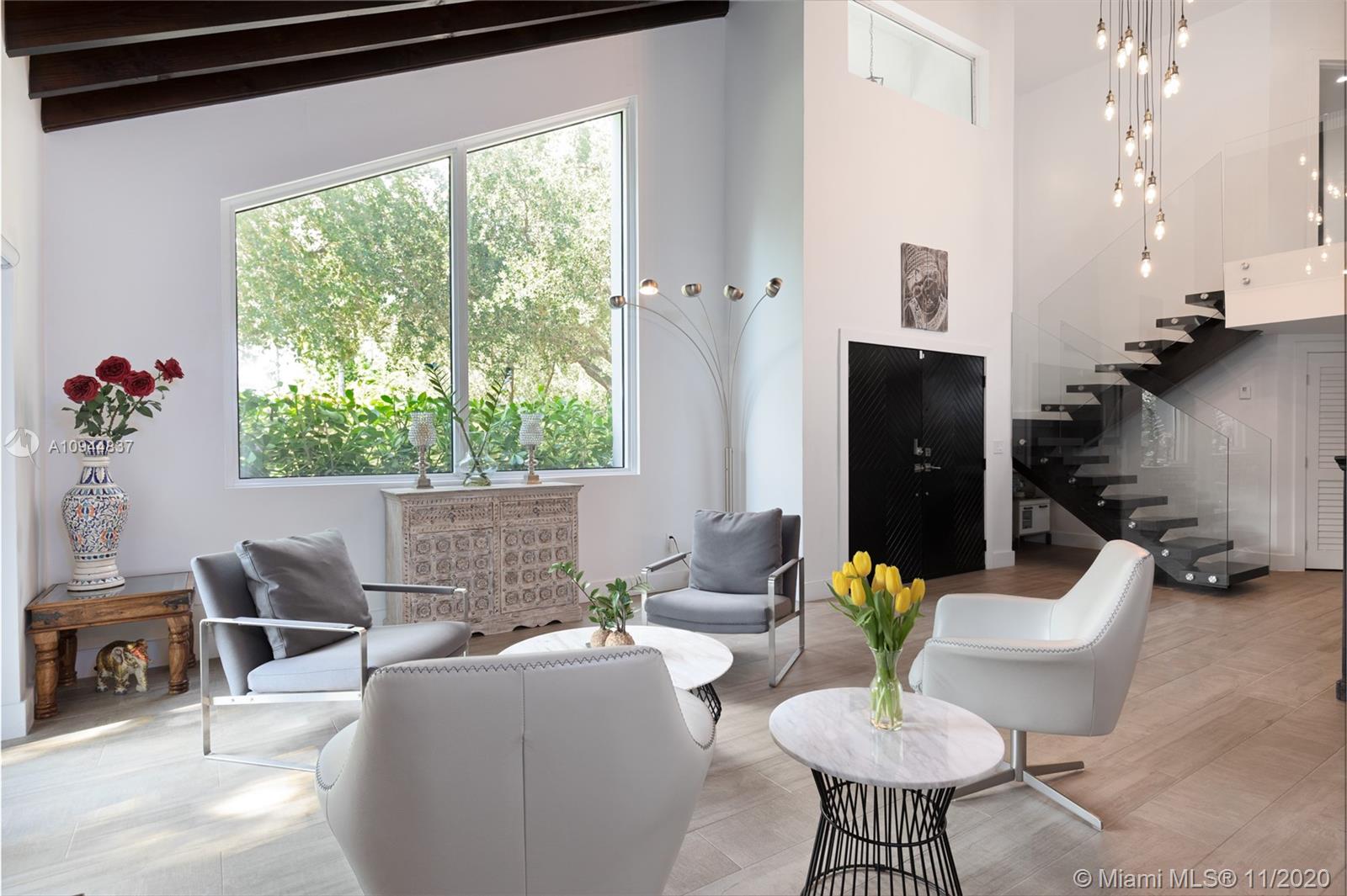 Contemporary modern style 2 story home in Coral Gables. Completely remodeled 3Beds/3full baths. Extremely high ceilings with wood beams greet you. House offers formal living and dining areas plus an open concept modern kitchen. Custom electric high-end blinds and plantation shutters. House has impact windows and doors and a one-car garage. One-bedroom plus full bathroom is on the first level. Floating contemporary stairs with glass railing lead you to the second floor where the other 2 bedrooms/2 bathrooms are located. House has lots of custom closets plus custom wall built-in extra drawers and shelves. House is located on a corner lot. 2019 Roof with a transferable warranty. AC 5 years. Minutes from Miracle Mile, shopping, restaurants, and great schools. USE SHOW ASSIST 24 HOUR NOTICE.