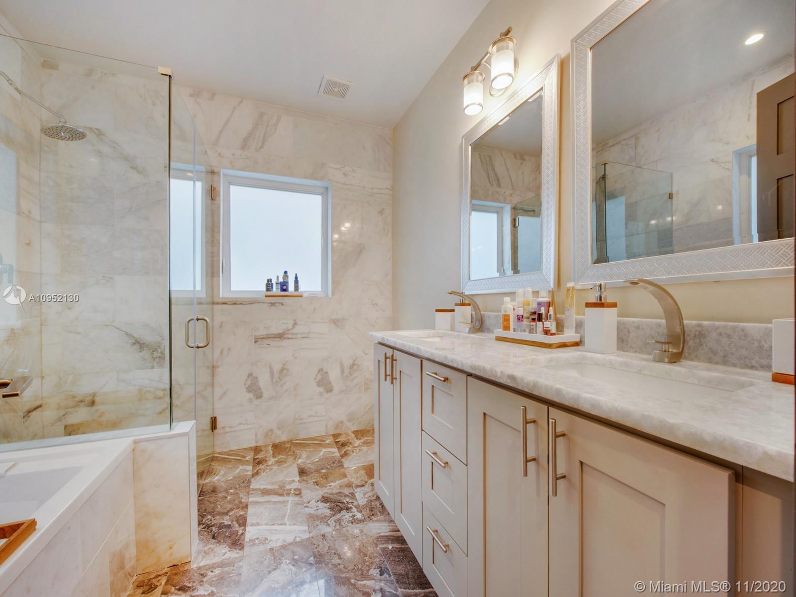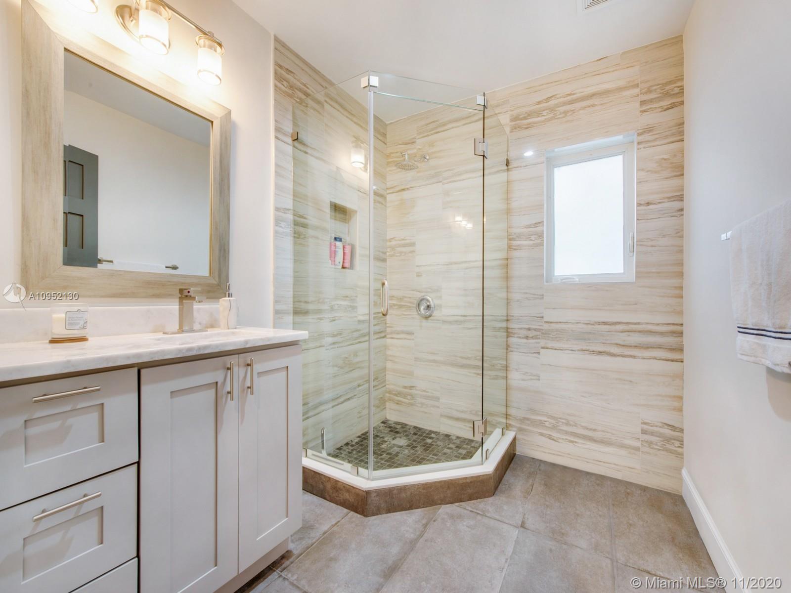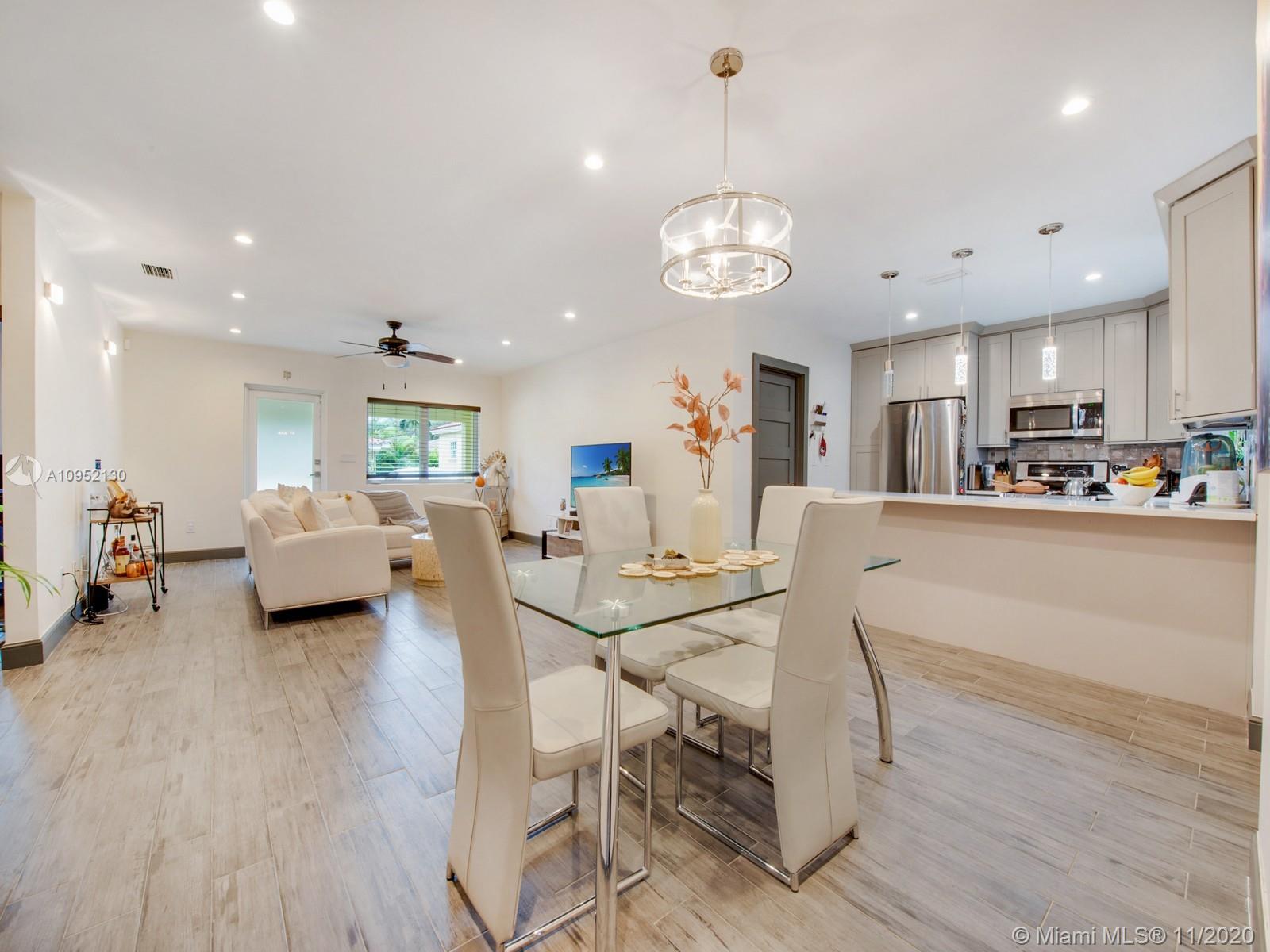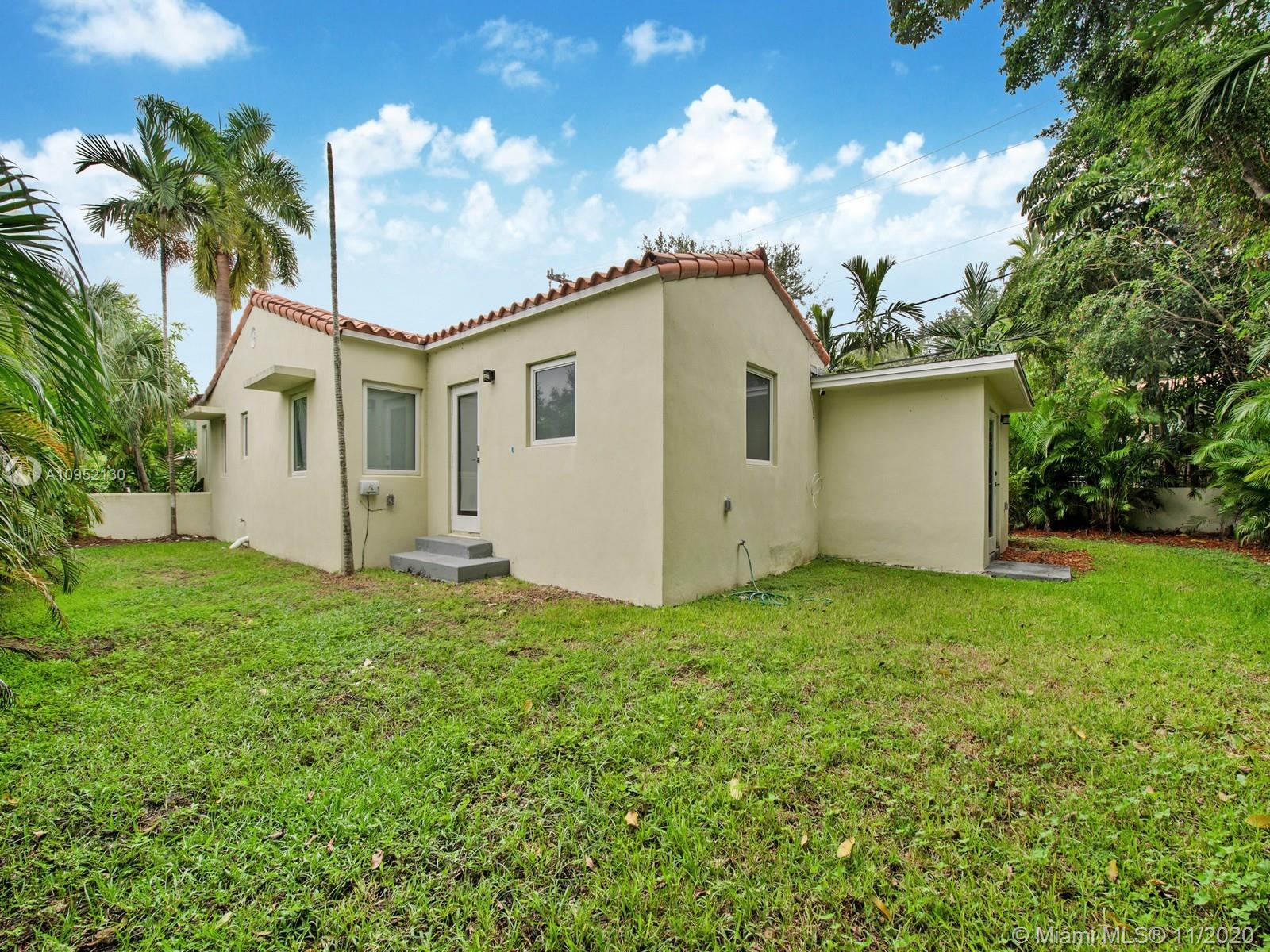 Stunning completely remodeled 3 bedrooms, 2 and a half bath home on a private dead end street with only 4 homes. Situated in centrally located North Gables neighborhood. This contemporary home features an all new luxurious open concept kitchen and great room with beautiful finishes throughout with quartz terrazzo countertops in the kitchen and laundry and marble finishes in all bathrooms. Master bathroom includes jacuzzi, separate showers, impact glass and porcelain wood floor look throughout. This home has all new electrical, plumbing, irrigation system and septic. Perfect home for discerning buyer.