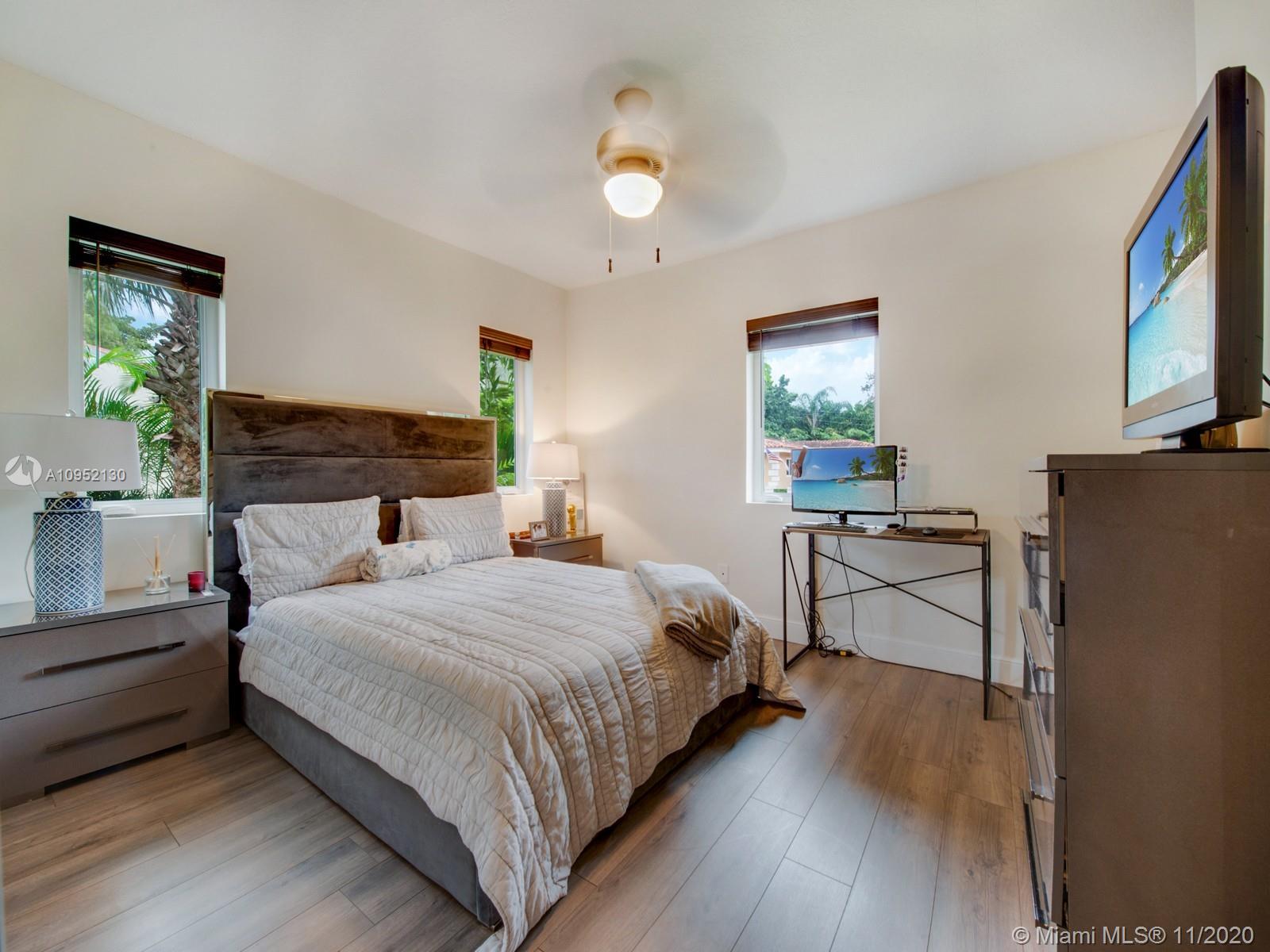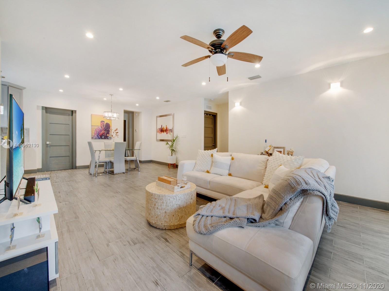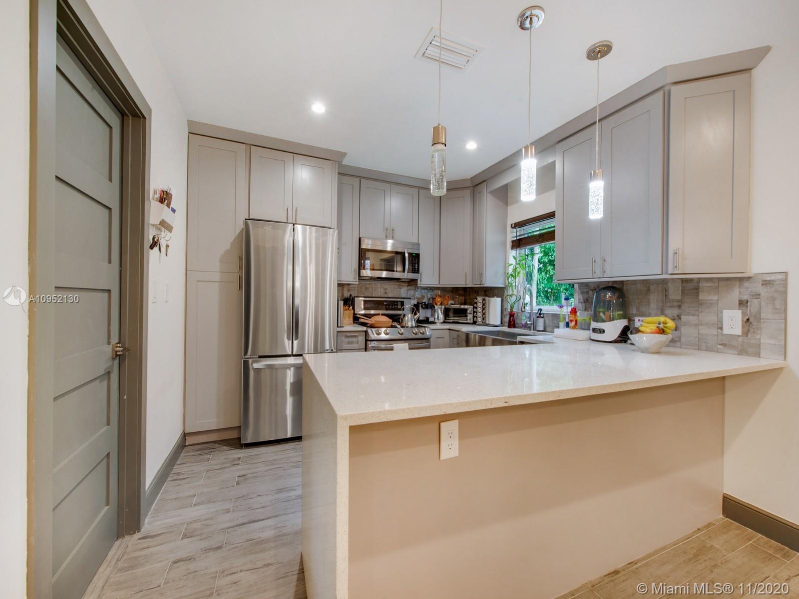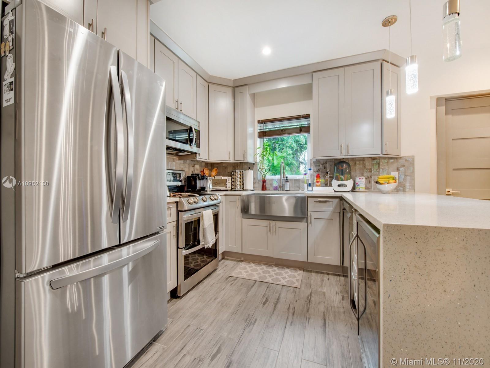 Stunning completely remodeled 3 bedrooms, 2 and a half bath home on a private dead end street with only 4 homes. Situated in centrally located North Gables neighborhood. This contemporary home features an all new luxurious open concept kitchen and great room with beautiful finishes throughout with quartz terrazzo countertops in the kitchen and laundry and marble finishes in all bathrooms. Master bathroom includes jacuzzi, separate showers, impact glass and porcelain wood floor look throughout. This home has all new electrical, plumbing, irrigation system and septic. Perfect home for discerning buyer.