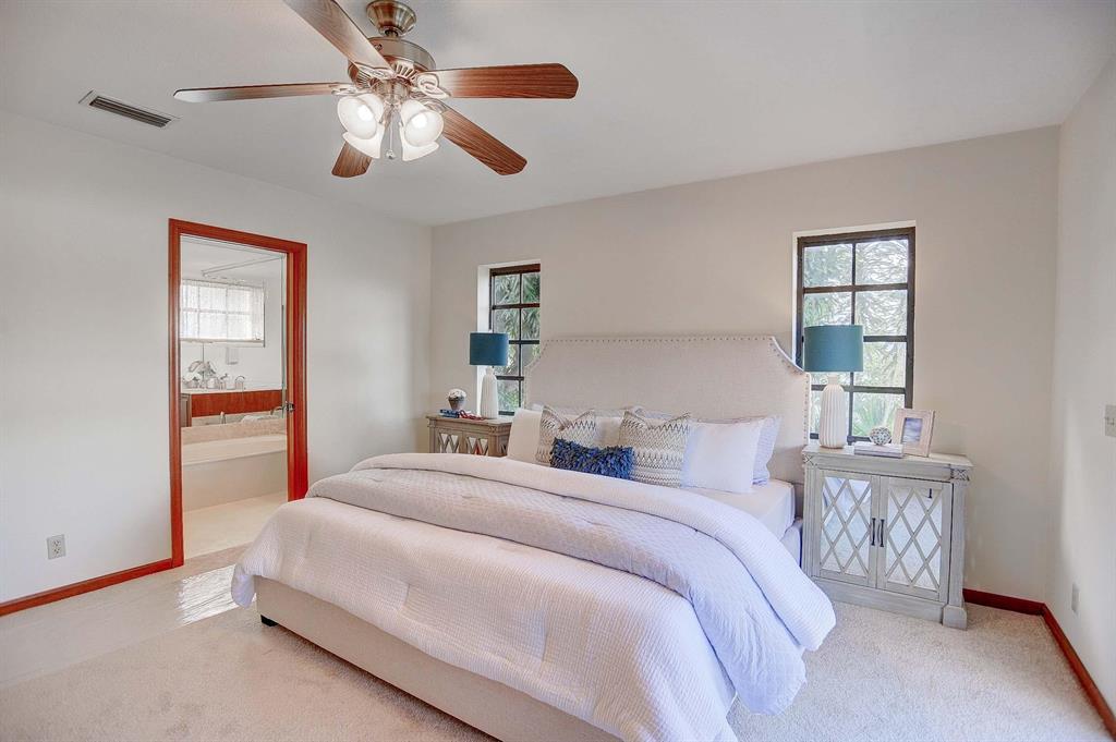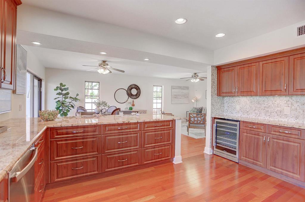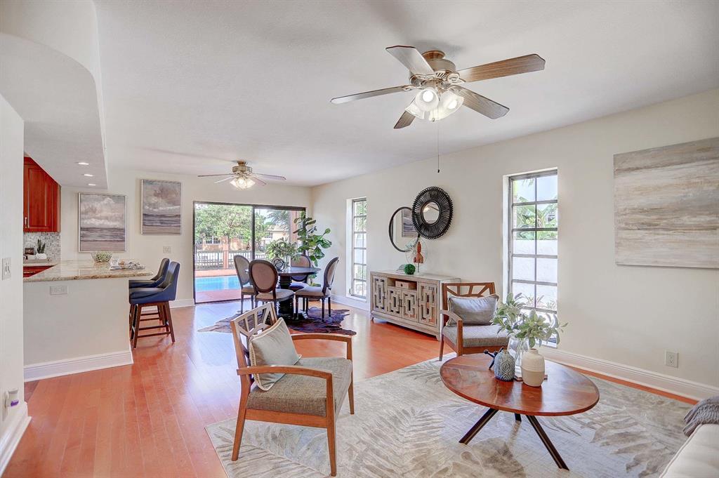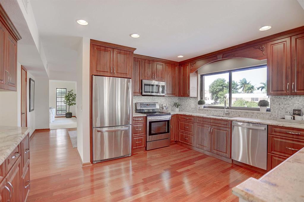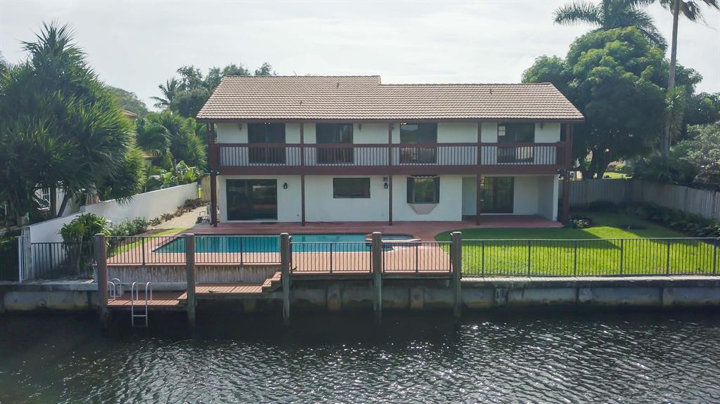 DOCK YOUR UP 40' BOAT ON THE WATER RIGHT OUTSIDE THIS BEAUTIFUL 5 BEDROOM HOME. Original owner is parting with this waterfront home situated on a cul-de-sac in the very desirable east Boca Raton community of Spanish River Gardens/Estoville. Watch boats go by as you relax or entertain with 85 feet of water frontage off the tranquil El Rio canal. The two level 20-foot dock and 20-foot evergrain composite deck complete a fenced in backyard with multiple outdoor entertainment areas including a covered patio with fan, grassy area for playing croquet and a beautiful 30-foot pool with spa. This 5 bedroom, 3 bathroom home has an open concept updated kitchen with stainless steel appliances, granite countertops and built in wine cooler, all centrally located within the family room, and dining areas