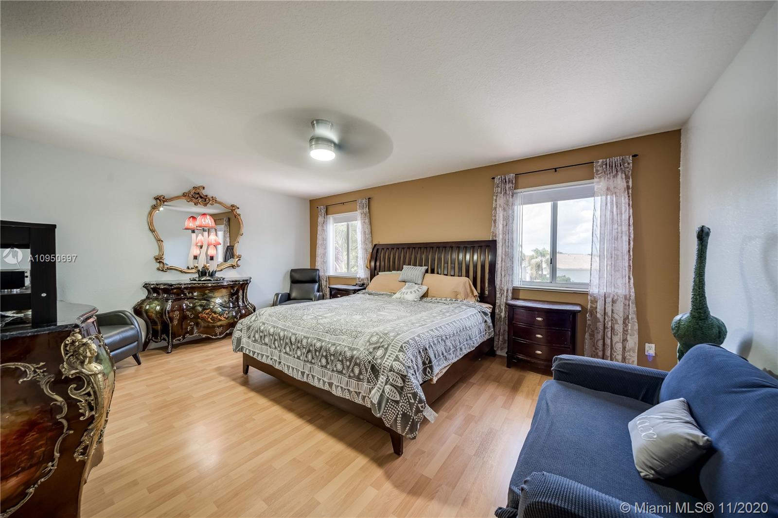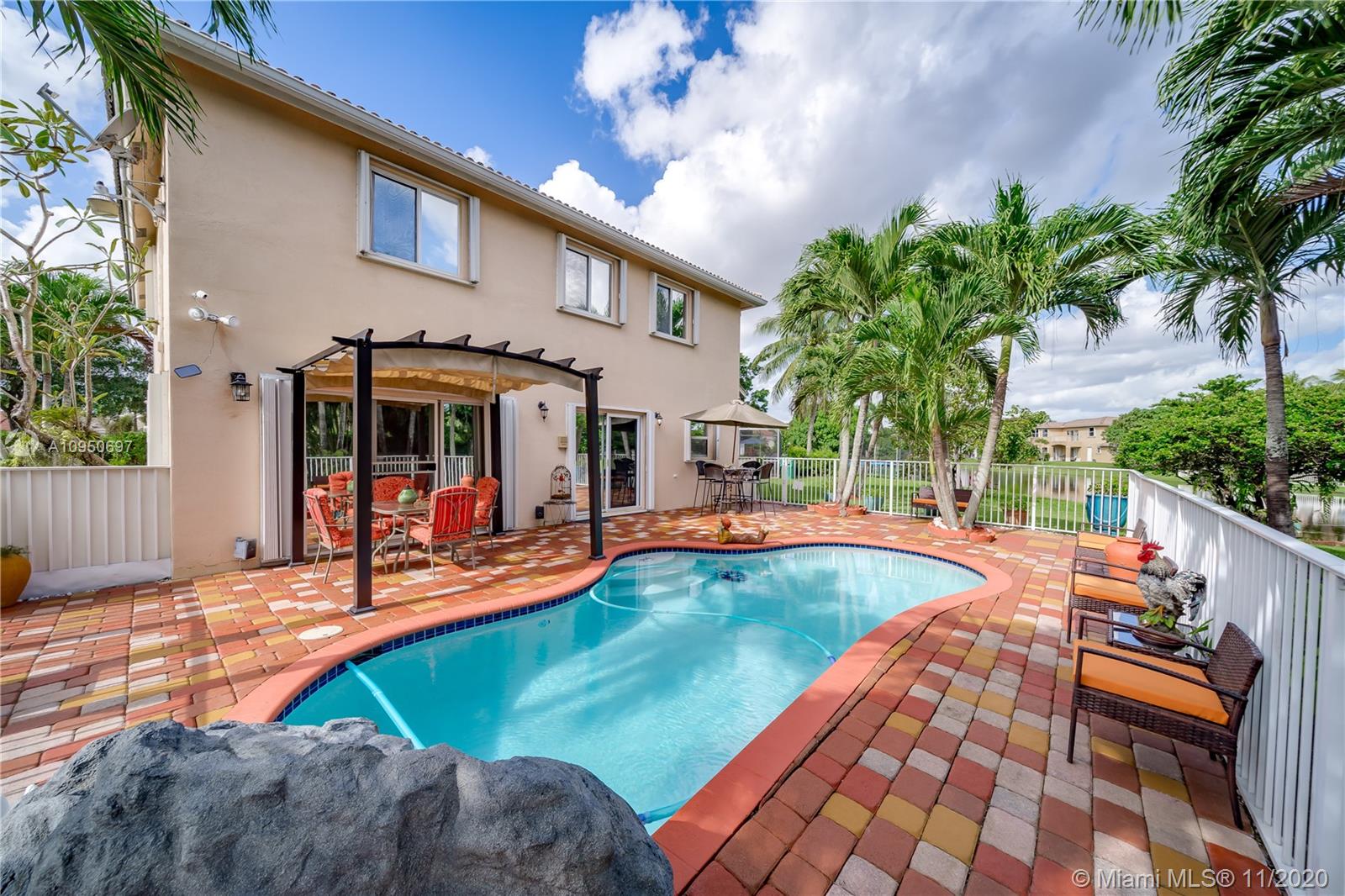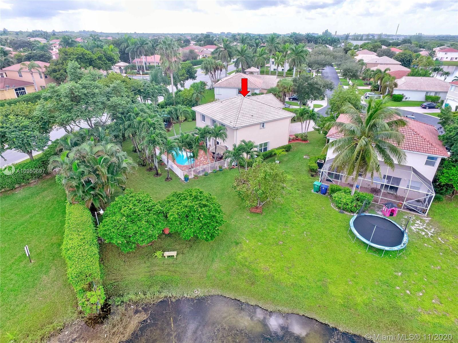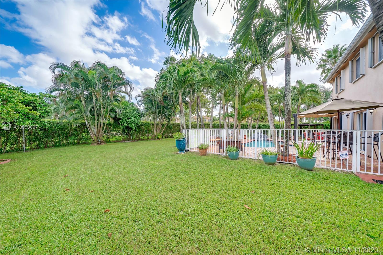 Bring your pickiest buyer to this meticulously maintained home That shows incredible pride of ownership. House sits on one of the largest lots in Monarch Lakes with plenty of green space in back and sides of house with lush landscape and a privacy hedge surrounding yard. Very private with serene pool and large fountain great for entertaining and relaxation. House features 4 bedroom with loft that can easily be a 5th bedroom. Laminate wood floors on second floor with beautiful iron railings Newer AC & Waterheater & accordion hurricane shutters on all windows.