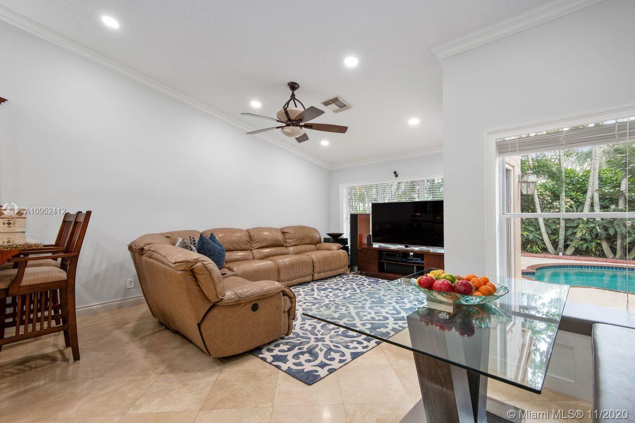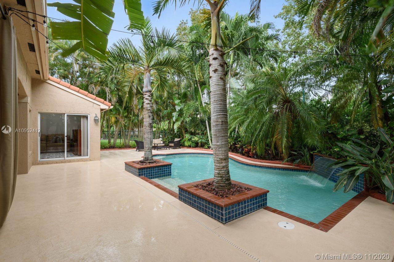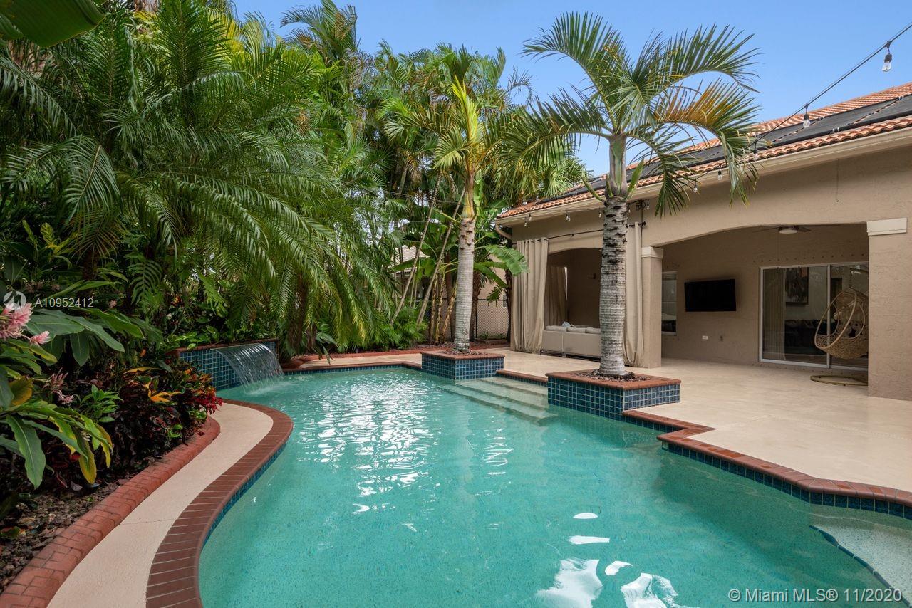 SUPER DEAL! Elegantly updated 4 bedroom, 2 ½ Bathroom pool home with a delightful backyard oasis. Open, bright and meticulously maintained. Crown moldings and recessed lighting throughout. This beautiful home also boasts spacious living areas with travertine tile on the diagonal, rich wood floors in the bedrooms, stunning volume ceilings, Roman tub, granite counters, 42” wood cabinets, quality SS appliances, covered patio, accordion hurricane shutters, exterior garden lighting, etc. Private fenced yard with exotic lush landscaping and a solar heated pool with inviting waterfall feature and new pool pump. Nest security system included. Perfect place to entertain inside and out! Desirable guard-gated community. Centrally located. Perfect place to call home!