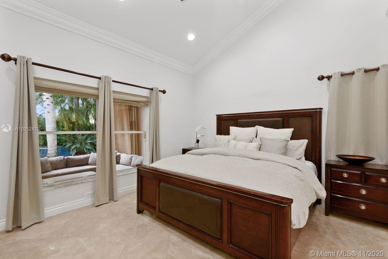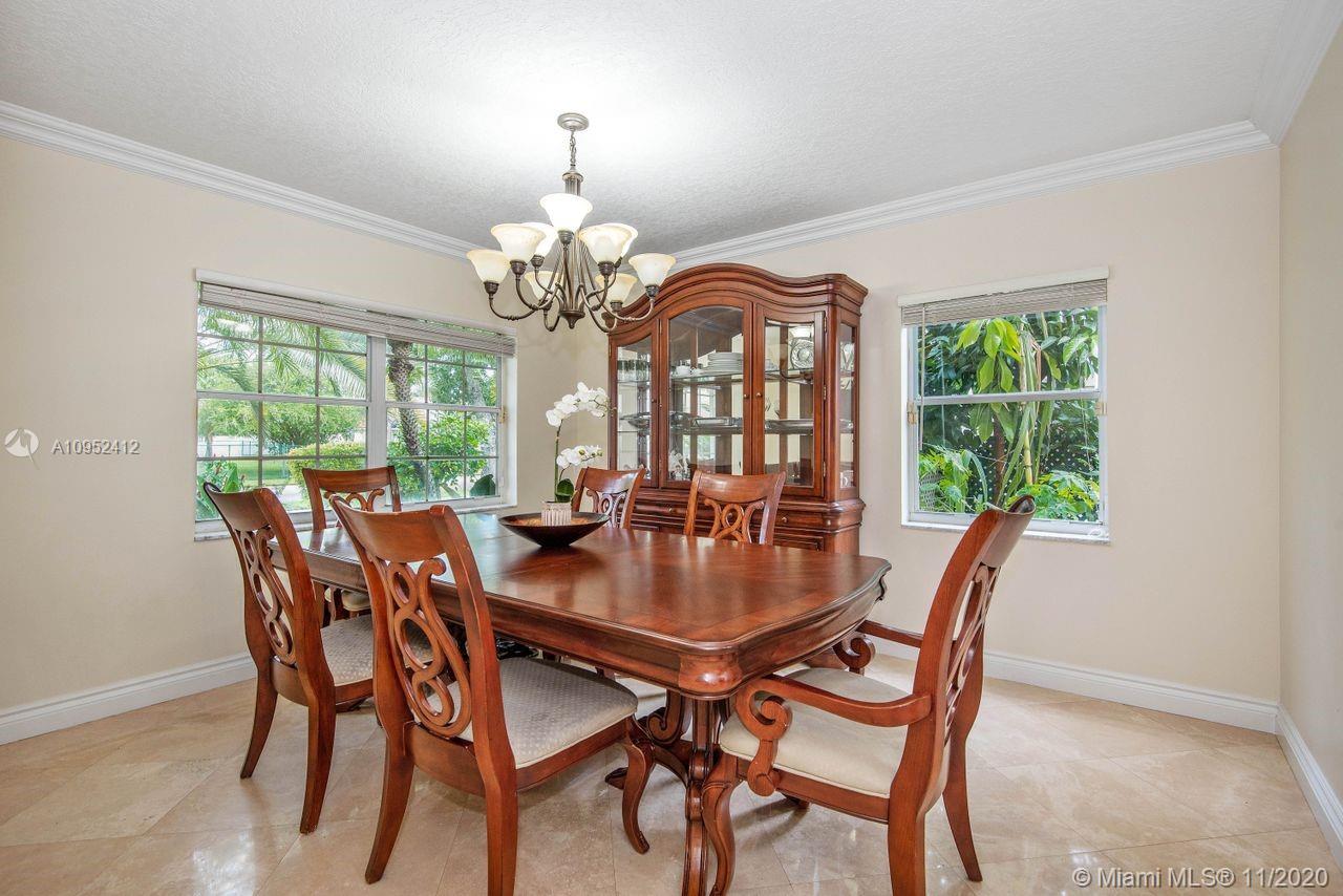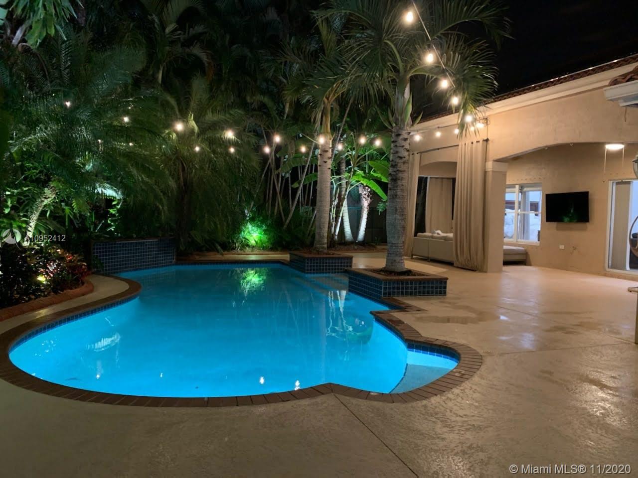 SUPER DEAL! Elegantly updated 4 bedroom, 2 ½ Bathroom pool home with a delightful backyard oasis. Open, bright and meticulously maintained. Crown moldings and recessed lighting throughout. This beautiful home also boasts spacious living areas with travertine tile on the diagonal, rich wood floors in the bedrooms, stunning volume ceilings, Roman tub, granite counters, 42” wood cabinets, quality SS appliances, covered patio, accordion hurricane shutters, exterior garden lighting, etc. Private fenced yard with exotic lush landscaping and a solar heated pool with inviting waterfall feature and new pool pump. Nest security system included. Perfect place to entertain inside and out! Desirable guard-gated community. Centrally located. Perfect place to call home!