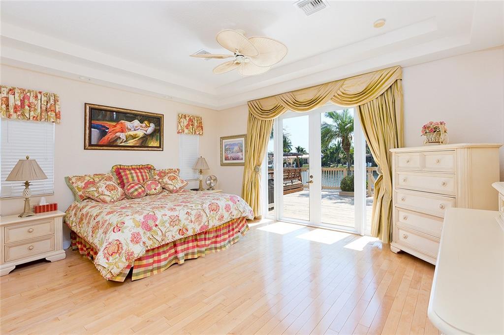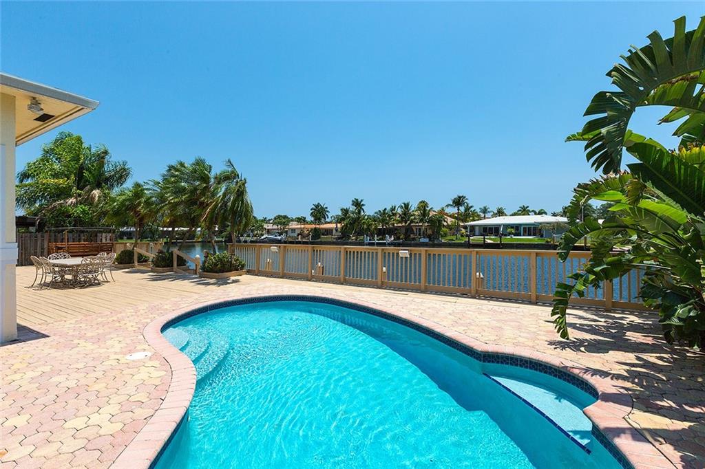 This spacious wide view waterfront home with one 11.5ft fixed bridge. Open floor plan, family and living spaces, center Chef's kitchen and formal dining area. Walls of sliding doors open to large terrace 50'x19' deck and heated pool. Quiet neighborhood, beautiful views and a lot of privacy. The full-service dock below measures 62'x 8'. Split floor plan offers a private master suite and access to terrace while the two guest bedrooms share a hall bath one enjoying it's own covered patio with waterway views. Well-landscaped with a circular driveway. Only blocks to shopping & cafes. Fifteen minute walk to the beach, close to all amenities. No association fees.