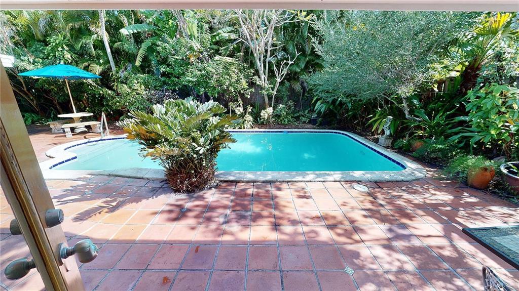 3/2 pool home, one car garage. Lushly landscaped, private backyard. Backyard has many fruit trees including mango, starfruit, banana, and more. Cute courtyard just off the front entryway. Split bedrooms with master to the right and guest bedrooms to the left. Master bedroom has a sitting area/den off of it, accessible to the pool/backyard. Master has large walk in closet. Guest bath recently updated. Large kitchen with tons of space and newer appliances. Bedroom floors just replaced, roof was replaced in 2018, electrical panel updated in 2016, pool refinished in 2019. Huge utility room with washer, dryer, laundry sink. Sprinkler system which runs off a well. House has some impact windows and the rest have shutters. Huge mailbox for Amazon package lovers! Excellent location.