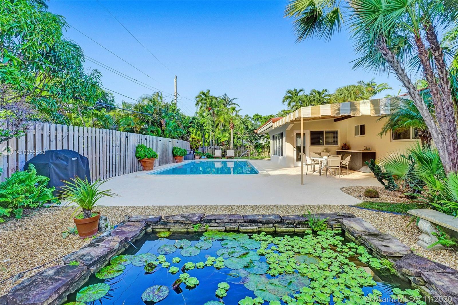 Margaritaville meets Coral Ridge!  One of the best tree lined streets as you drive up to a lush landscaped curb appeal with a circular driveway defining ultimate charm and character! Meticulously cared and impeccably clean. 10,000 sq ft lot provides perfect amount of oasis space. 2 Koi ponds next to the large pool take the stress out of the hustle in your backyard to enjoy entertaining! Interior open floor plan! 2 new sewer connections (one for kitchen/laundry, one for bathrooms), newer 18-SEER high efficiency HVAC and all ducts replaced, added air to office/garage, new expandable and generator ready electric panel, parquet floors throughout and crown molding, hurricane windows and doors, new pool filter and pool pump motor, 2020 exterior paint. BAYVIEW SCHOOL DISTRICT.